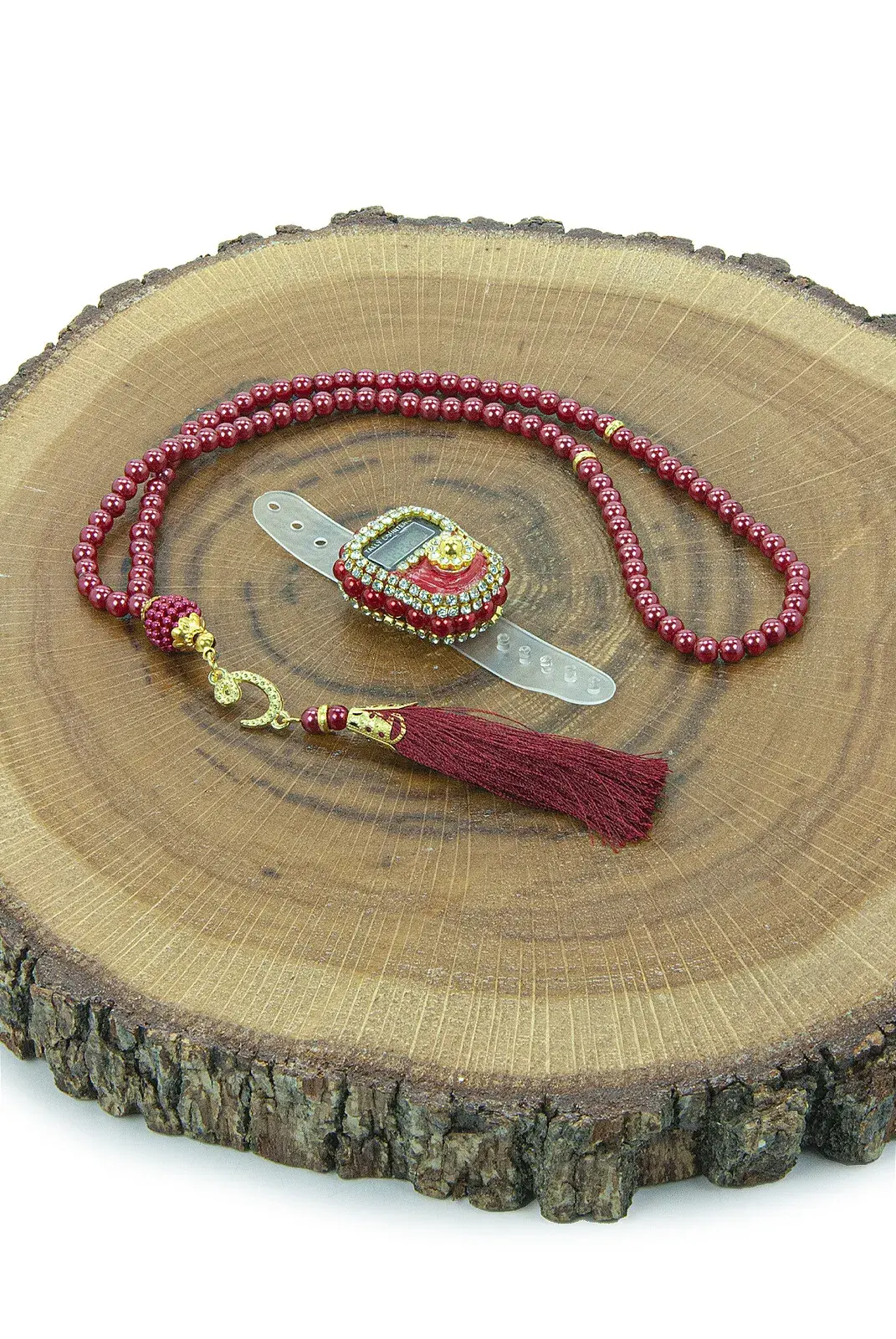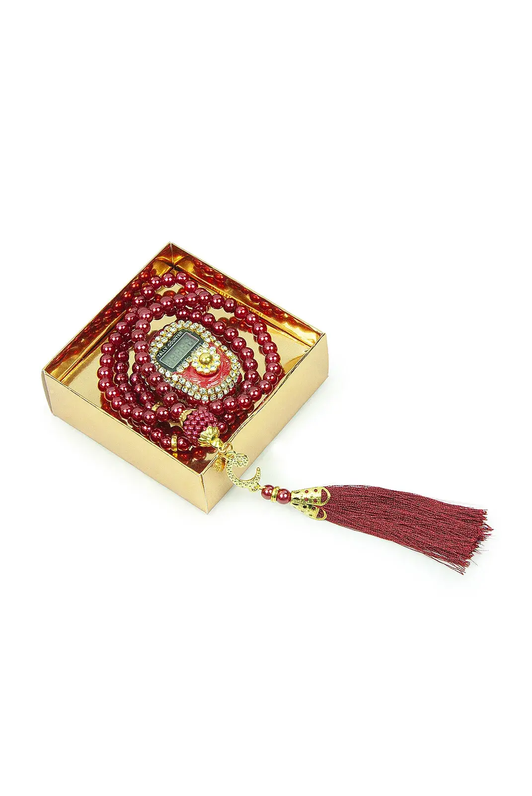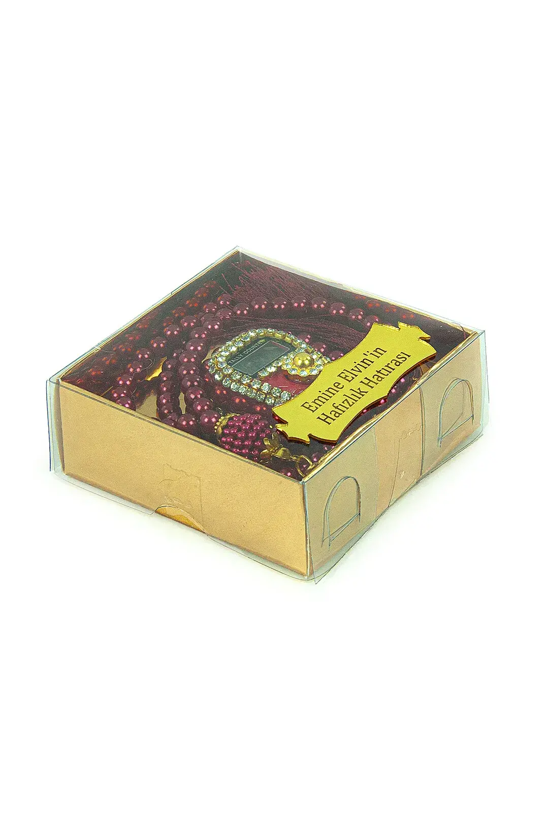 İsme Özel Kutulu İnci Tesbihli Taşlı Zikirmatik Mevlüt Hediyesi Kırmızı
