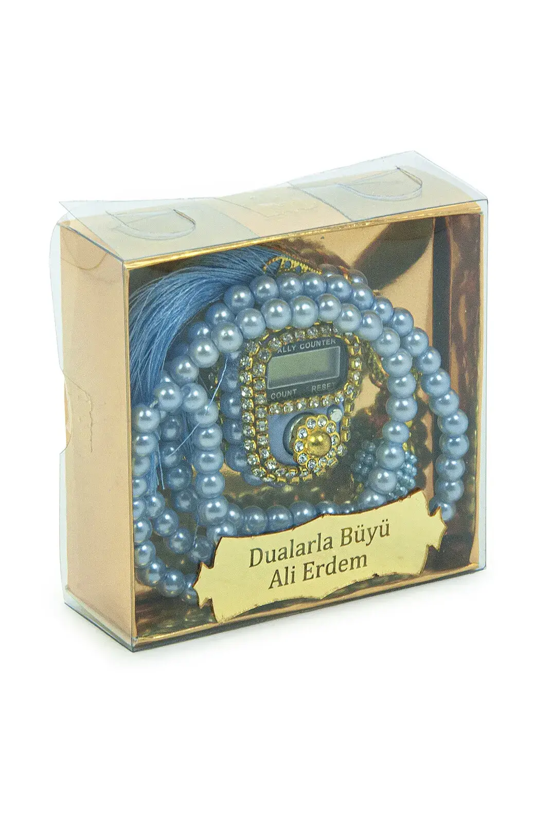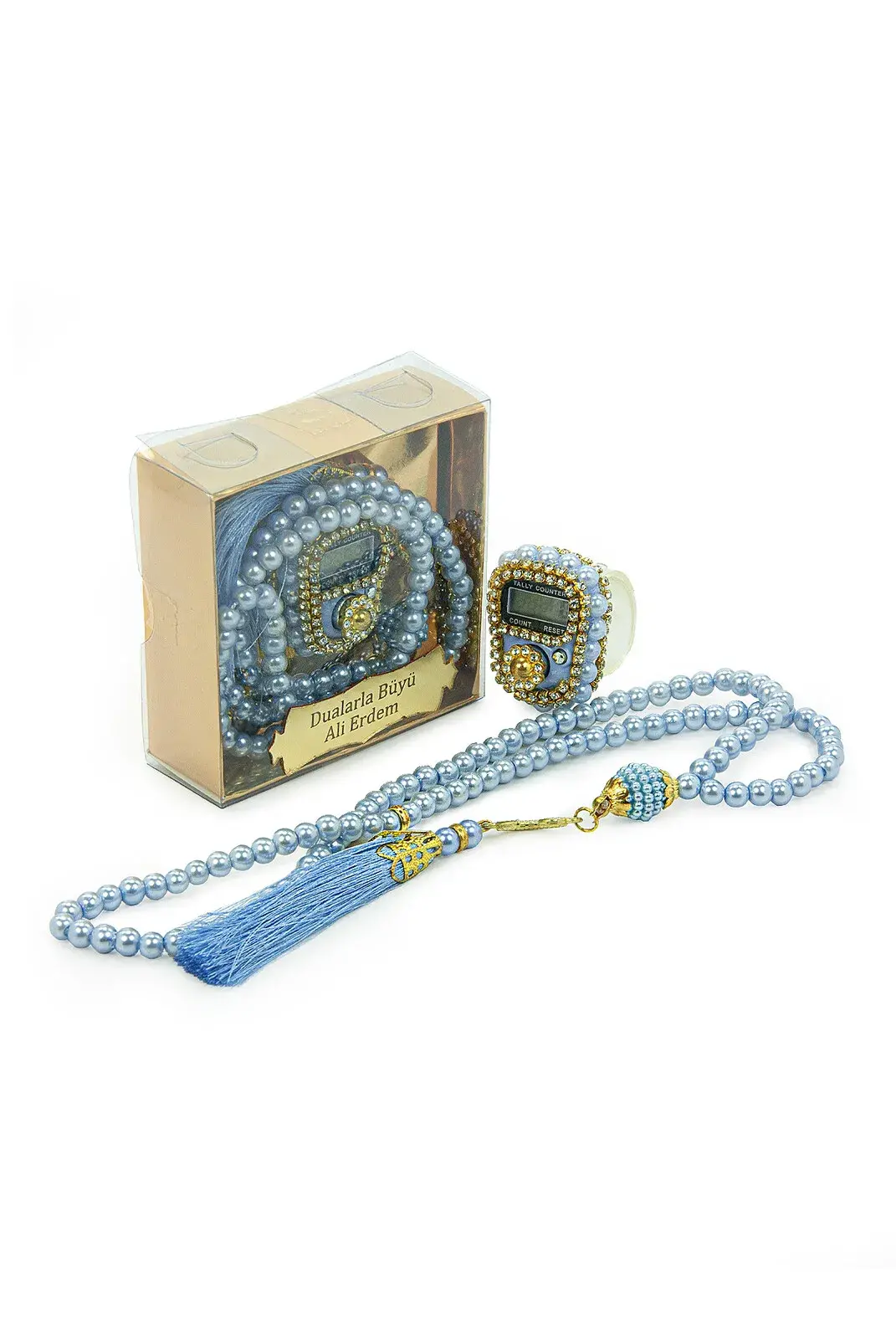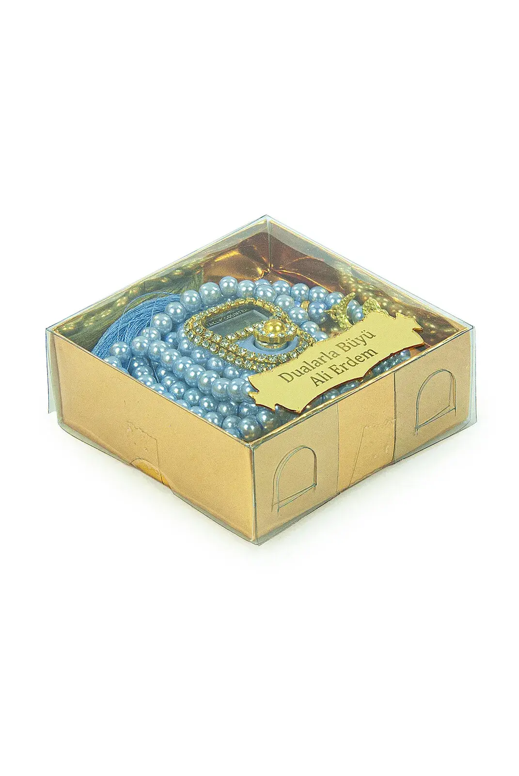 İsme Özel Kutulu İnci Tesbihli Taşlı Zikirmatik Mevlüt Hediyesi Mavi