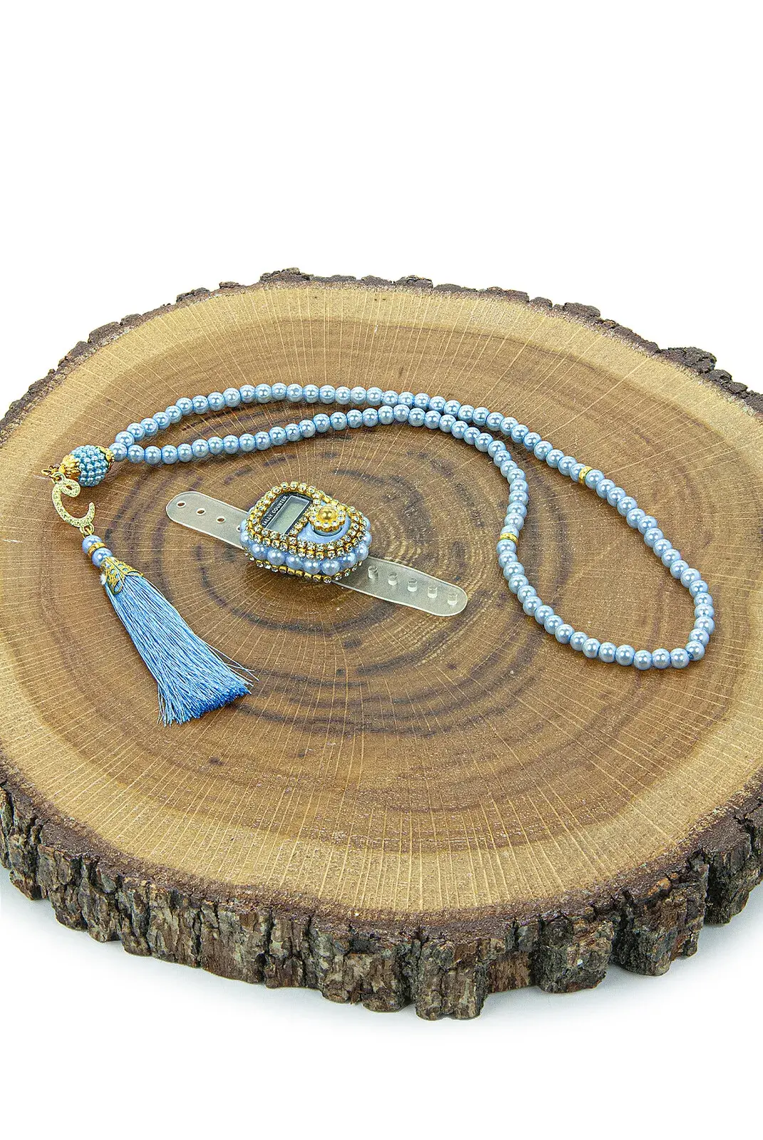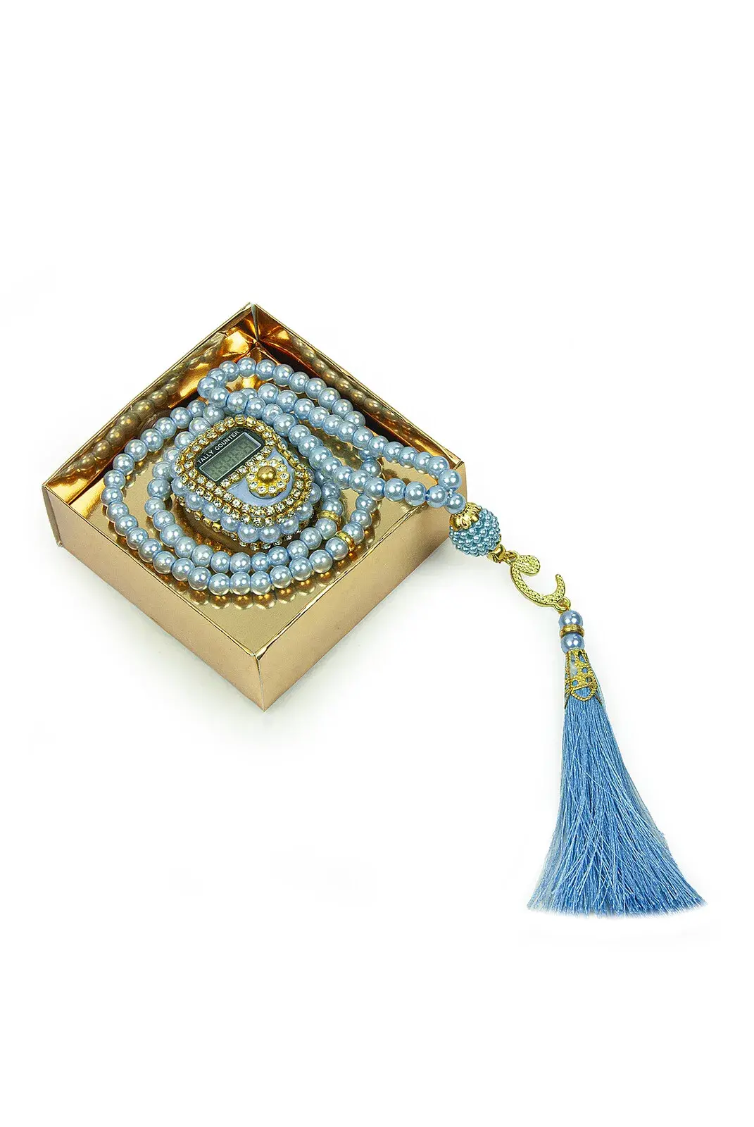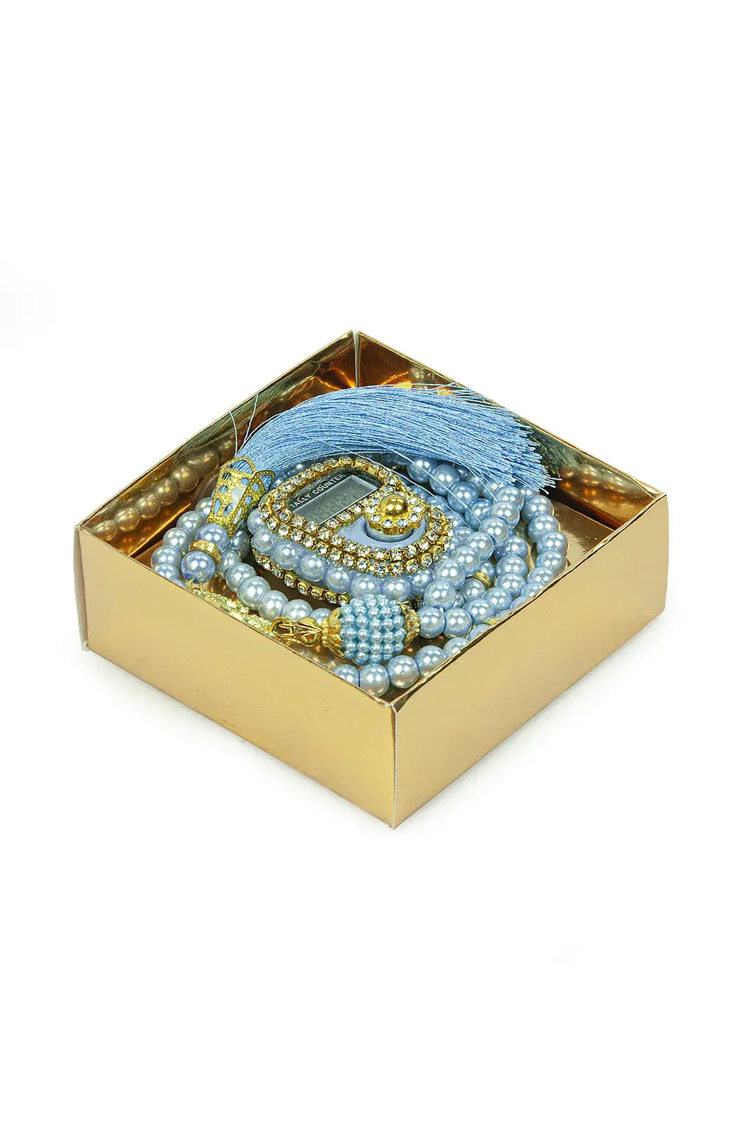 İsme Özel Kutulu İnci Tesbihli Taşlı Zikirmatik Mevlüt Hediyesi Mavi