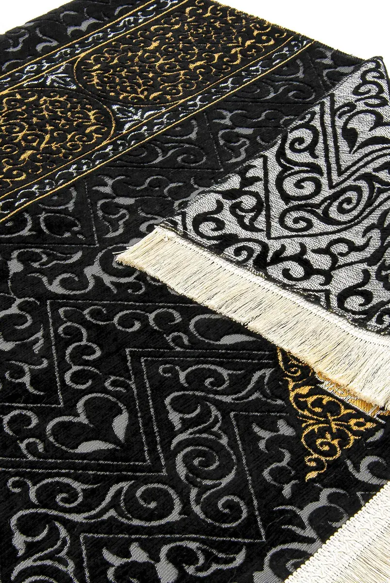 Inspired by the cover of the Kaaba, it is a prayer rug named Kaaba Cover, specially produced to breathe the spiritual air and bring those sacred places to our minds.