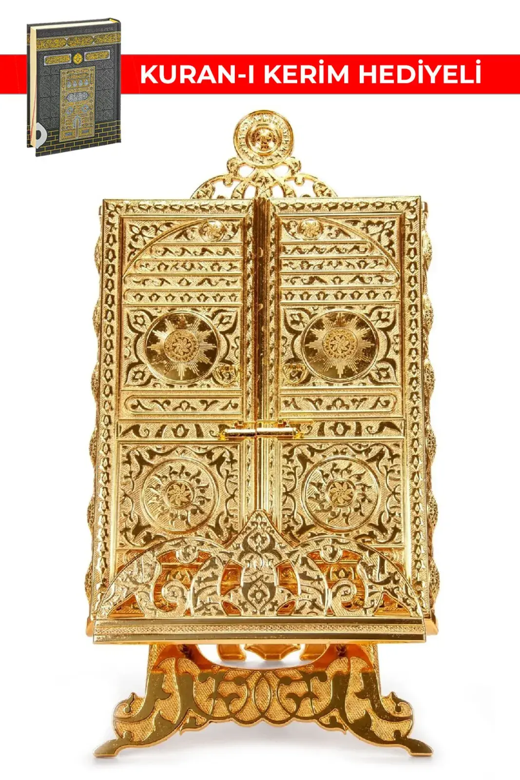 Gold Color Quran Box with Kaaba Door Pattern with Quran Gift It is 28x21 Cm in size Open height 41 cm Suitable for Medium Quran (17x24 cm) It is in Kaaba Gate Pattern Kaaba Patterned Quran Gift Gold Color Metal Zircon Weight 3 kg