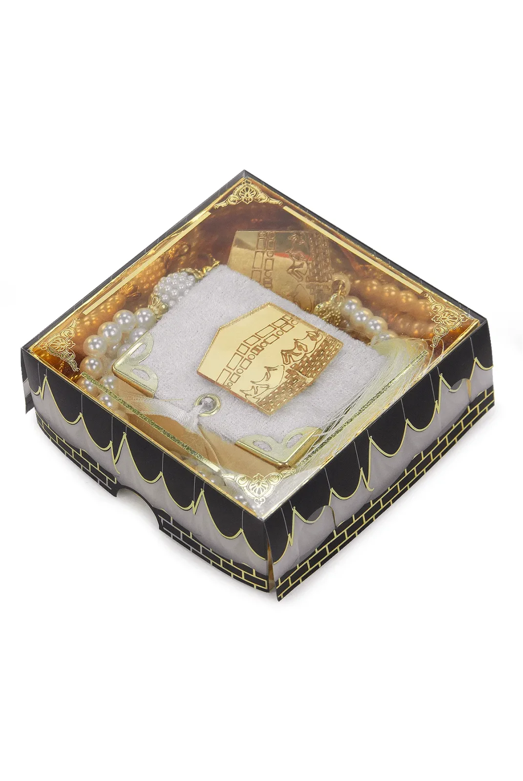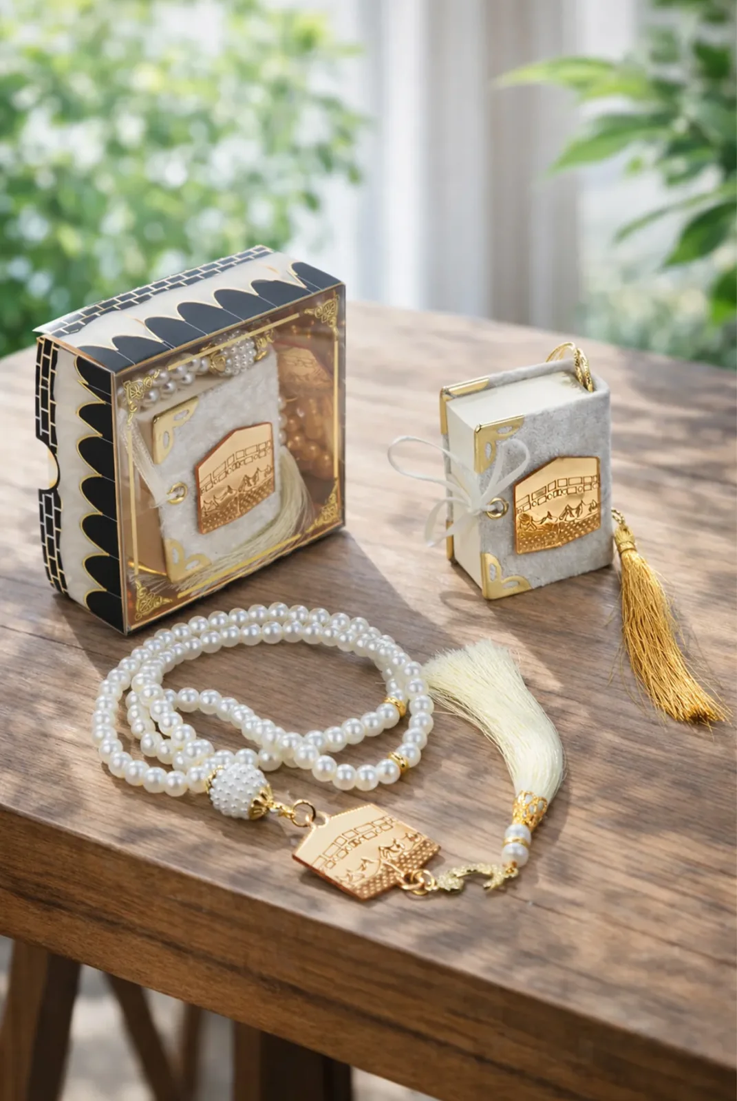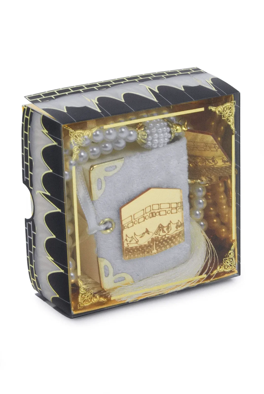Şık beyaz renkli, Kâbe desenli pleksi süslemeli kutusu sayesinde son derece gösterişli bir sunuma sahiptir. İçerisindeki kadife kaplı mini Kur’an-ı Kerim ve inci görünümlü tesbih, seti daha değerli ve anlamlı kılar. Özellikle mevlüt, doğum, adak, hac-umre dönüşü veya özel dini günlerde hediye olarak tercih edilebilir.