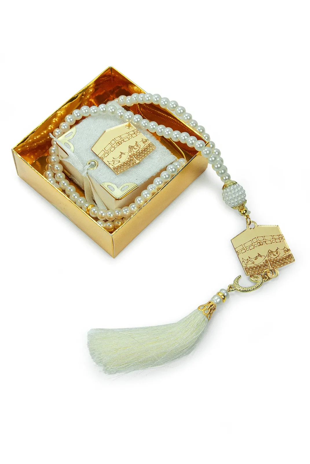 Kabe Desen Kutulu Pleksili İnci Tesbihli Kadife Kaplı Mini Kur’an Mevlüt Hediyesi – Beyaz