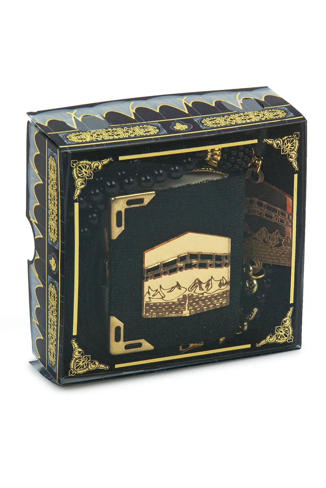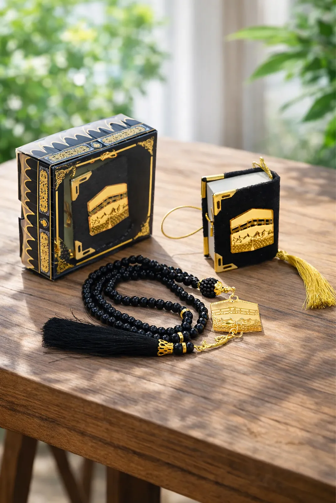Şık siyah renkli, Kâbe desenli pleksi süslemeli kutusu sayesinde son derece gösterişli bir sunuma sahiptir. İçerisindeki kadife kaplı mini Kur’an-ı Kerim ve inci görünümlü tesbih, seti daha değerli ve anlamlı kılar. Özellikle mevlüt, doğum, adak, hac-umre dönüşü veya özel dini günlerde hediye olarak tercih edilebilir.