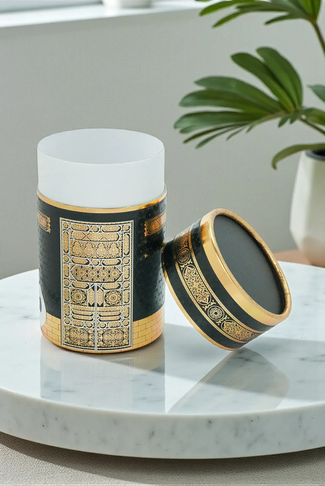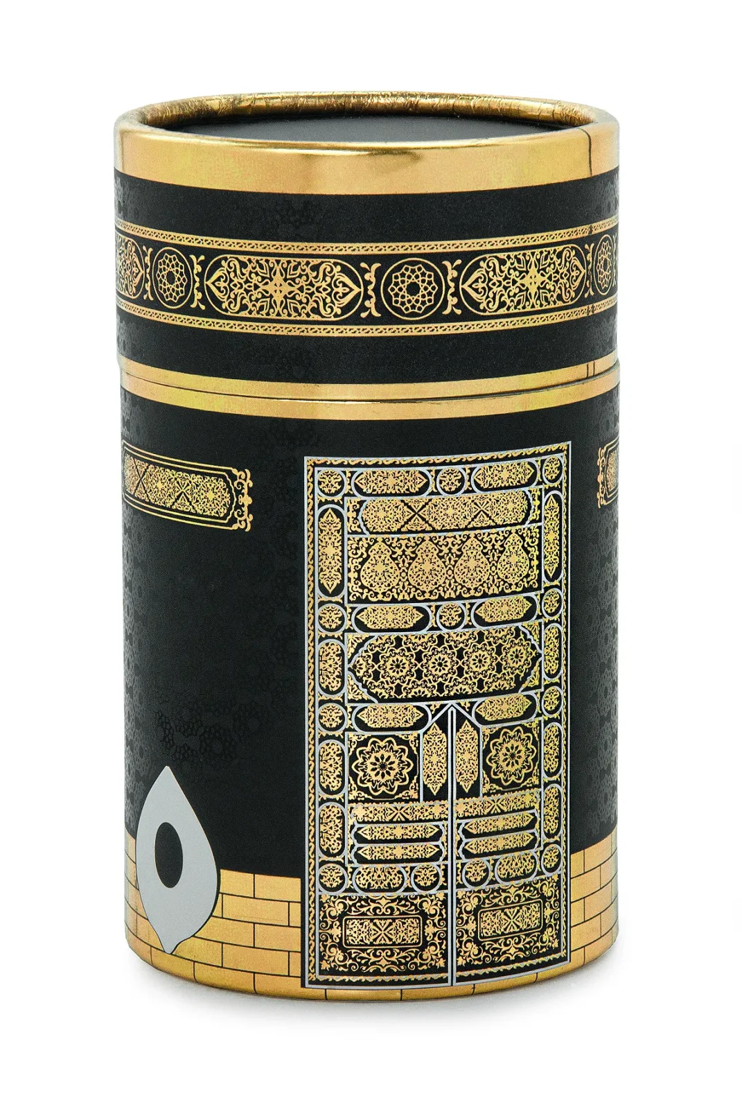 Kâbe’nin zarif detaylarından ilham alınarak tasarlanan Kâbe Desenli Silindir Kutu – Siyah, manevi değeri yüksek hediyeler ve özel sunumlar için şık bir alternatiftir. Siyah zemin üzerindeki gold Kâbe kapısı ve İslami motifler, ürüne asil ve dikkat çekici bir görünüm kazandırır.
