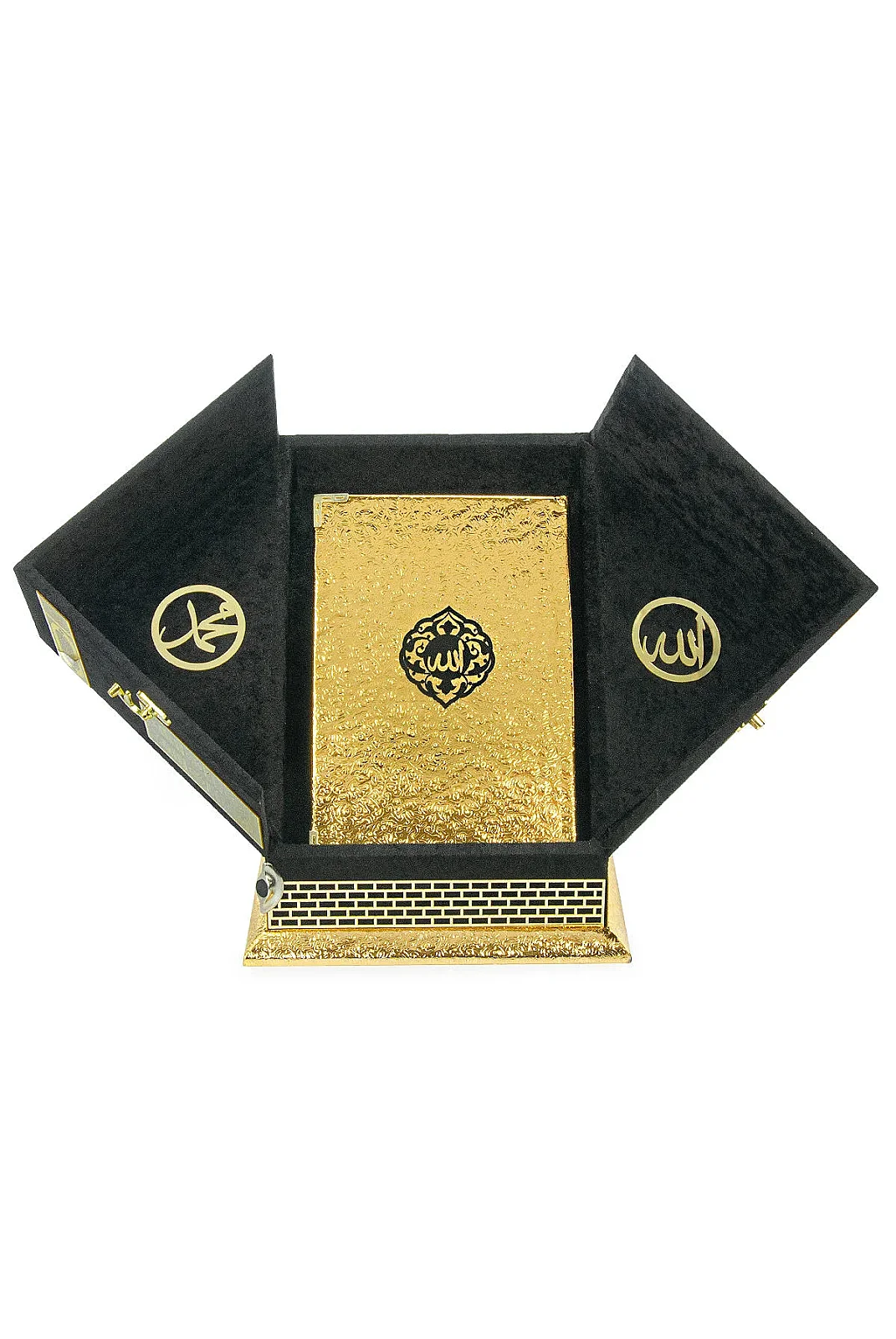 Özel tasarımlı Kabe formundaki kutusu ile sunulan bu Gold Kur’an-ı Kerim Seti, hem anlamlı hem de dikkat çekici bir hediyelik alternatiftir. Estetik görünümü ve detaylı işçiliği ile öne çıkan bu set, özel günlerde sevdiklerinize sunabileceğiniz değerli bir üründür.
