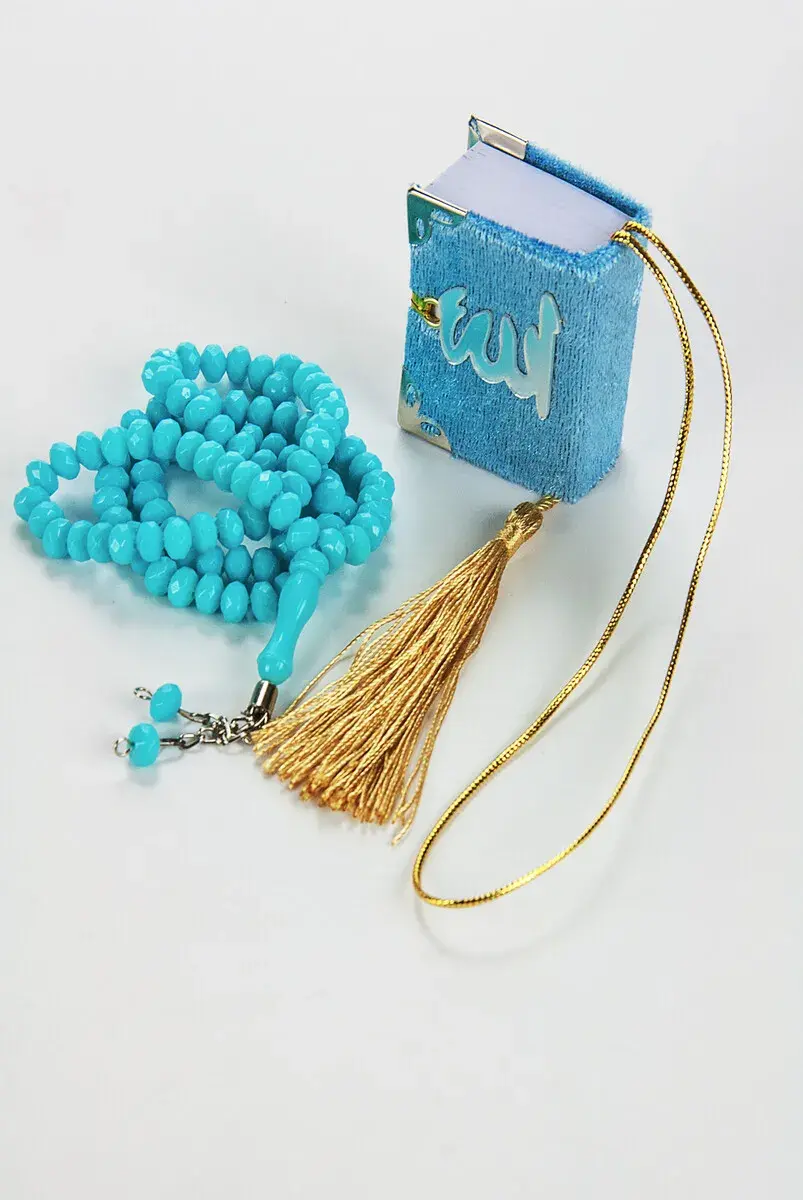 Kadife Kaplı Mini Kuran Kutulu - Tesbihli - Pleksili - Mavi