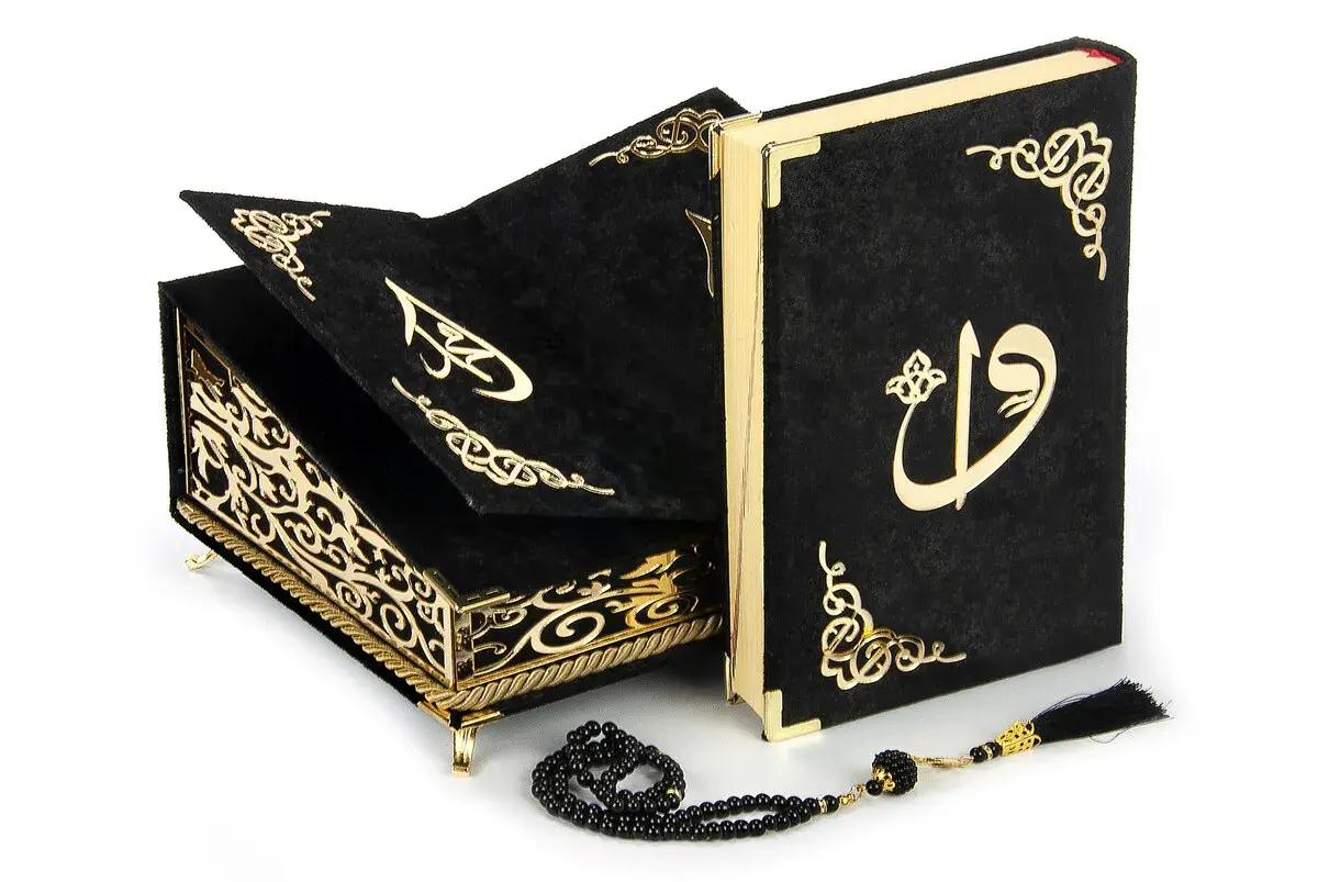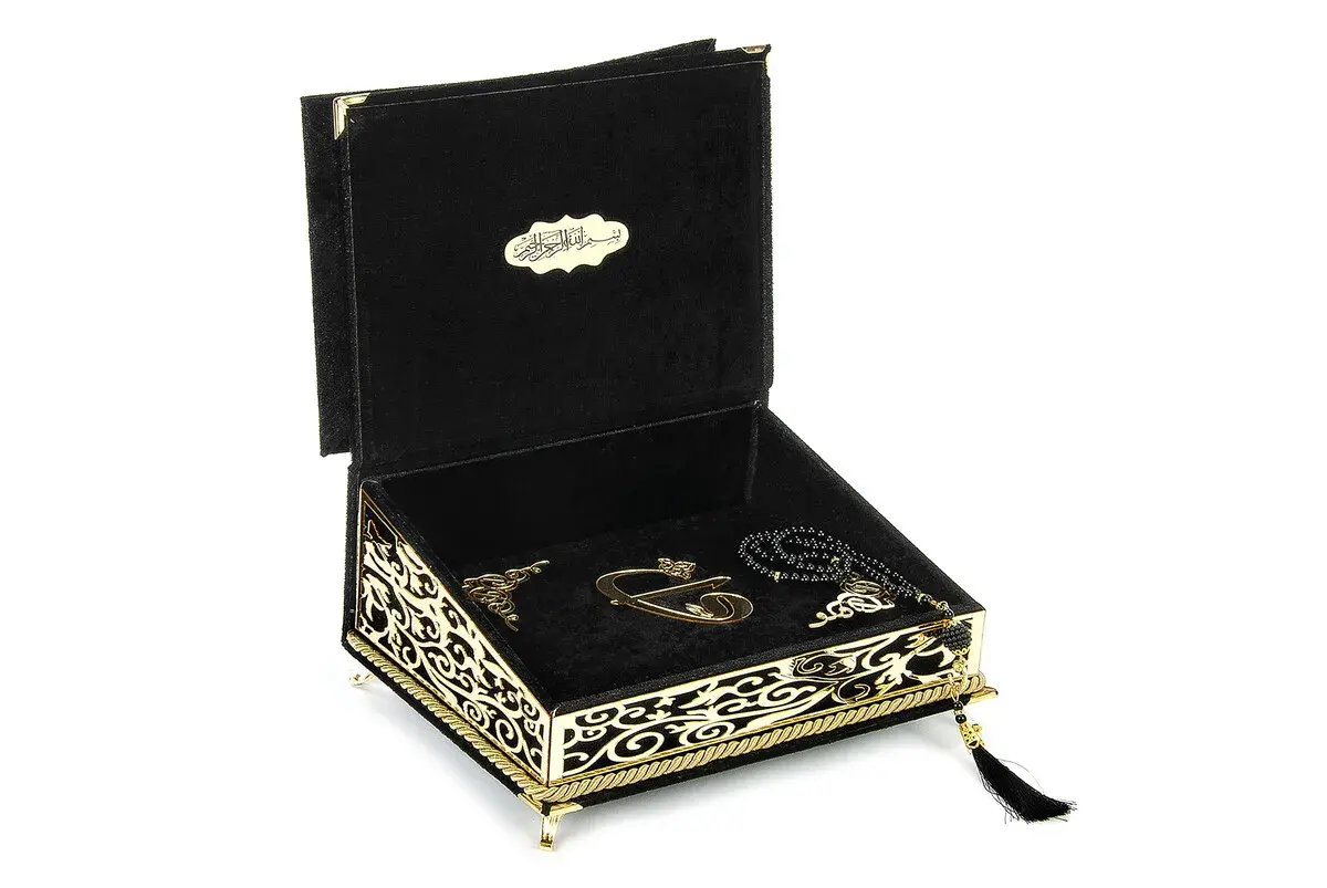 Sandık Ve Kuranı Kerim Aynı Renk Kadife Kumaş İle Kaplı olup Üzeri islami,osmanlı,arapça Allah ve Muhammed Lafızları Elif Vav İle Süsleniştir