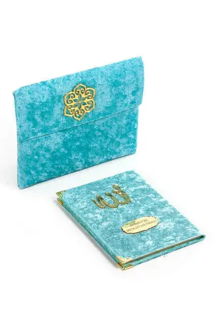 Kadife Kaplı Yasin Kitabı - Çanta Boy - İsme Özel Plakalı - Keseli - Mavi Renk - Dini Hediyelik