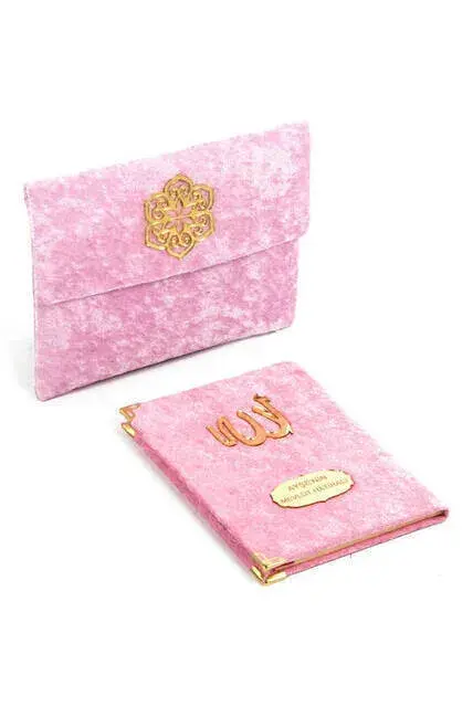 Kadife Kaplı Yasin Kitabı - Çanta Boy - İsme Özel Plakalı - Keseli - Pembe Renk - Dini Hediyelik