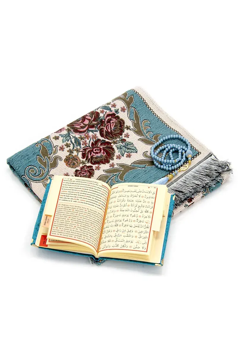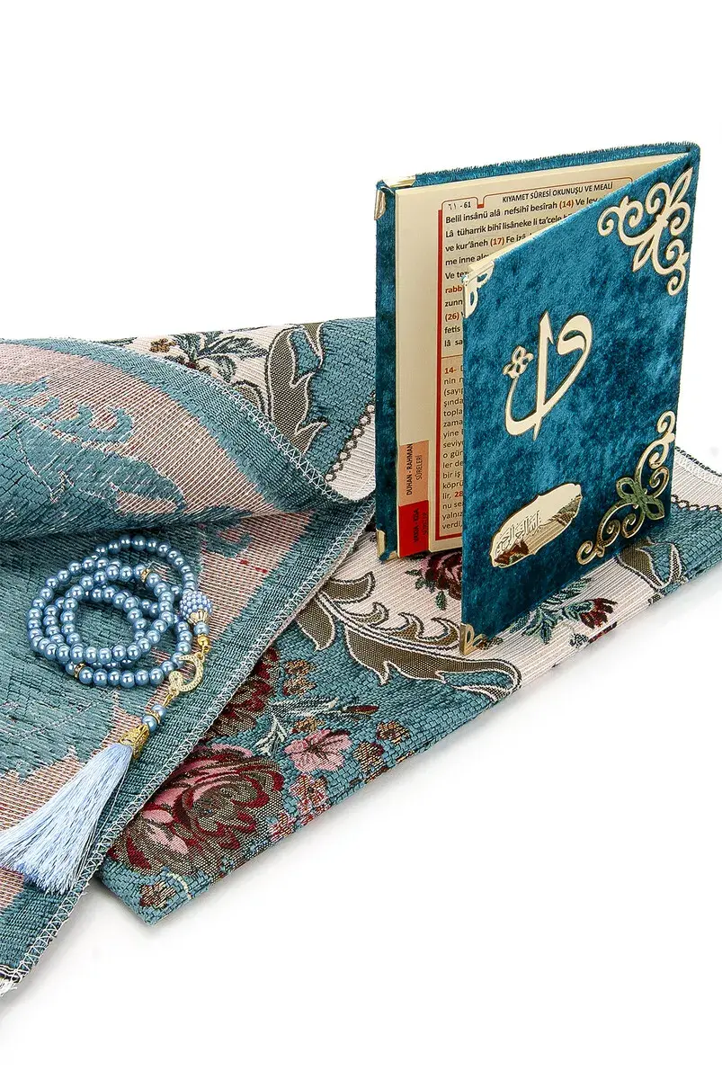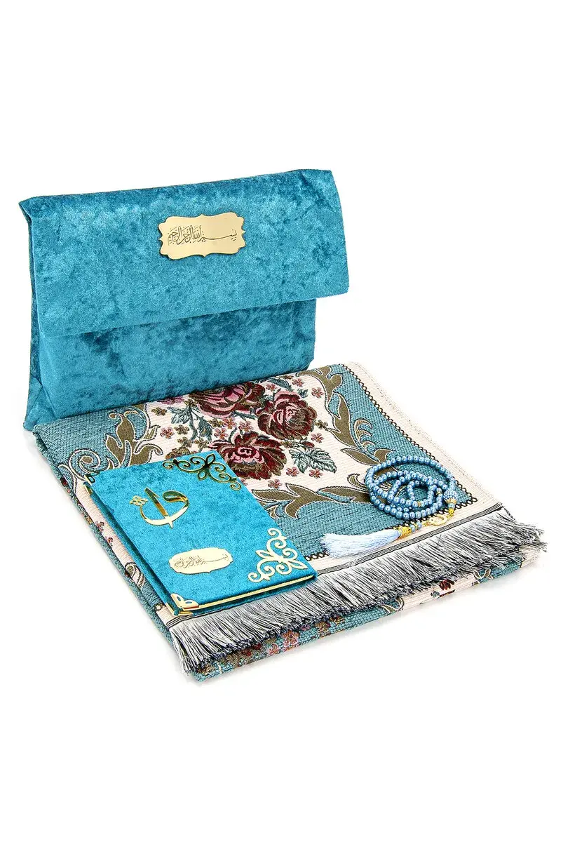 Kadife Keseli Lüks Seccade Seti - Petrol Renk