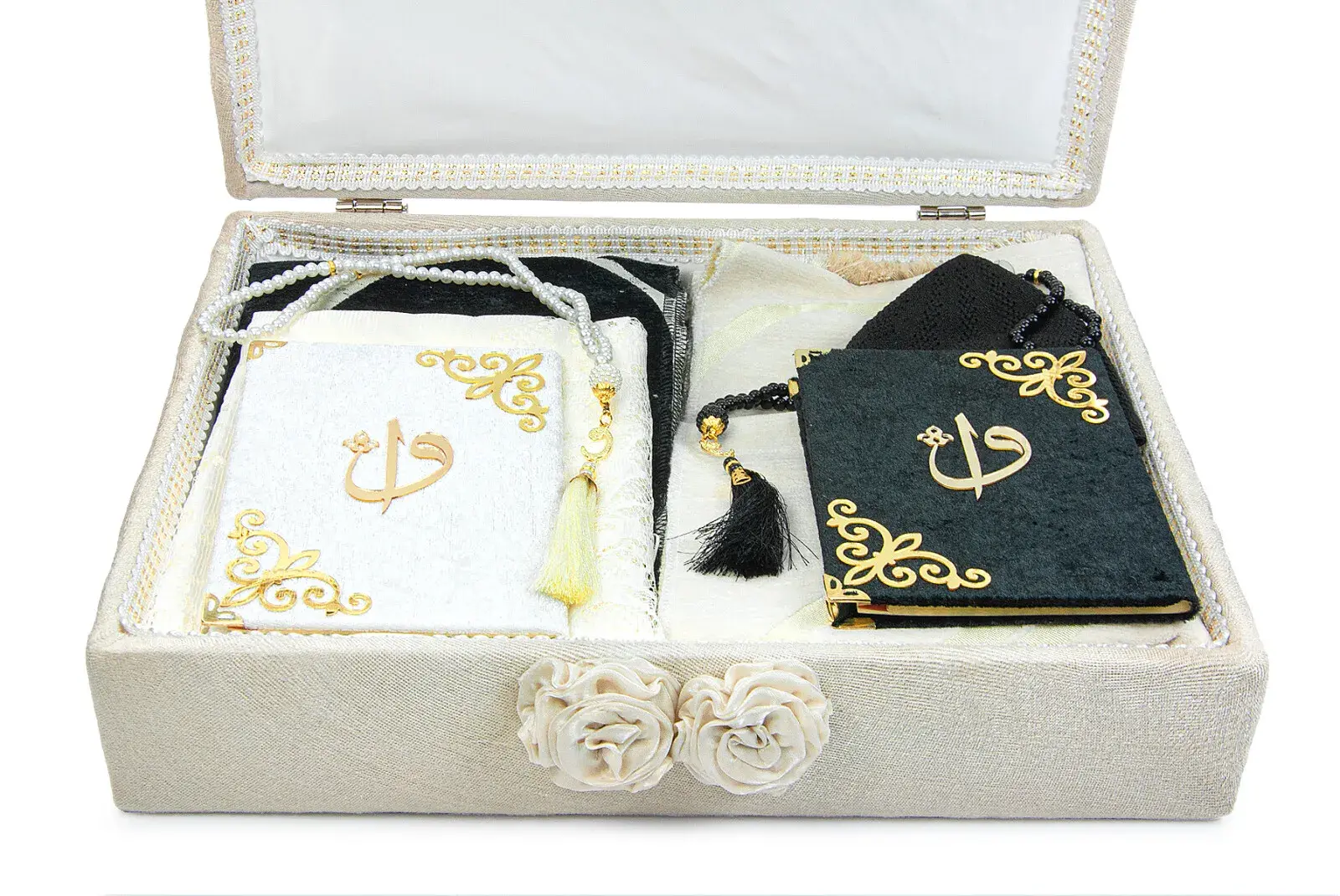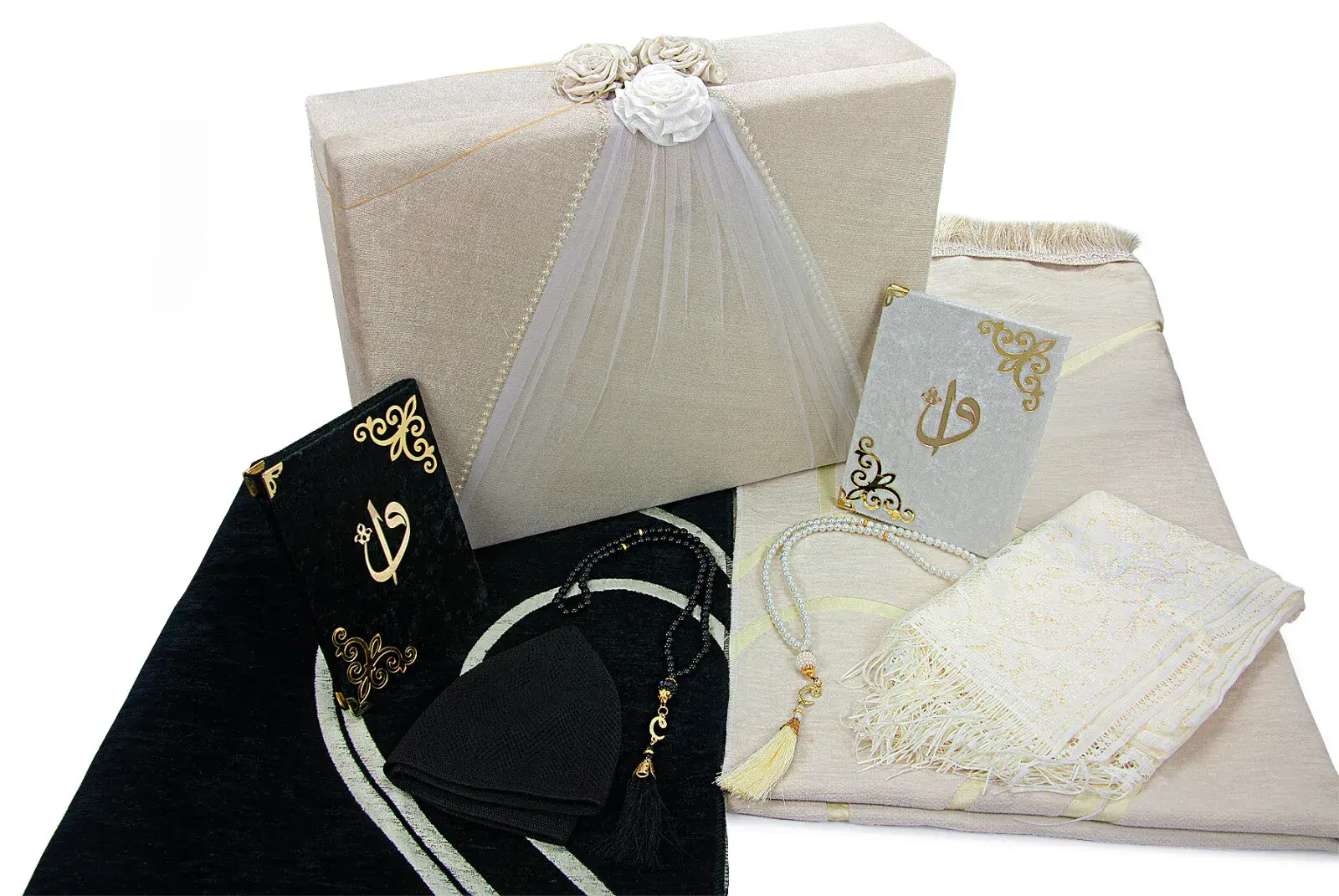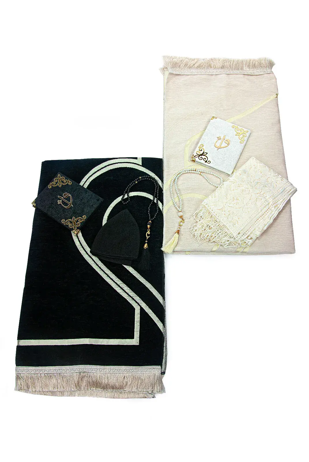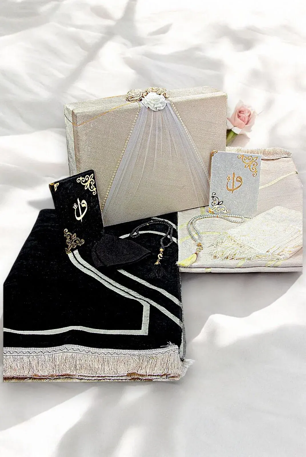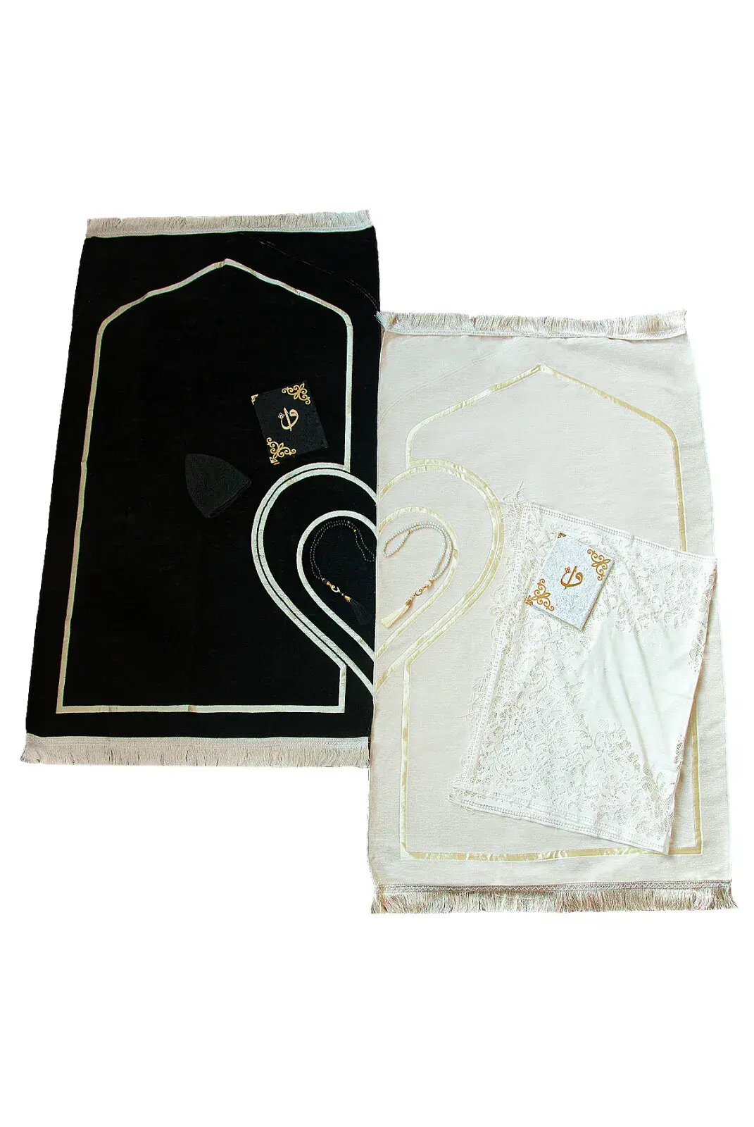 Bu çeyizlik seccade seti, çift seccade seti, çeyiz hazırlıklarınıza şıklık ve zarafet katmak için özel olarak tasarlandı. Siyah ve beyaz şönil kumaştan üretilen seccadeler, kalp deseniyle uyumlu bir çift olarak tasarlanmıştır. Gelin ve damat bohçaları için uygun olan bu set, çeyiz hazırlıklarında tercih edilebilecek pratik ve şık bir seçimdir.