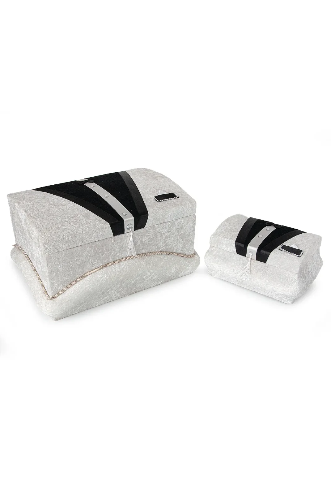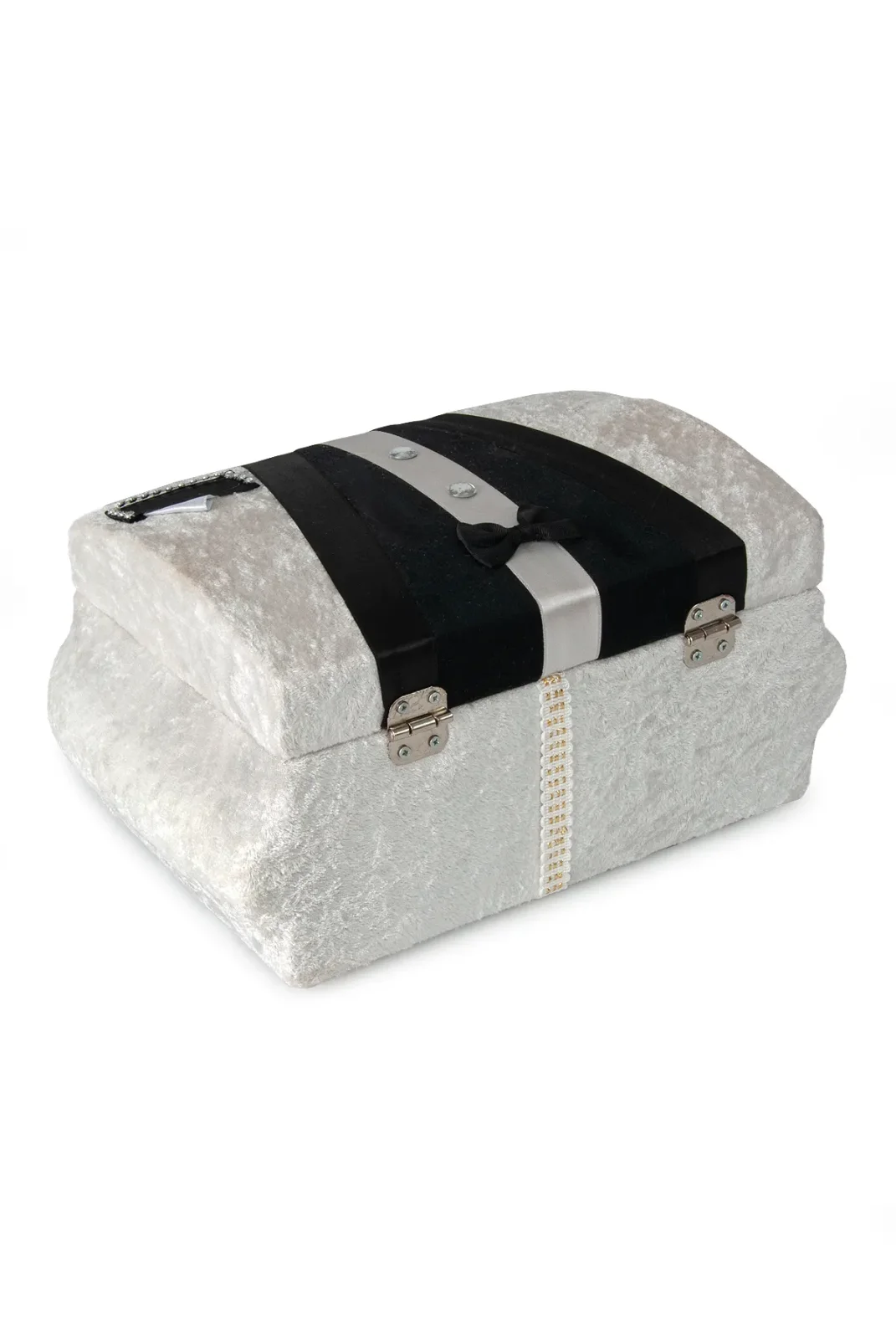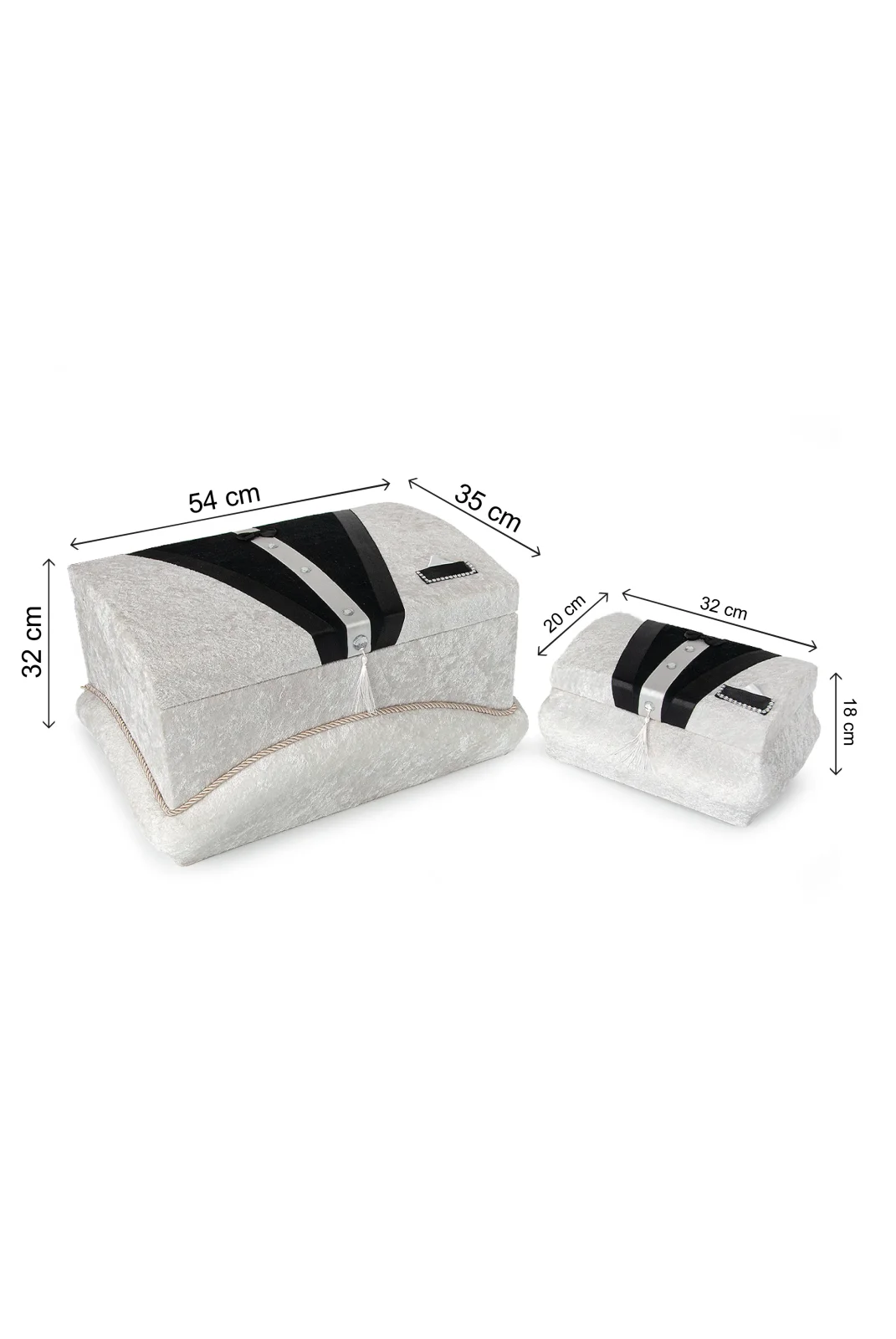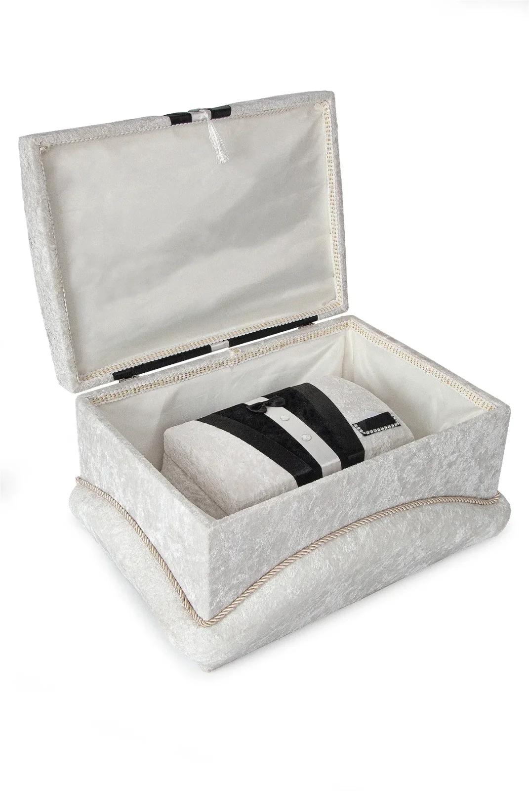 Modern detaylarla tasarlanan krem-siyah kadife süngerli söz, nişan, düğün ve çeyizlik gelin bohça sandık seti, klasik şıklığı modern bir çizgiyle birleştirir. Gümüş aksesuar ve siyah kadife şeritlerle süslenen formu, salon dekoruna premium bir hava katar.