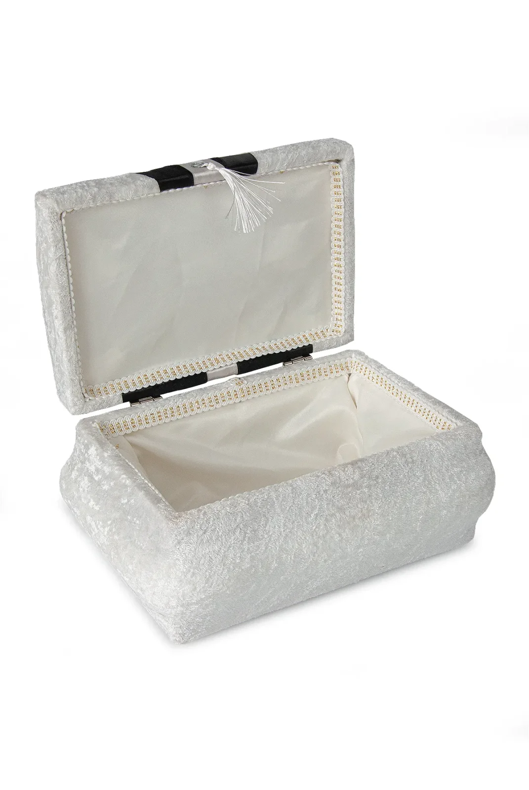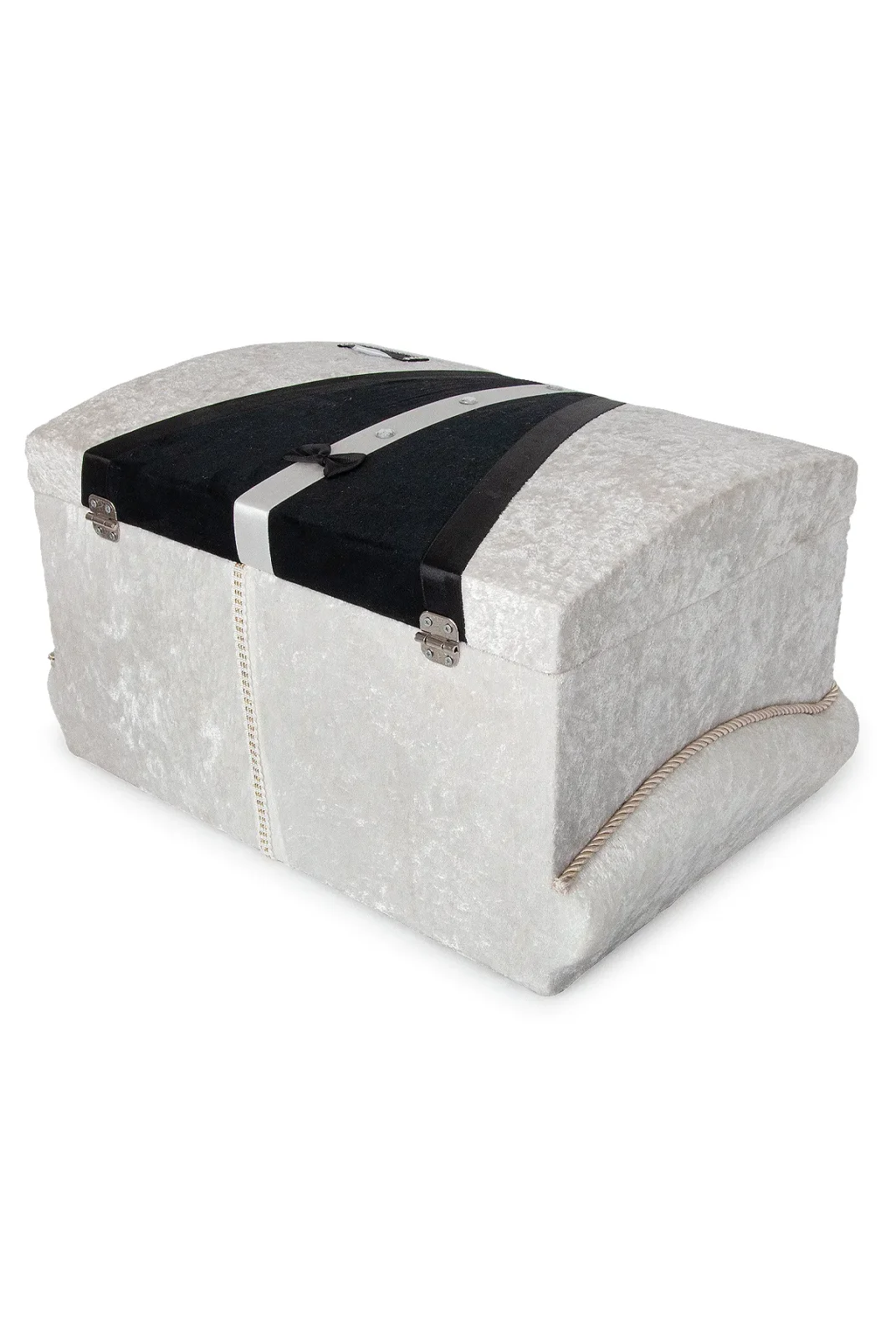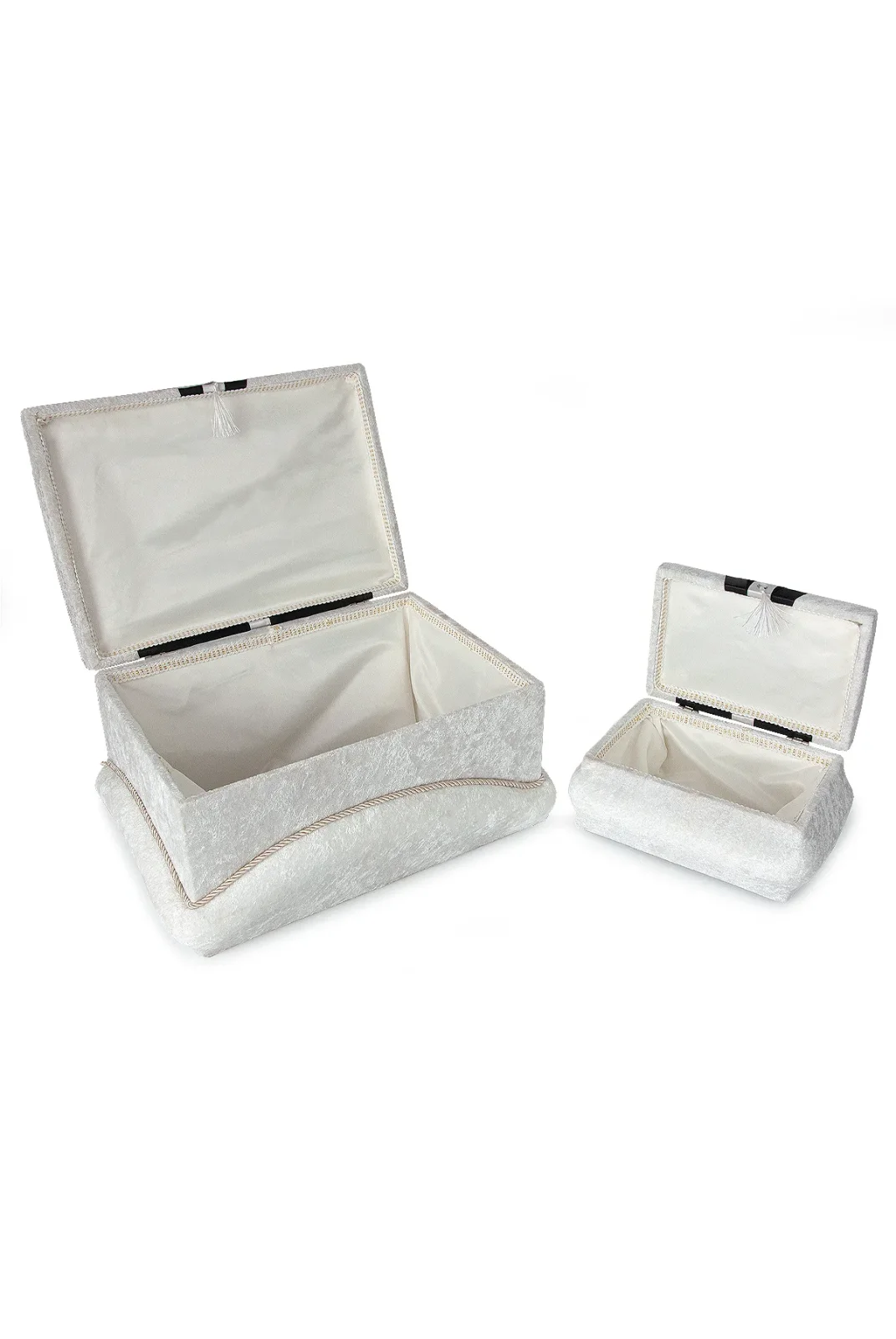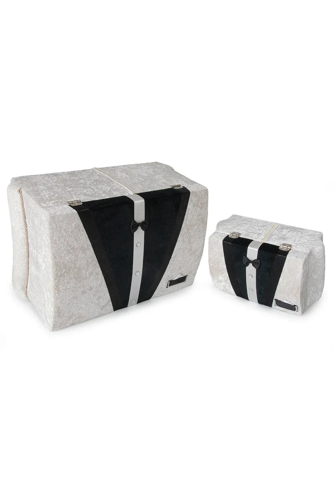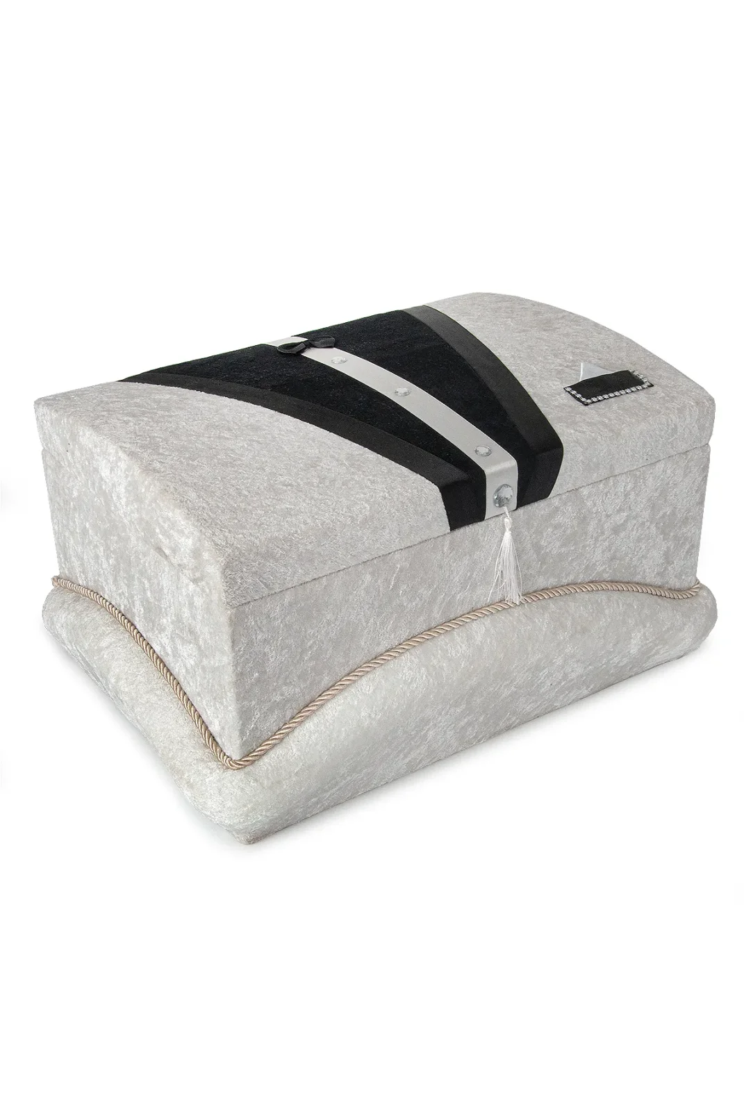 Modern detaylarla tasarlanan krem-siyah kadife süngerli söz, nişan, düğün ve çeyizlik gelin bohça sandık seti, klasik şıklığı modern bir çizgiyle birleştirir. Gümüş aksesuar ve siyah kadife şeritlerle süslenen formu, salon dekoruna premium bir hava katar.