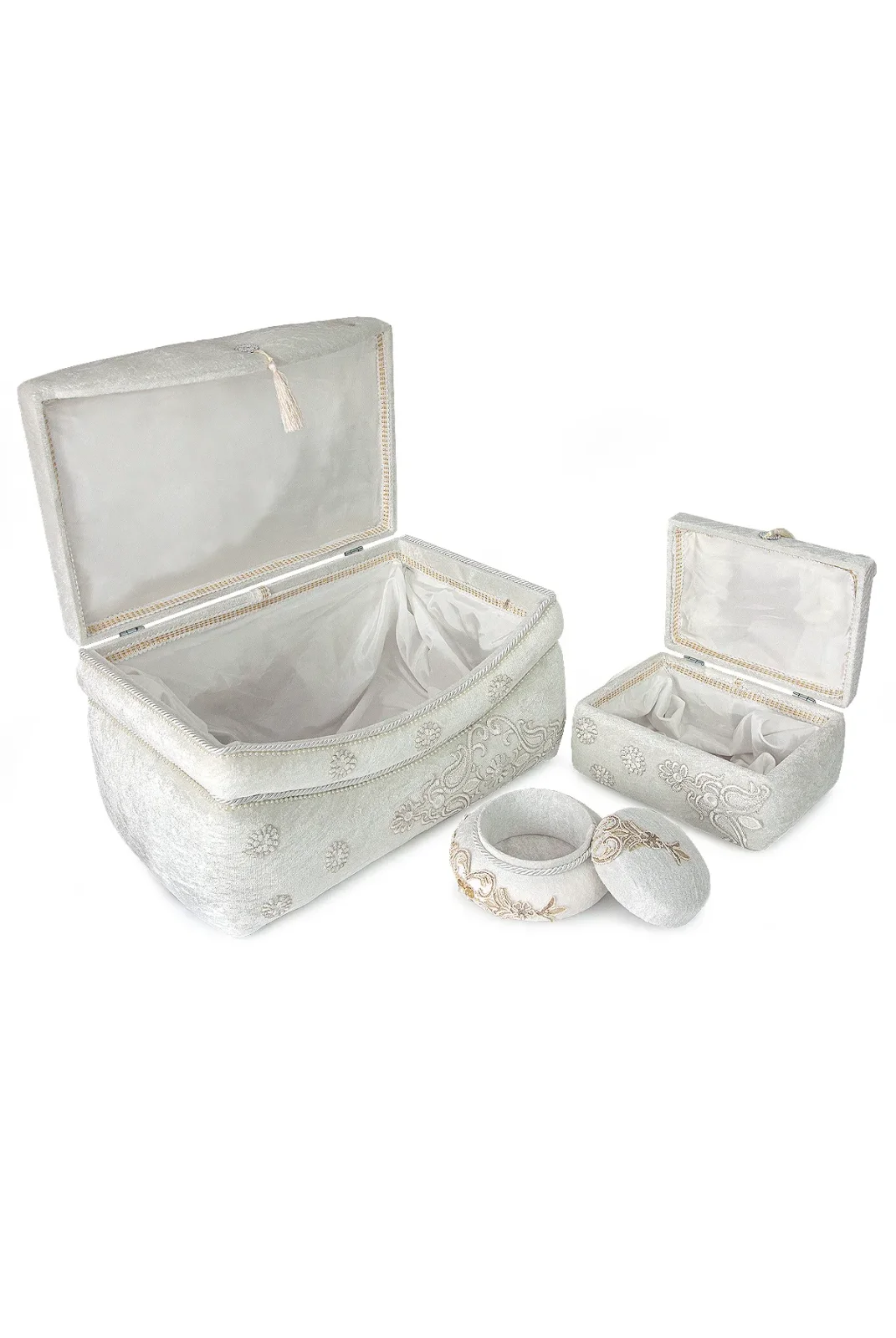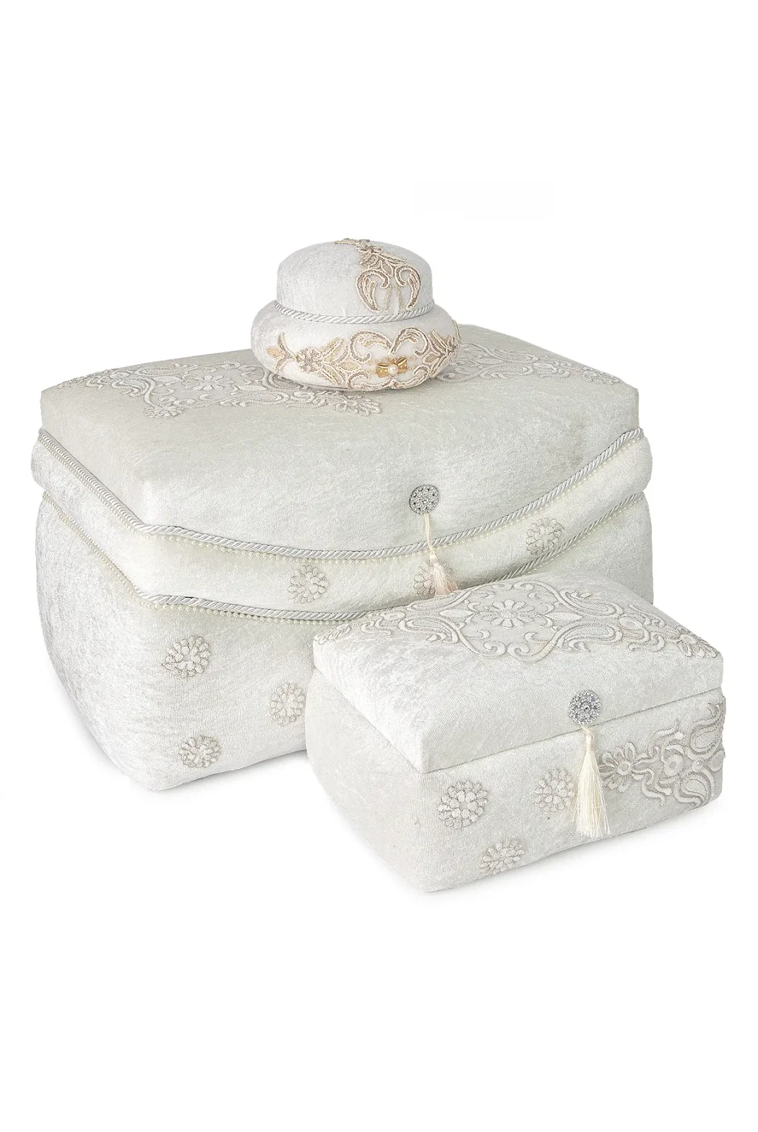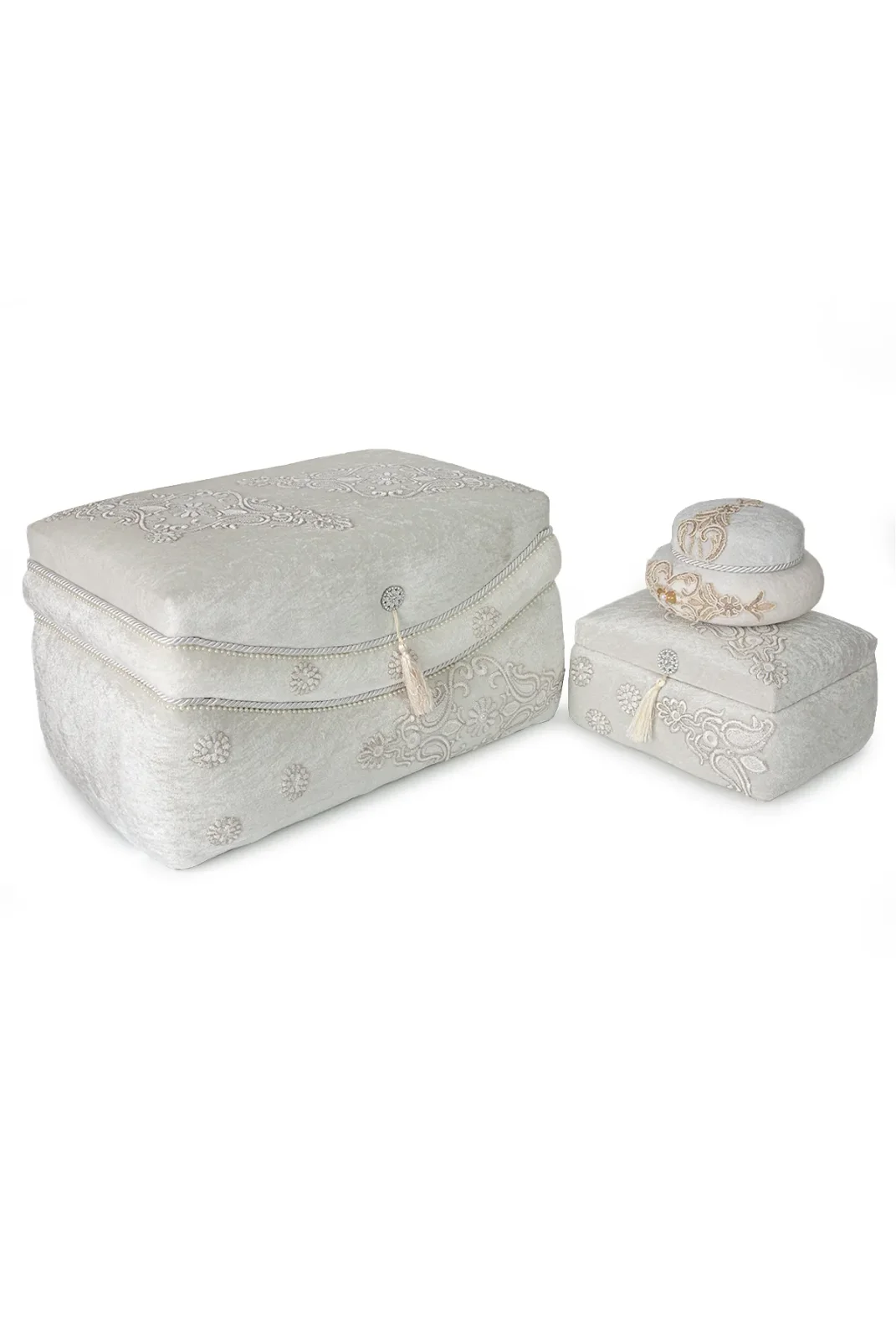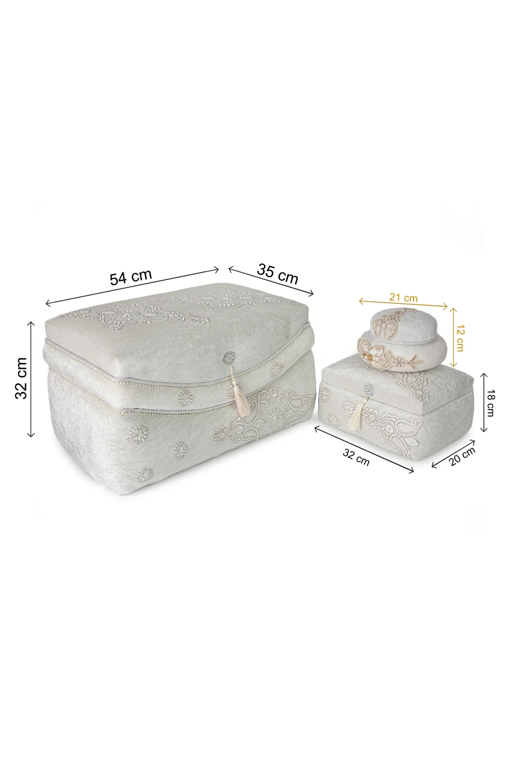 Zarif ve asil görünümüyle öne çıkan kadife yuvarlak kapaklı söz, nişan, düğün ve çeyizlik gelin bohça sandık seti, üç parçadan oluşan özel tasarımıyla dikkat çeker. El işçiliği dantel işlemeleri, püskül ve inci detaylarıyla tamamlanan model, hem estetik hem de işlevsel bir kullanım sunar.