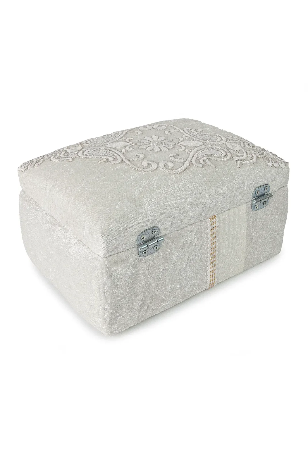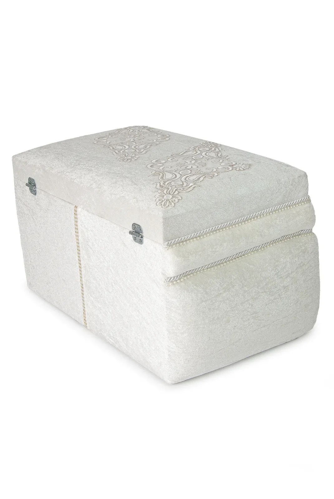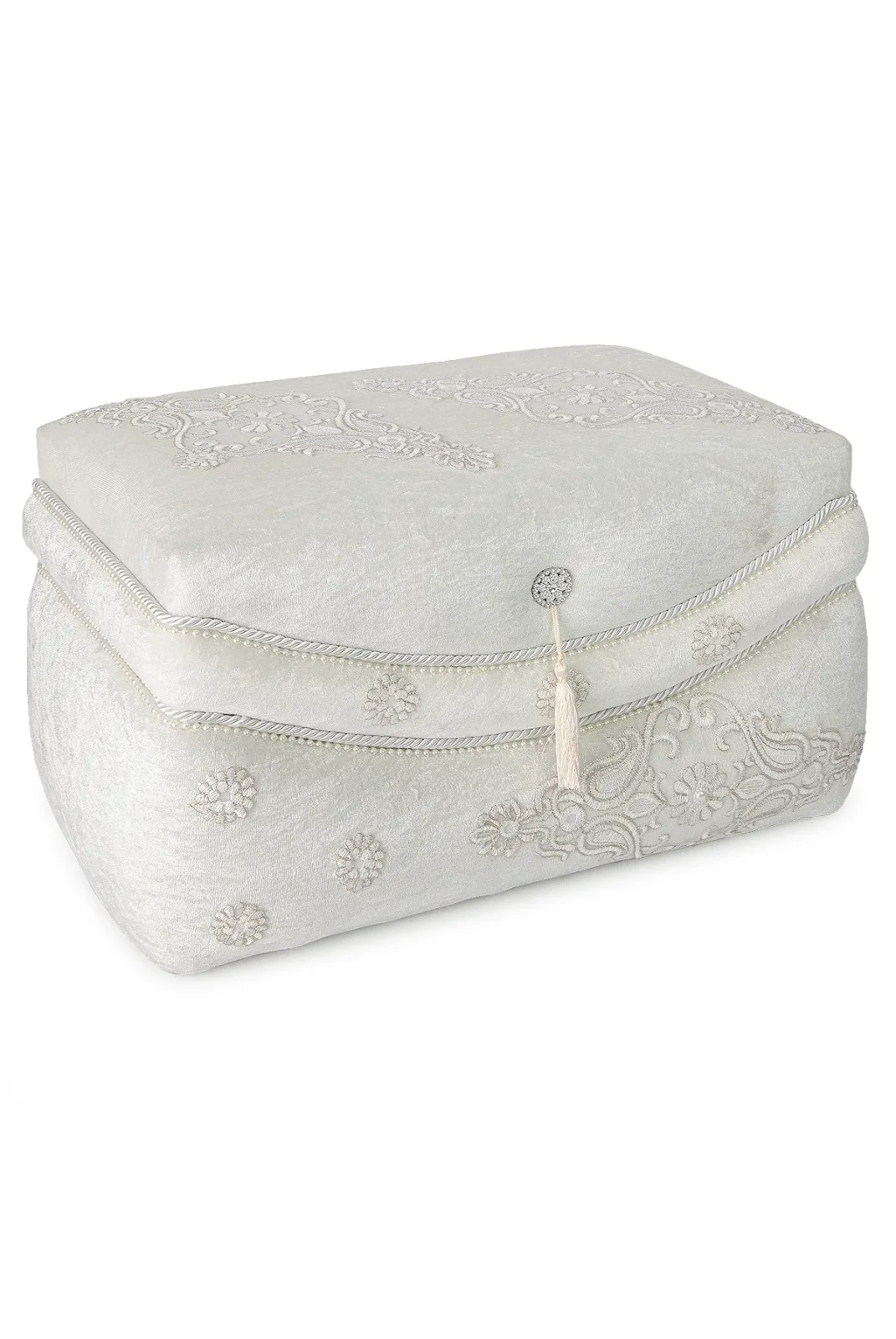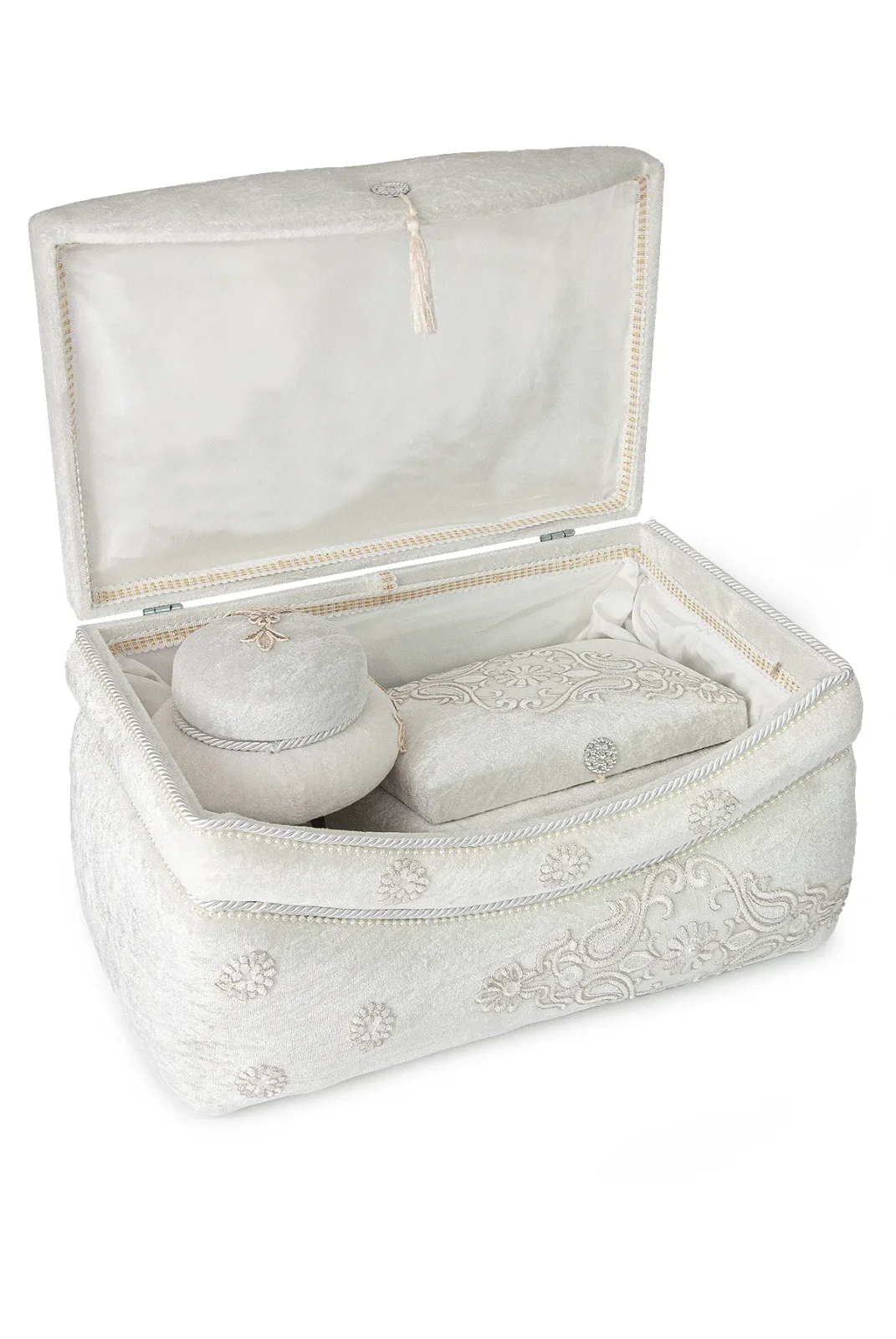 Zarif ve asil görünümüyle öne çıkan kadife yuvarlak kapaklı söz, nişan, düğün ve çeyizlik gelin bohça sandık seti, üç parçadan oluşan özel tasarımıyla dikkat çeker. El işçiliği dantel işlemeleri, püskül ve inci detaylarıyla tamamlanan model, hem estetik hem de işlevsel bir kullanım sunar.