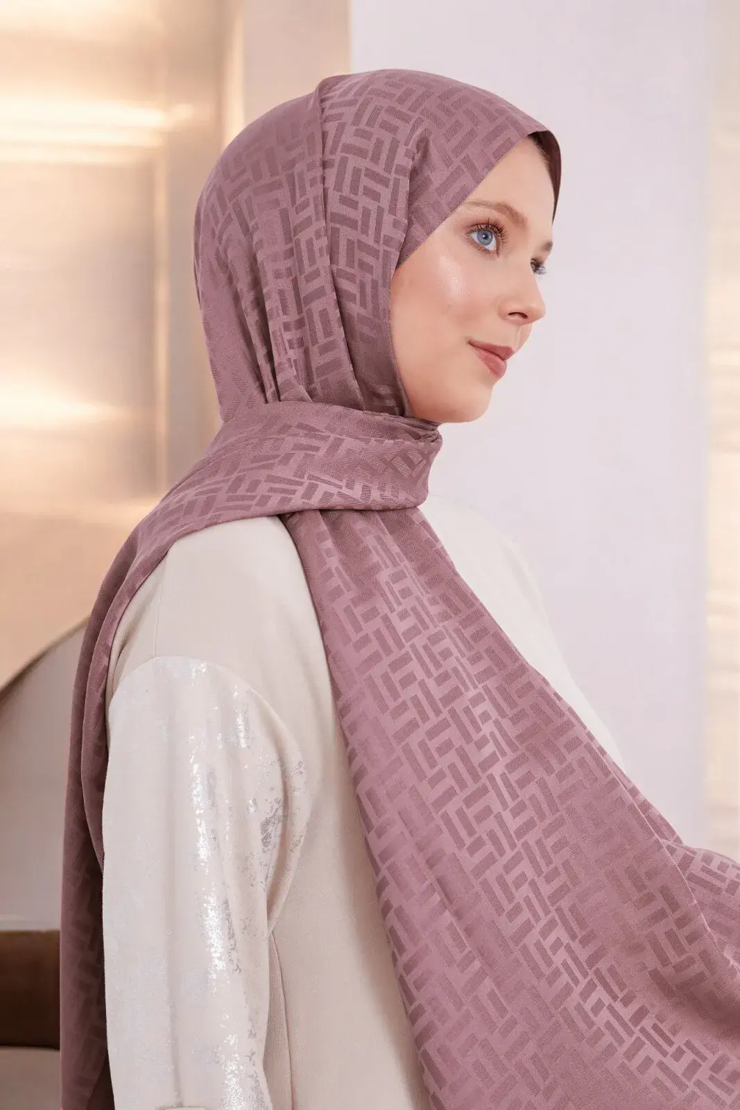 Kadın Dikdörtgen Desen Tesettür Blue Jakar Şal Gül Kurusu