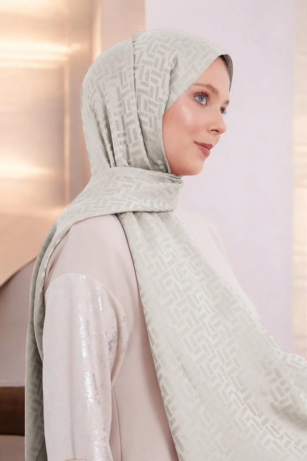 Kadın Dikdörtgen Desen Tesettür Blue Jakar Şal Kırık Beyaz