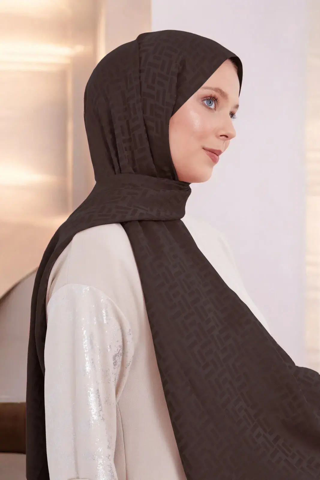 Kadın Dikdörtgen Desen Tesettür Blue Jakar Şal Koyu Kahverengi