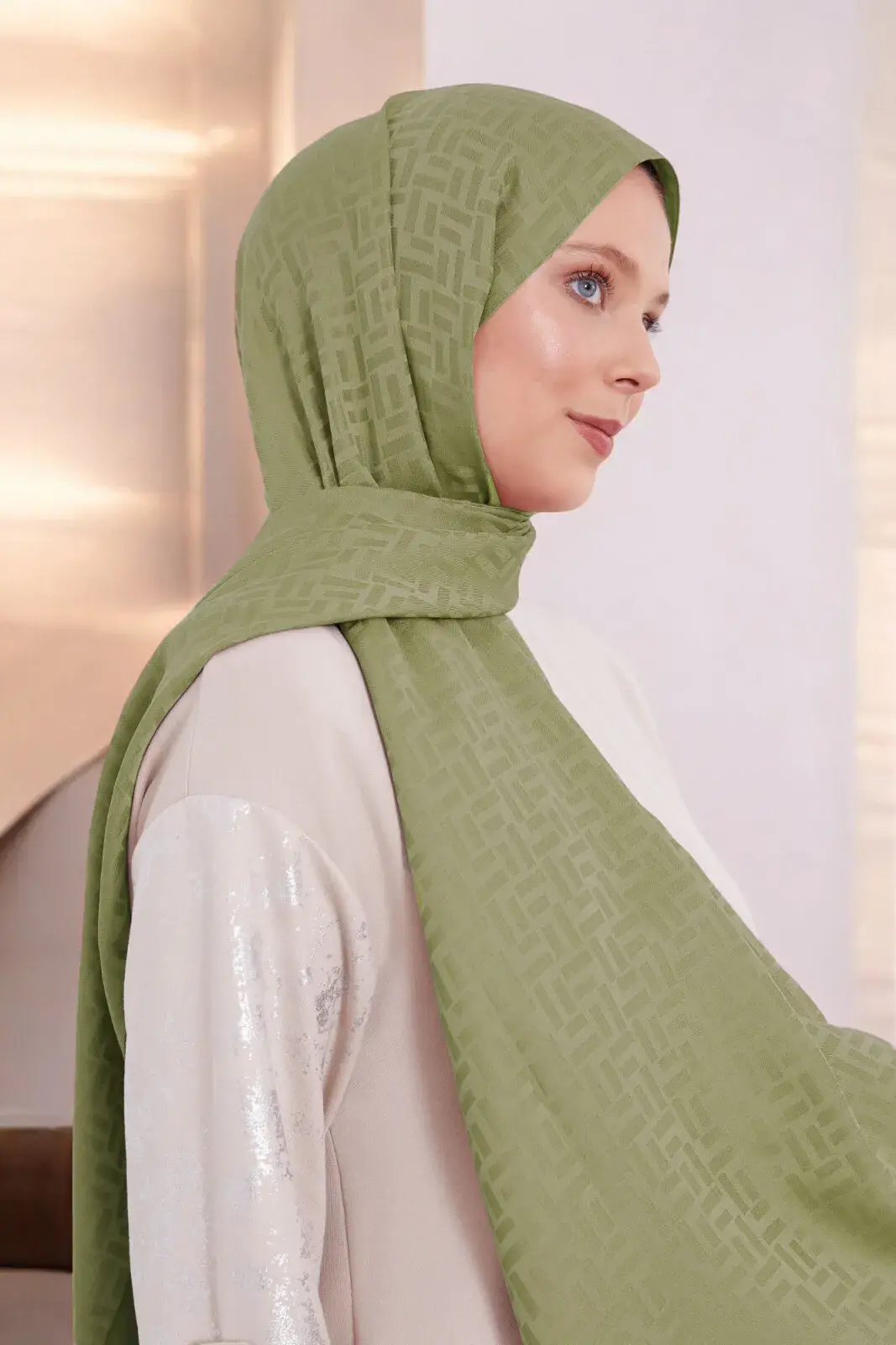 Kadın Dikdörtgen Desen Tesettür Blue Jakar Şal Yağ Yeşili