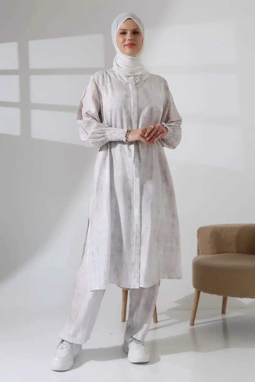 Kadın Gizli Fermuarlı Yandan Yırtmaçlı Gipeli Hac Umre Kıyafeti Tesettür İkili Takım Ekru
