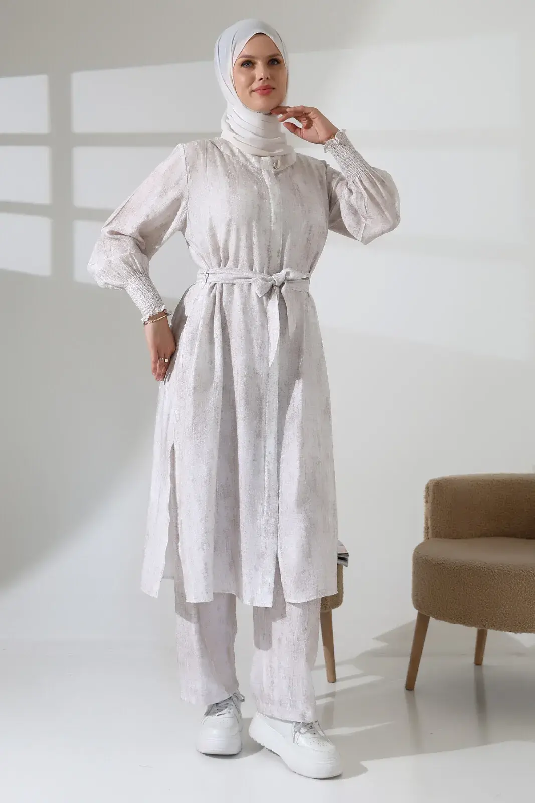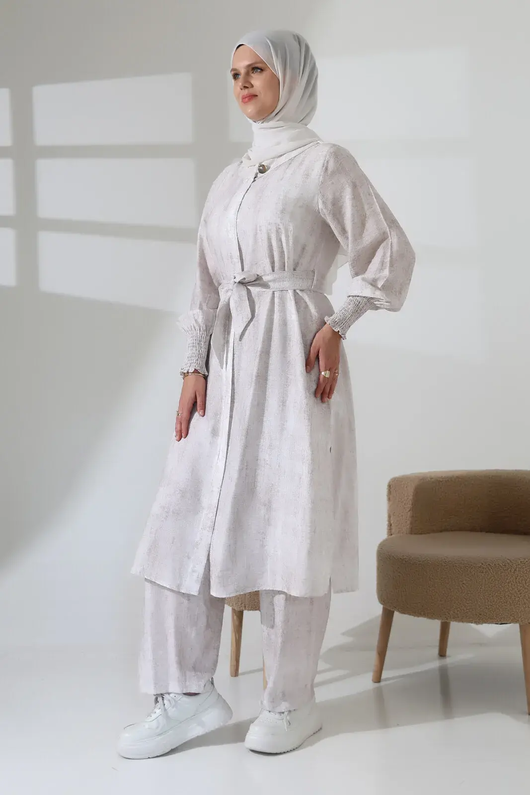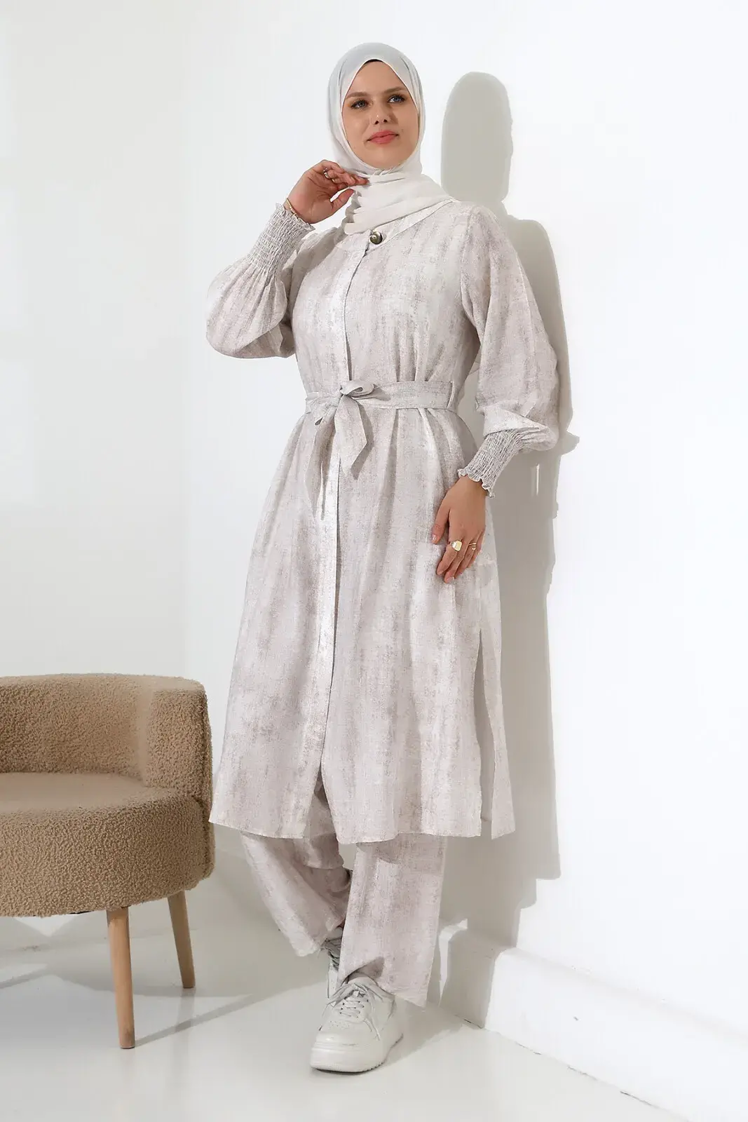 Gizli fermuar detayı ve kuşaklı tasarımıyla zarif bir görünüme sahiptir. Yandan yırtmaçlı kap ve lastikli bel pantolon, hem günlük hayatta hem de Hac ve Umre ziyaretlerinde rahatlıkla kullanabileceğiniz pratik bir seçenek sunar. Modern ve spor bir stil arayanlar için ideal.