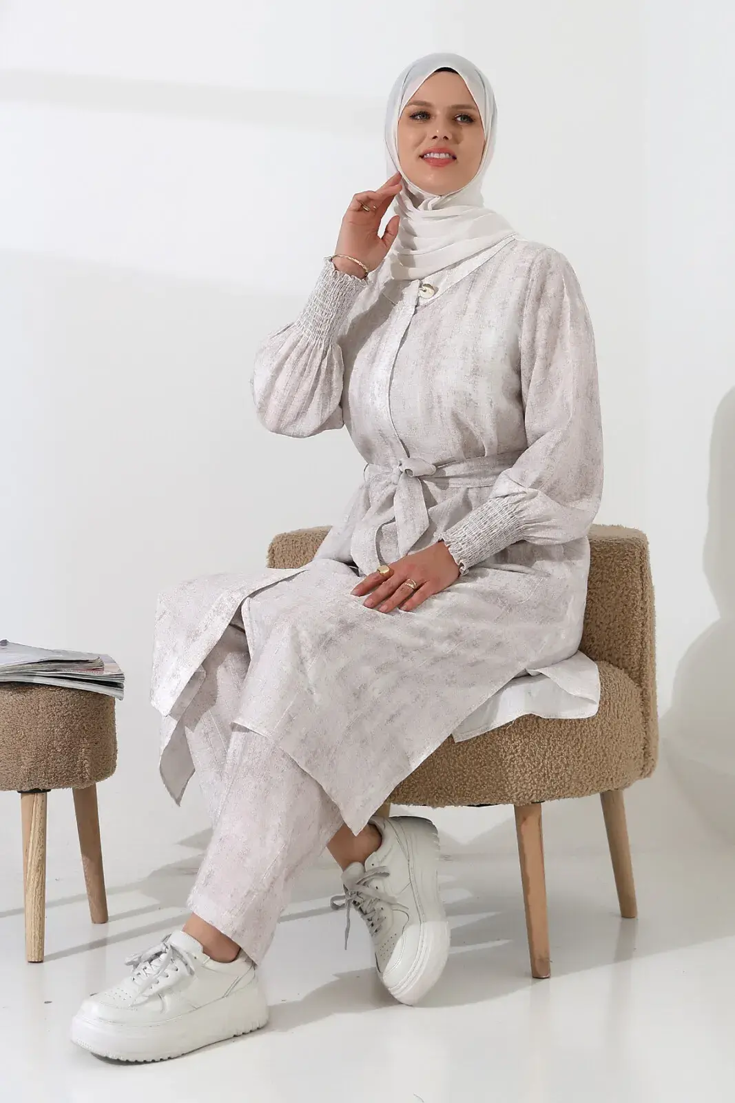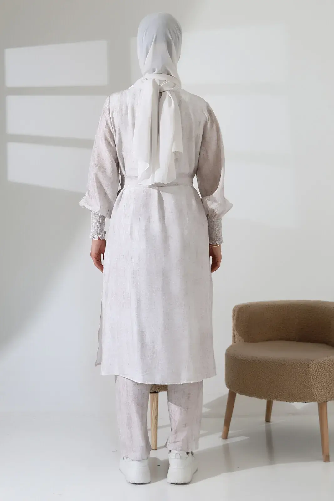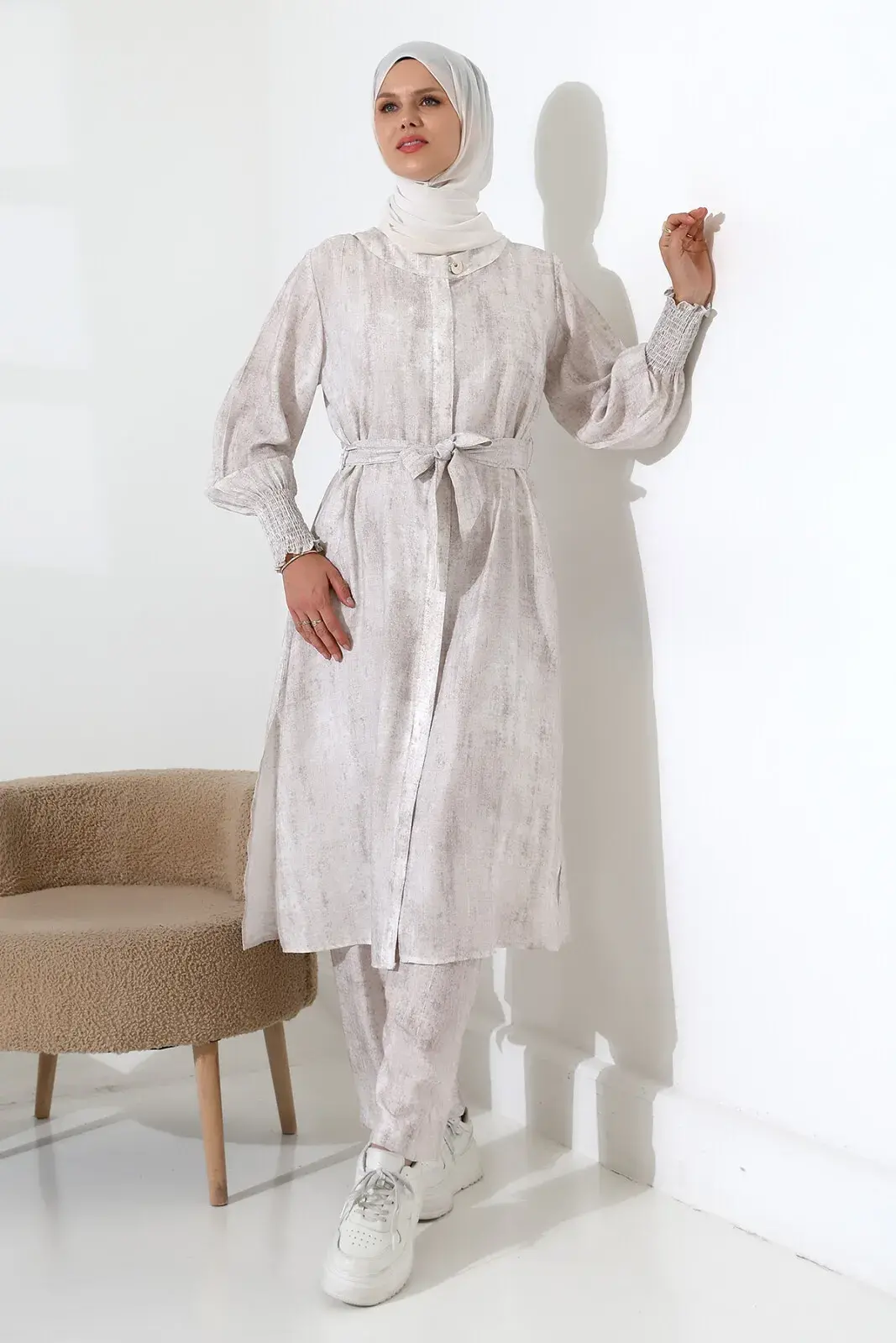 Gizli fermuar detayı ve kuşaklı tasarımıyla zarif bir görünüme sahiptir. Yandan yırtmaçlı kap ve lastikli bel pantolon, hem günlük hayatta hem de Hac ve Umre ziyaretlerinde rahatlıkla kullanabileceğiniz pratik bir seçenek sunar. Modern ve spor bir stil arayanlar için ideal.