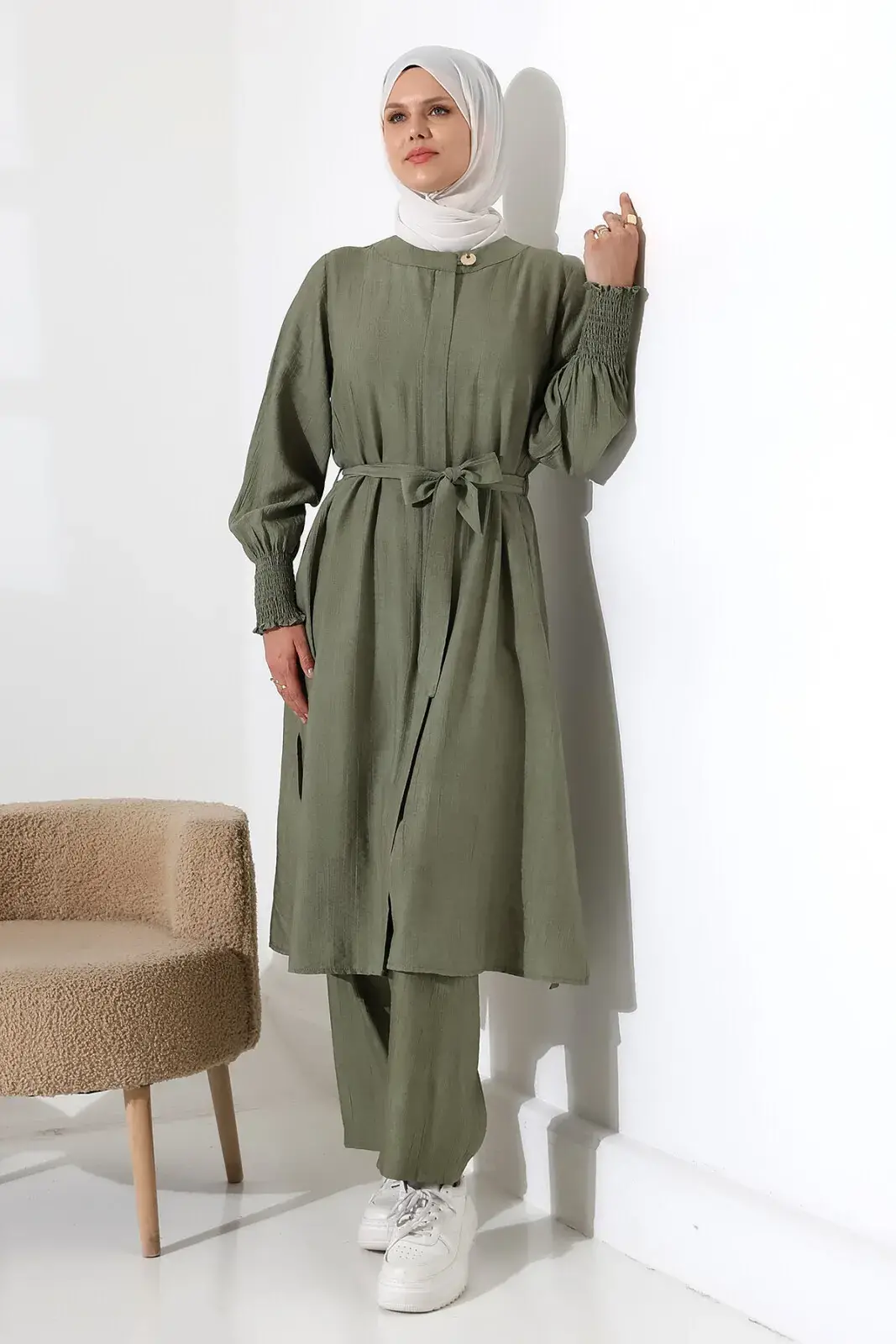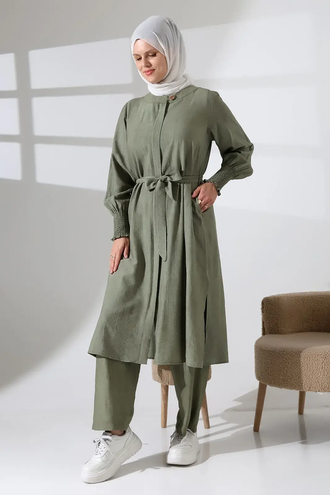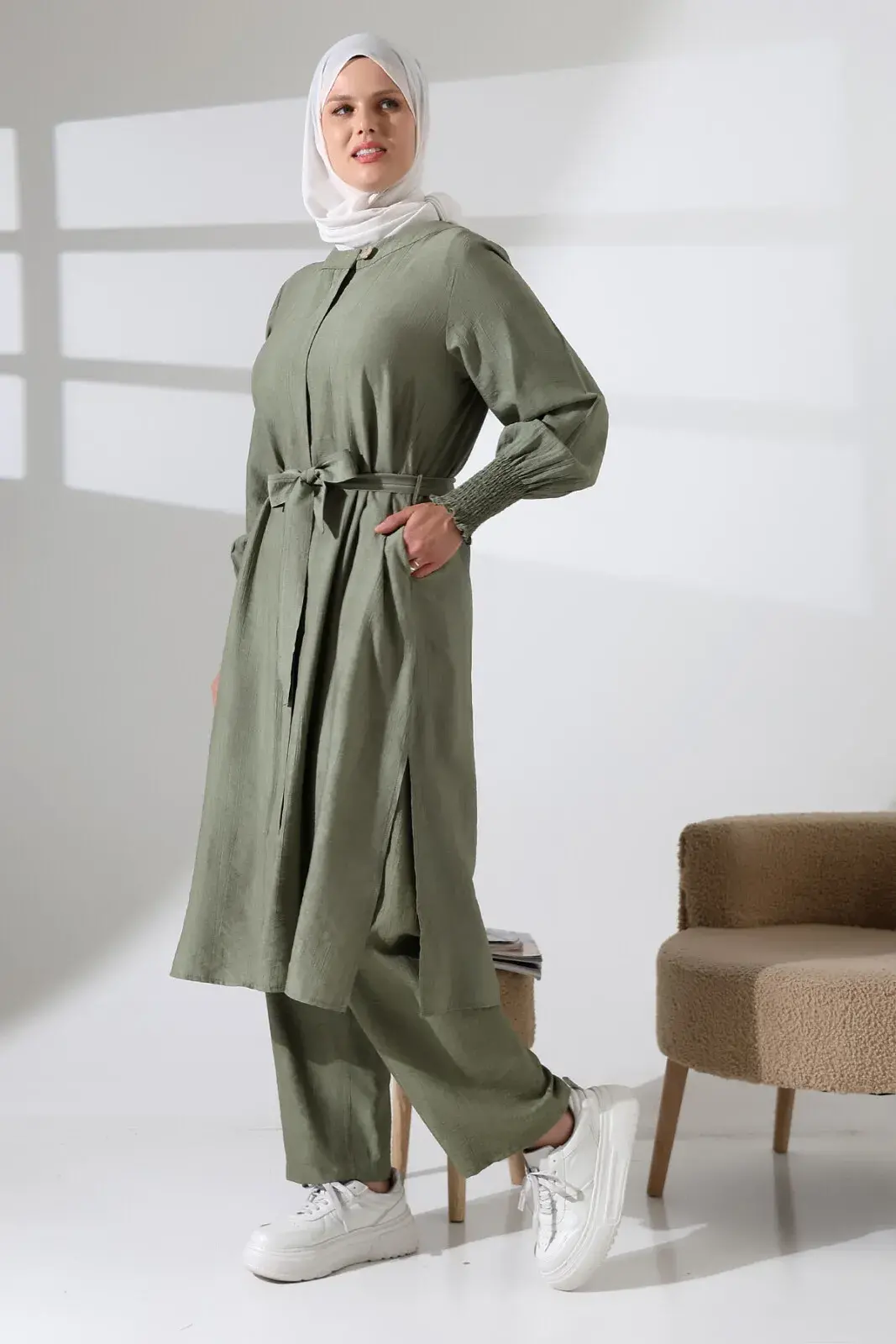 Gizli fermuar detayı ve kuşaklı tasarımıyla zarif bir görünüme sahiptir. Yandan yırtmaçlı kap ve lastikli bel pantolon, hem günlük hayatta hem de Hac ve Umre ziyaretlerinde rahatlıkla kullanabileceğiniz pratik bir seçenek sunar. Modern ve spor bir stil arayanlar için ideal.
