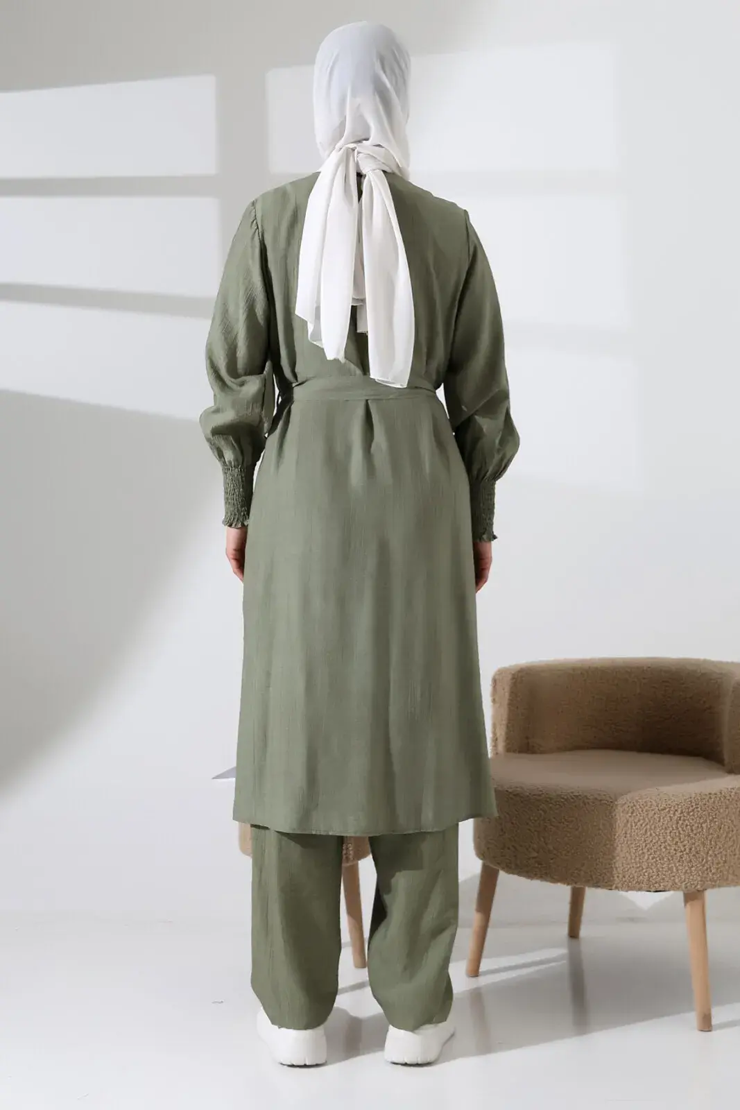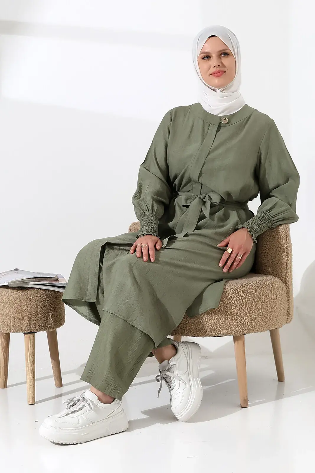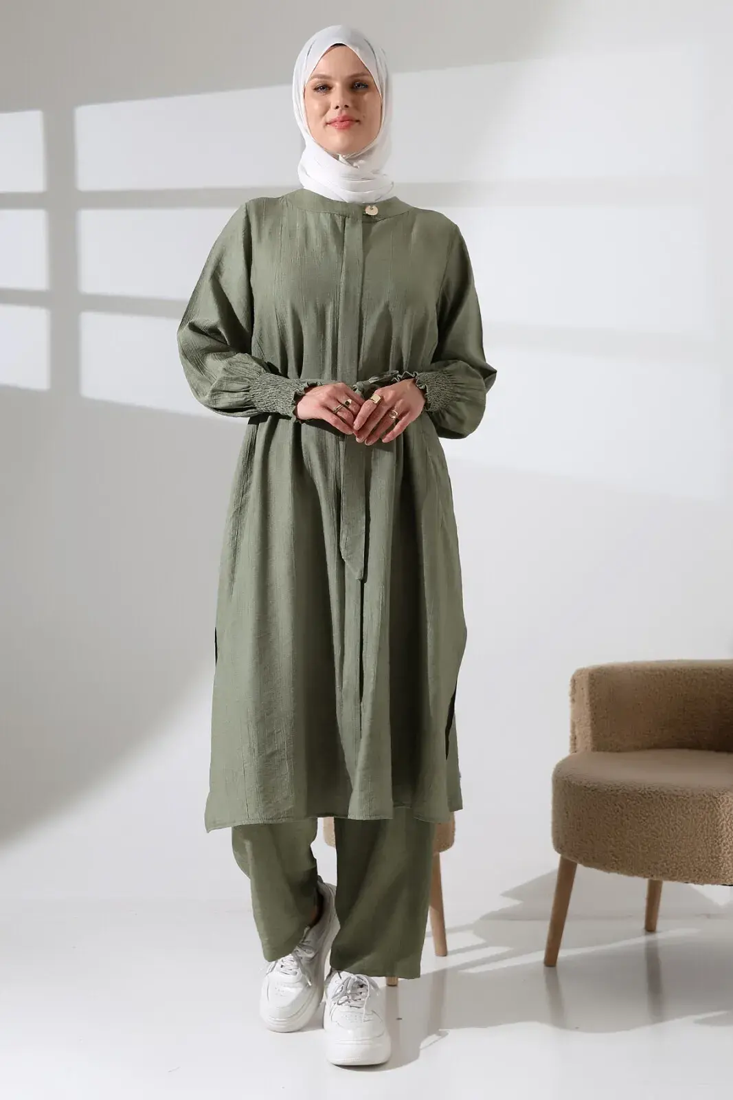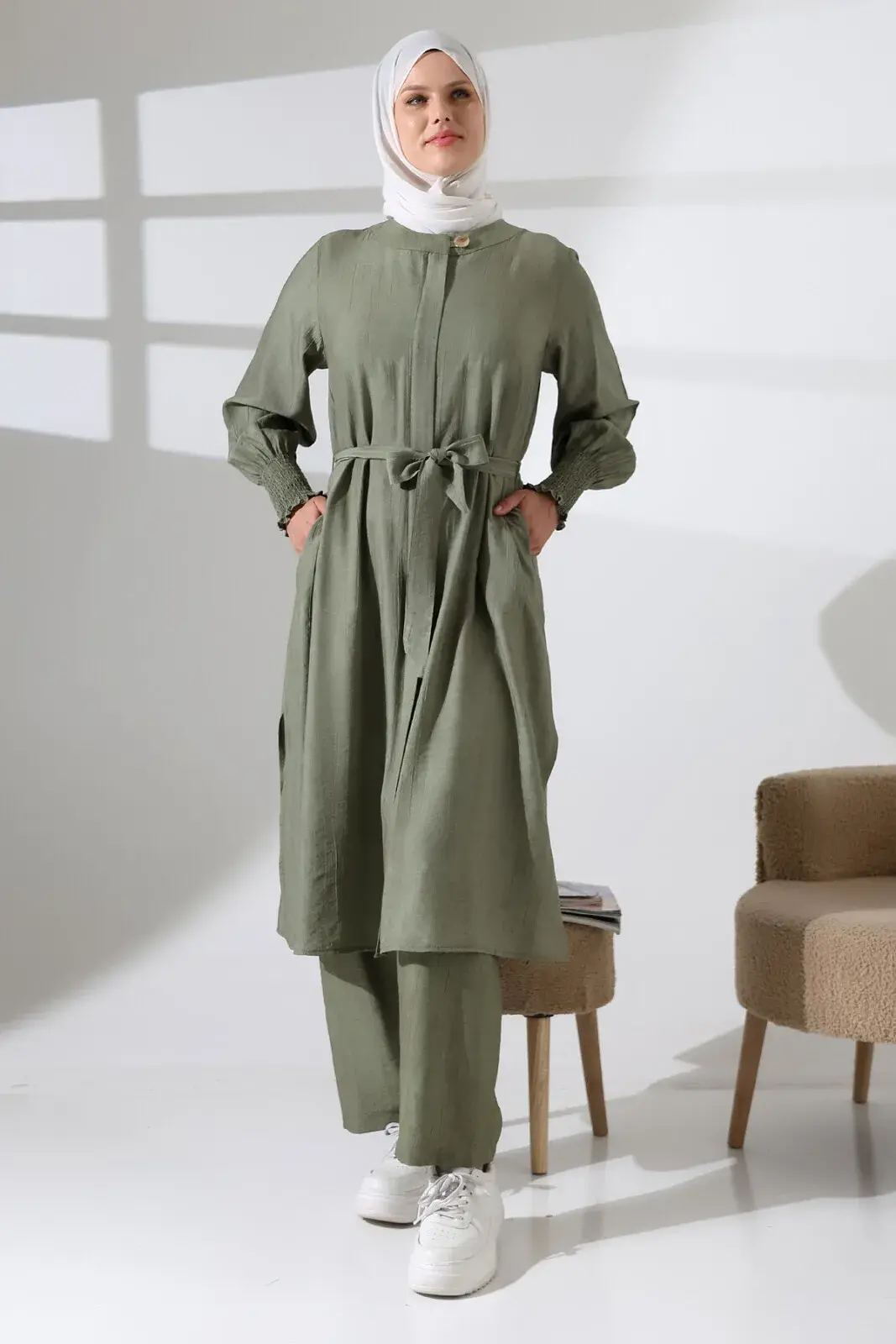 Gizli fermuar detayı ve kuşaklı tasarımıyla zarif bir görünüme sahiptir. Yandan yırtmaçlı kap ve lastikli bel pantolon, hem günlük hayatta hem de Hac ve Umre ziyaretlerinde rahatlıkla kullanabileceğiniz pratik bir seçenek sunar. Modern ve spor bir stil arayanlar için ideal.