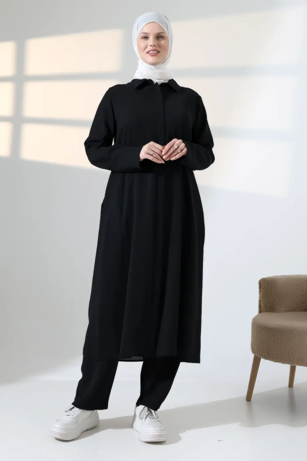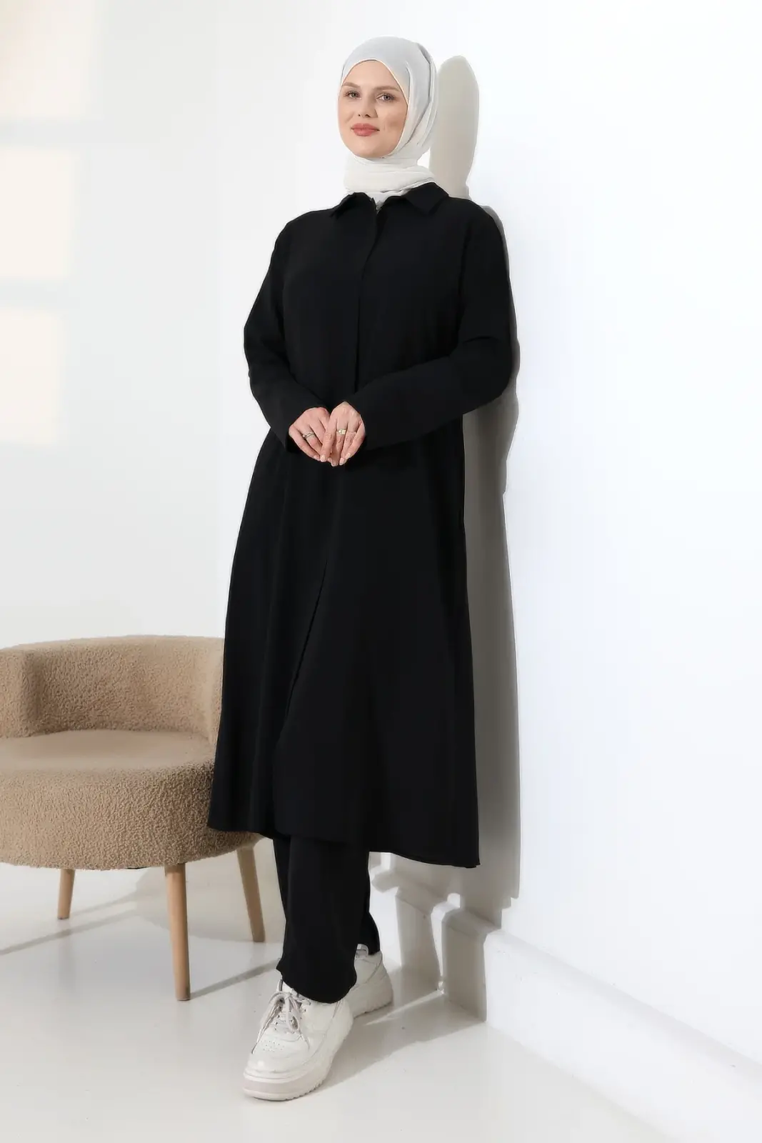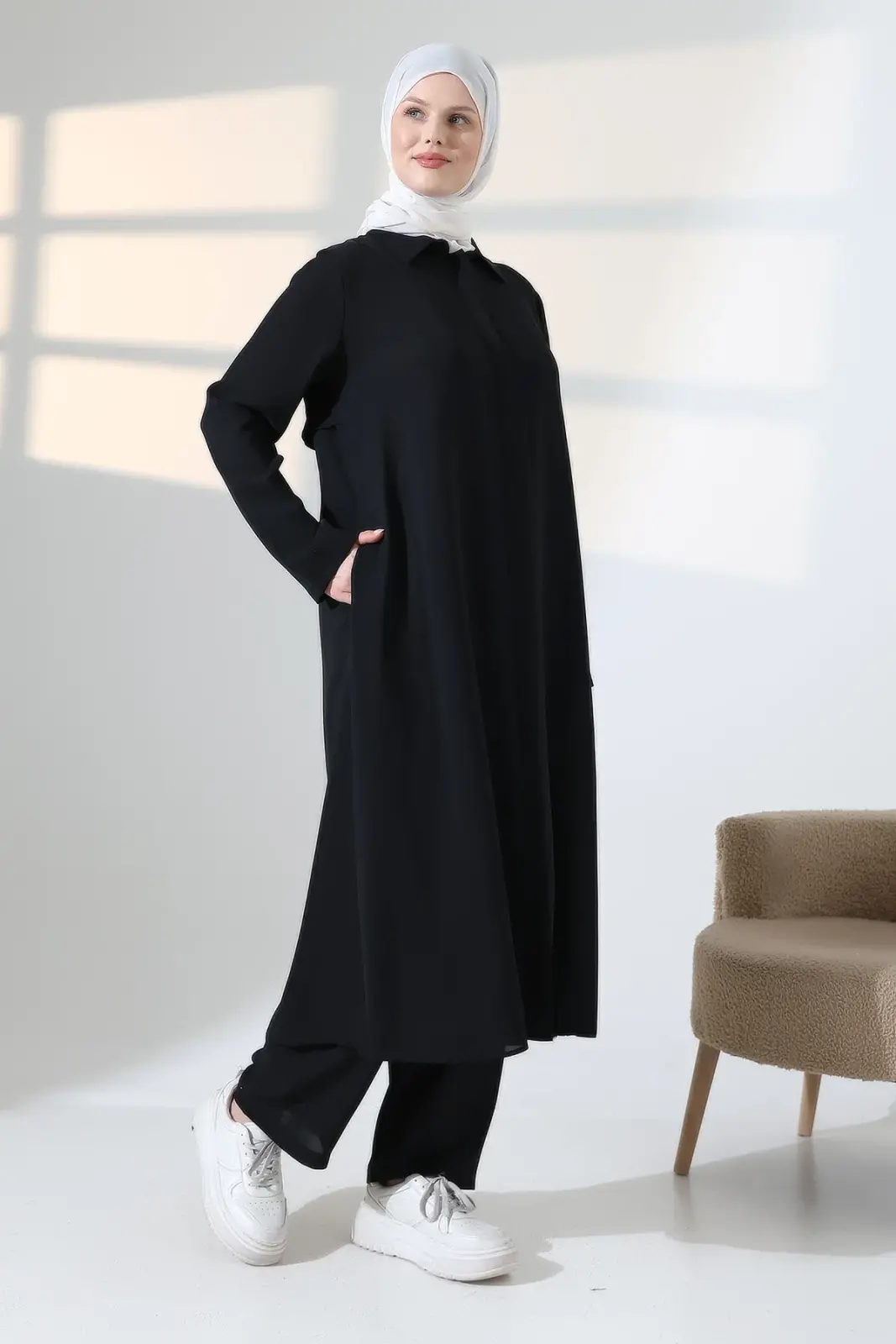 Modern Kesim ve Günlük Şıklık: Özgün sırt cepken detayı ile takıma modern bir dış giyim havası katılmıştır. Dökümlü yapısı sayesinde vücut hatlarını belli etmez, zarif bir silüet oluşturur. Pamuk içerikli dokusu cildinizin nefes almasını sağlayarak gün boyu ferah bir kullanım sunar.