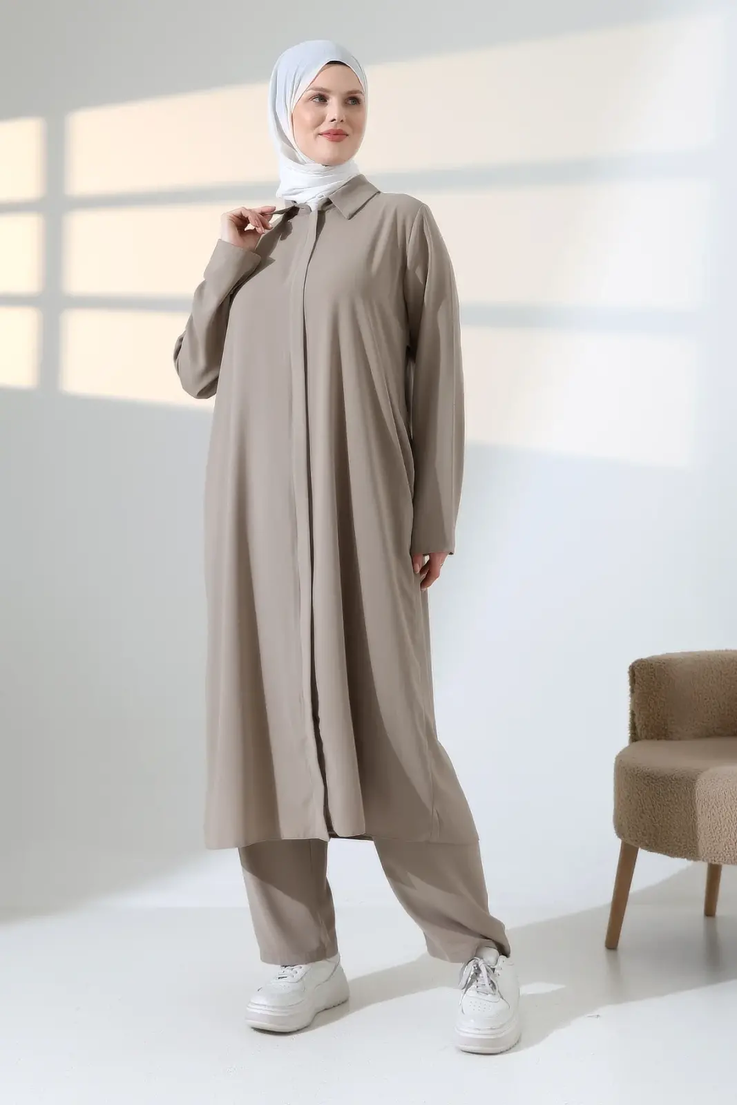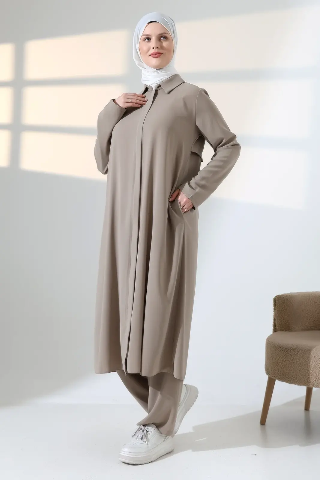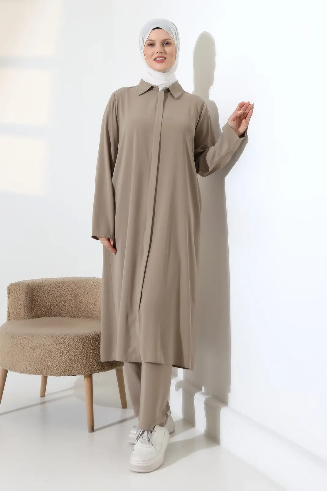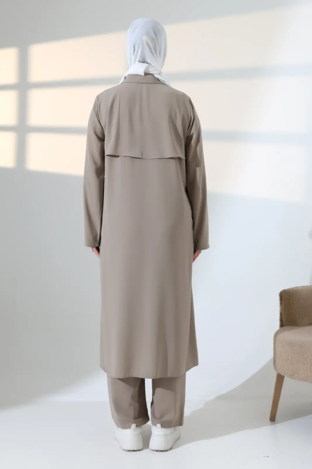 Kadın Hac ve Umre Kıyafeti, Tesettür Cepken Detaylı İkili Takım - Vizon