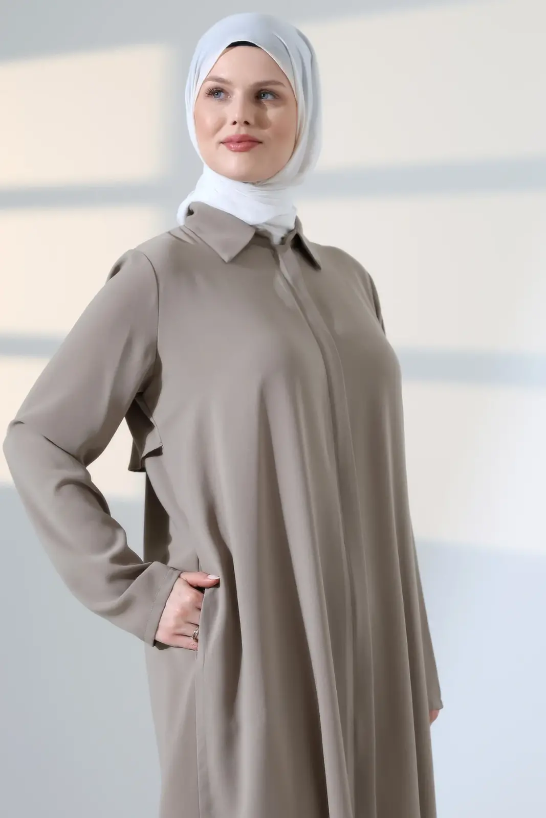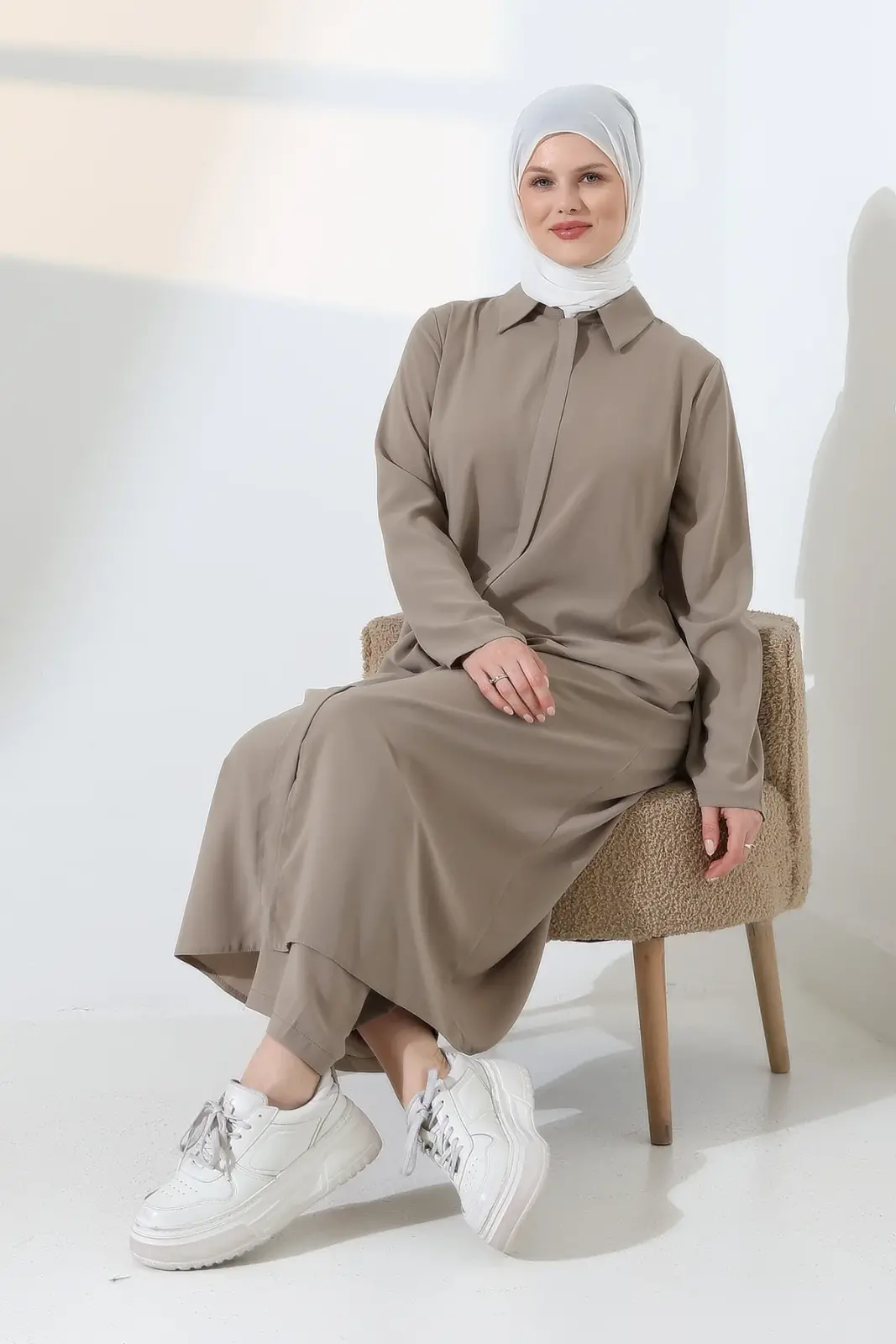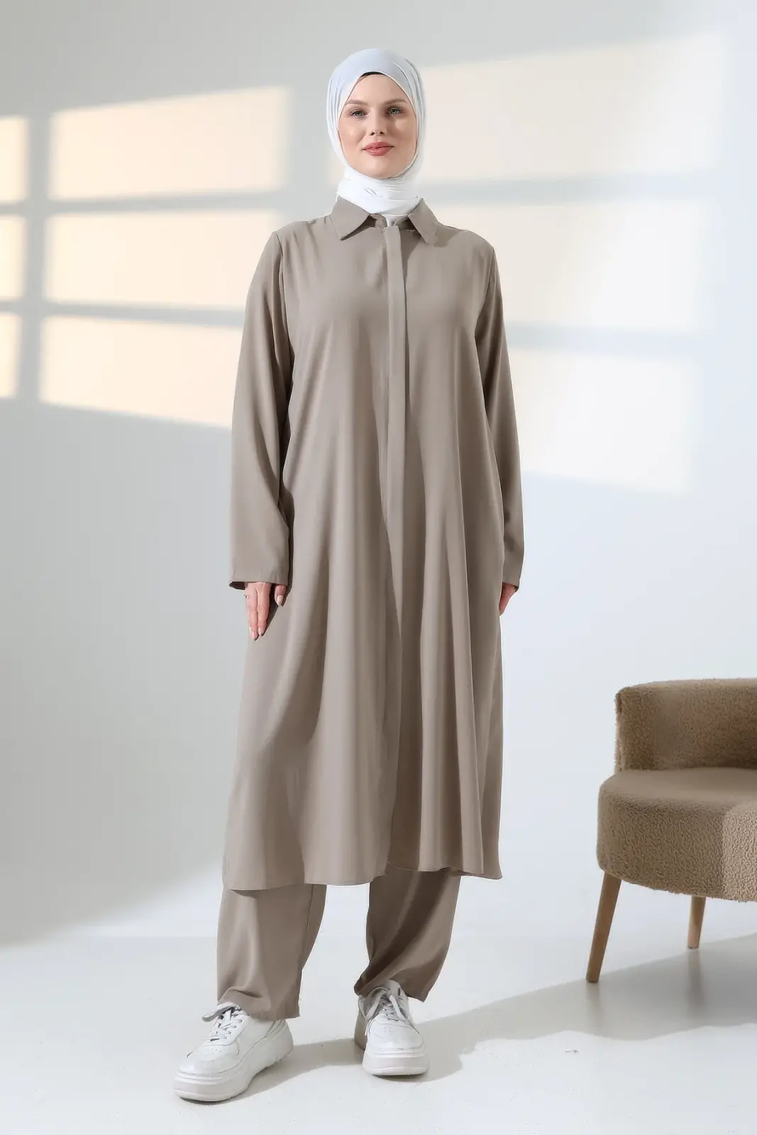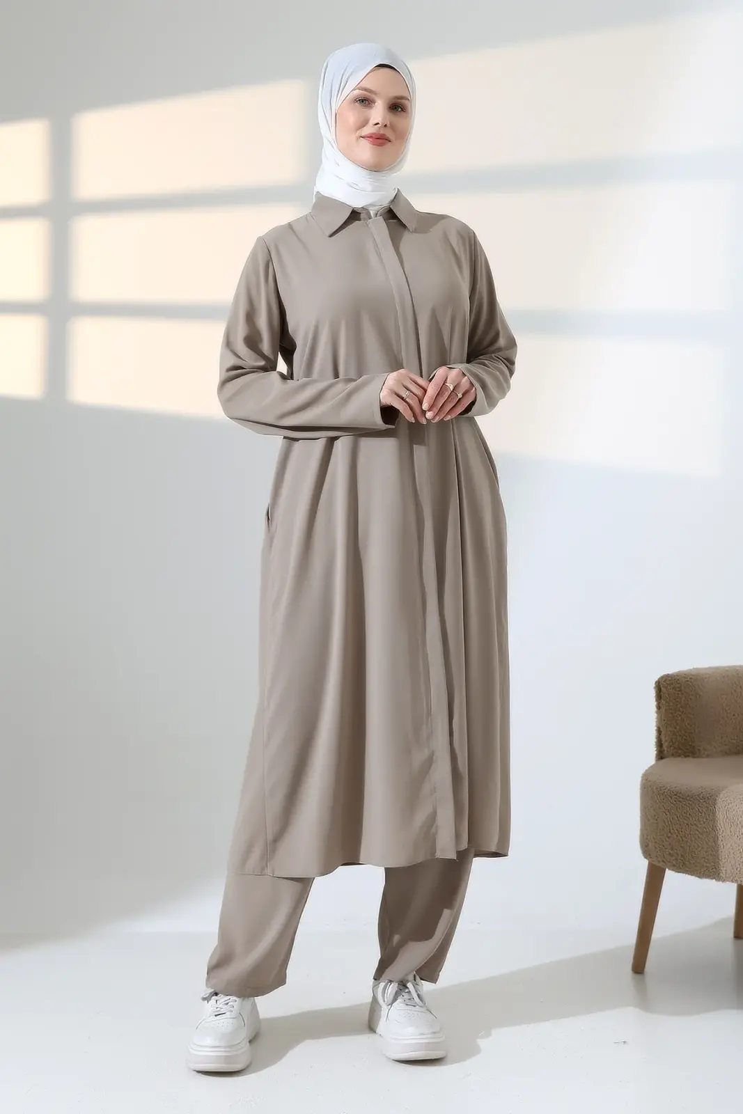 Kadın Hac ve Umre Kıyafeti, Tesettür Cepken Detaylı İkili Takım - Vizon