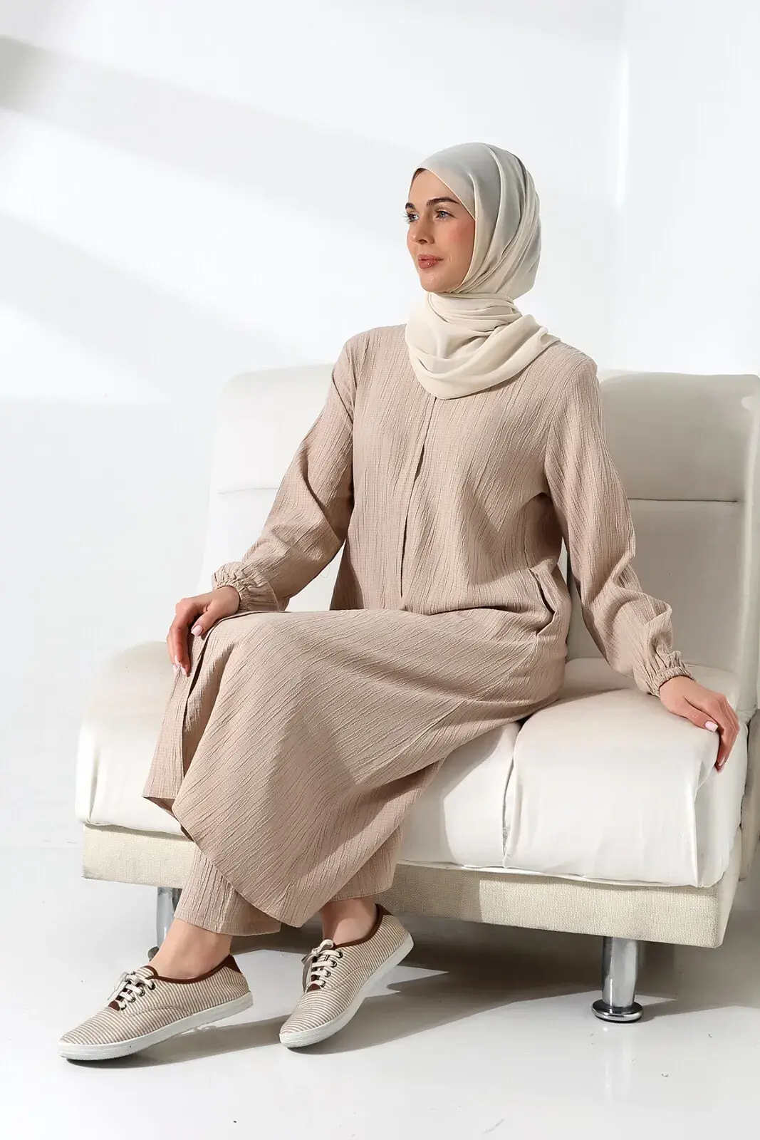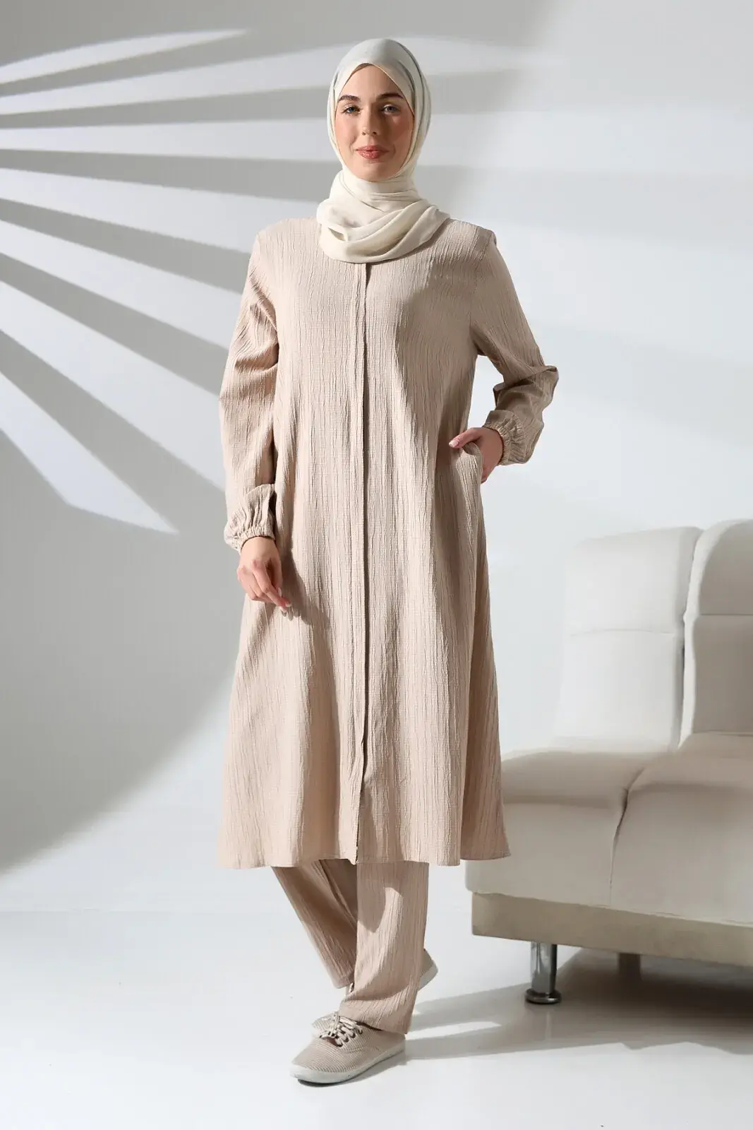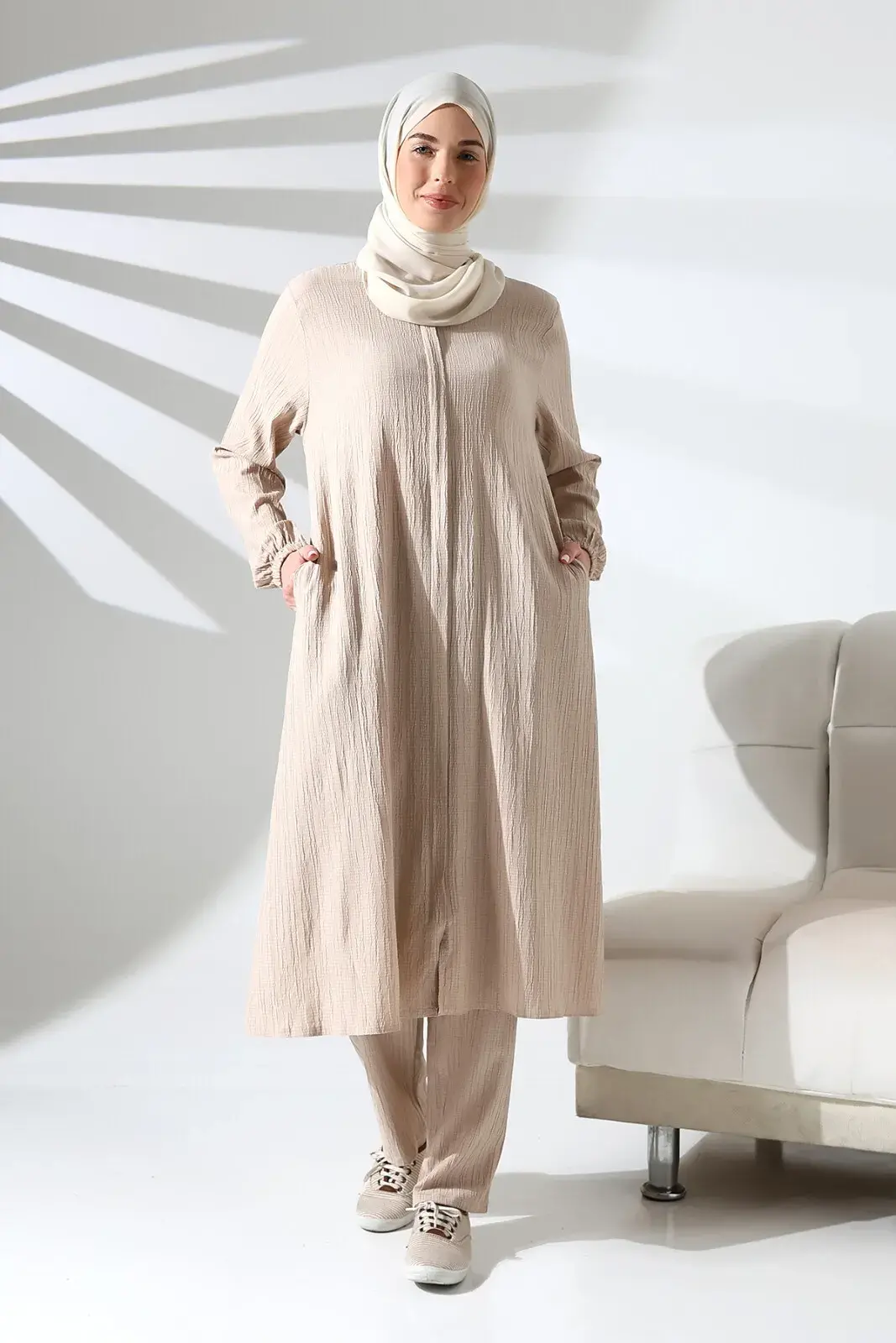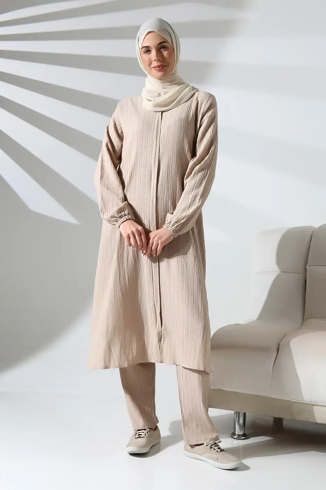 Kadın Bürümcük Kumaş Gizli Fermuarlı İkili Takım Hac Umre Kıyafeti Krem