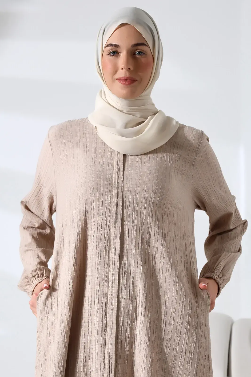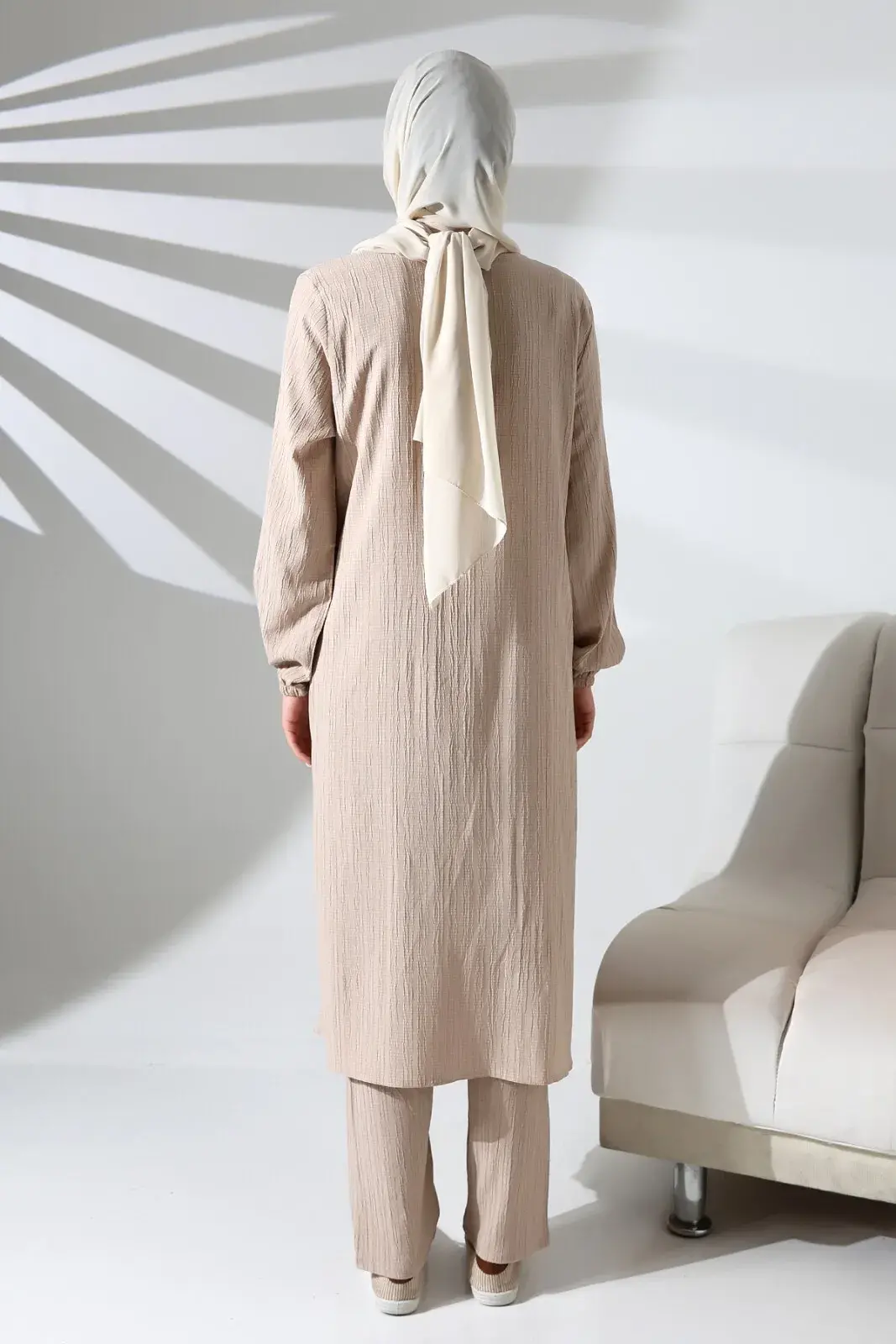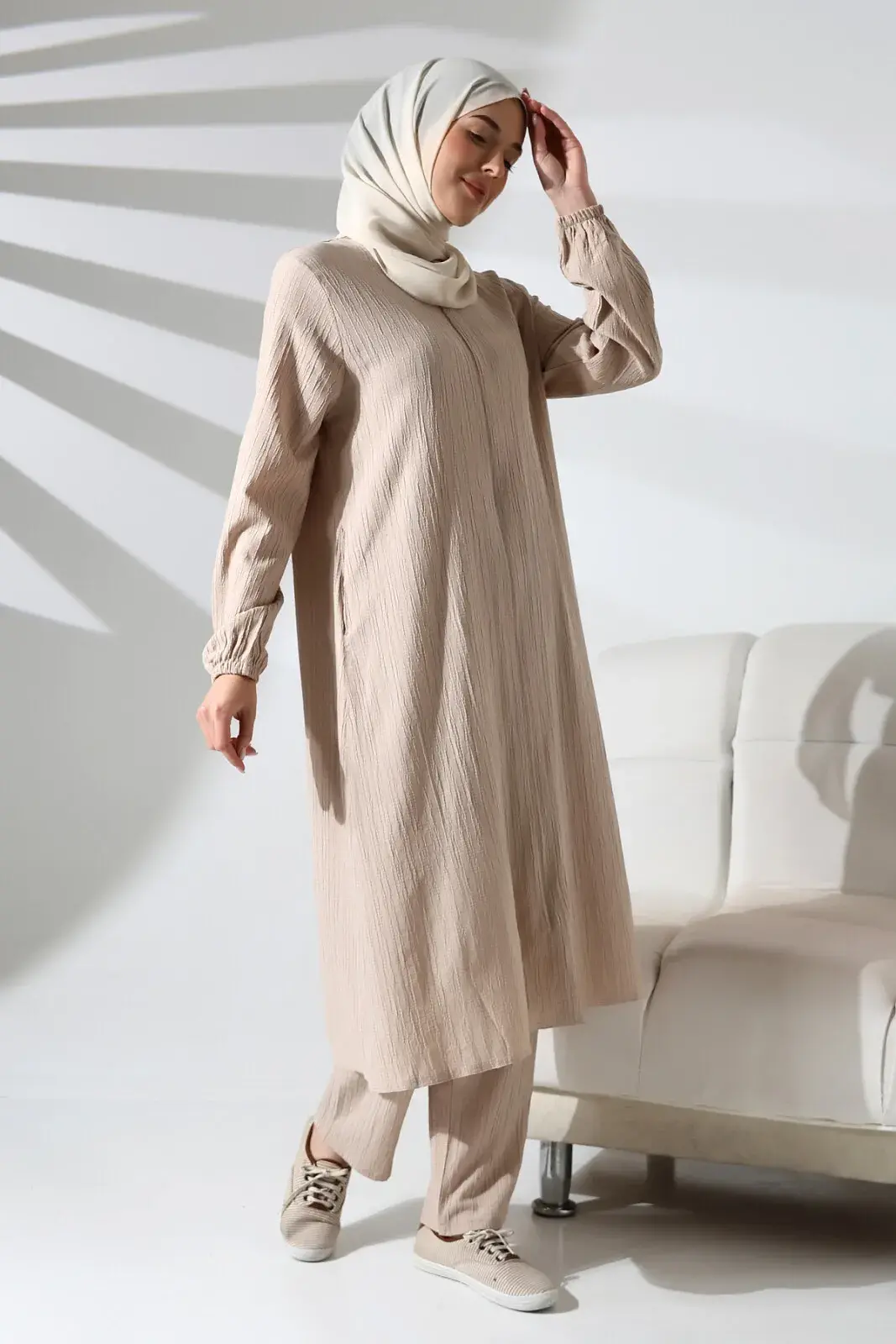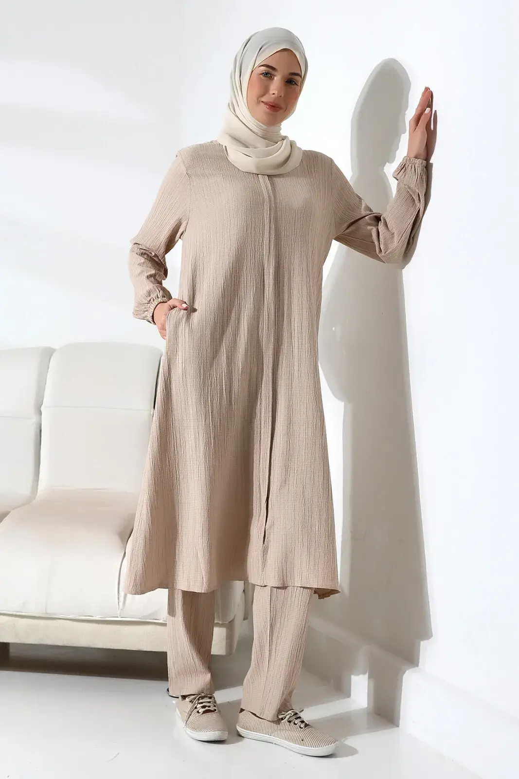 Kadın Bürümcük Kumaş Gizli Fermuarlı İkili Takım Hac Umre Kıyafeti Krem