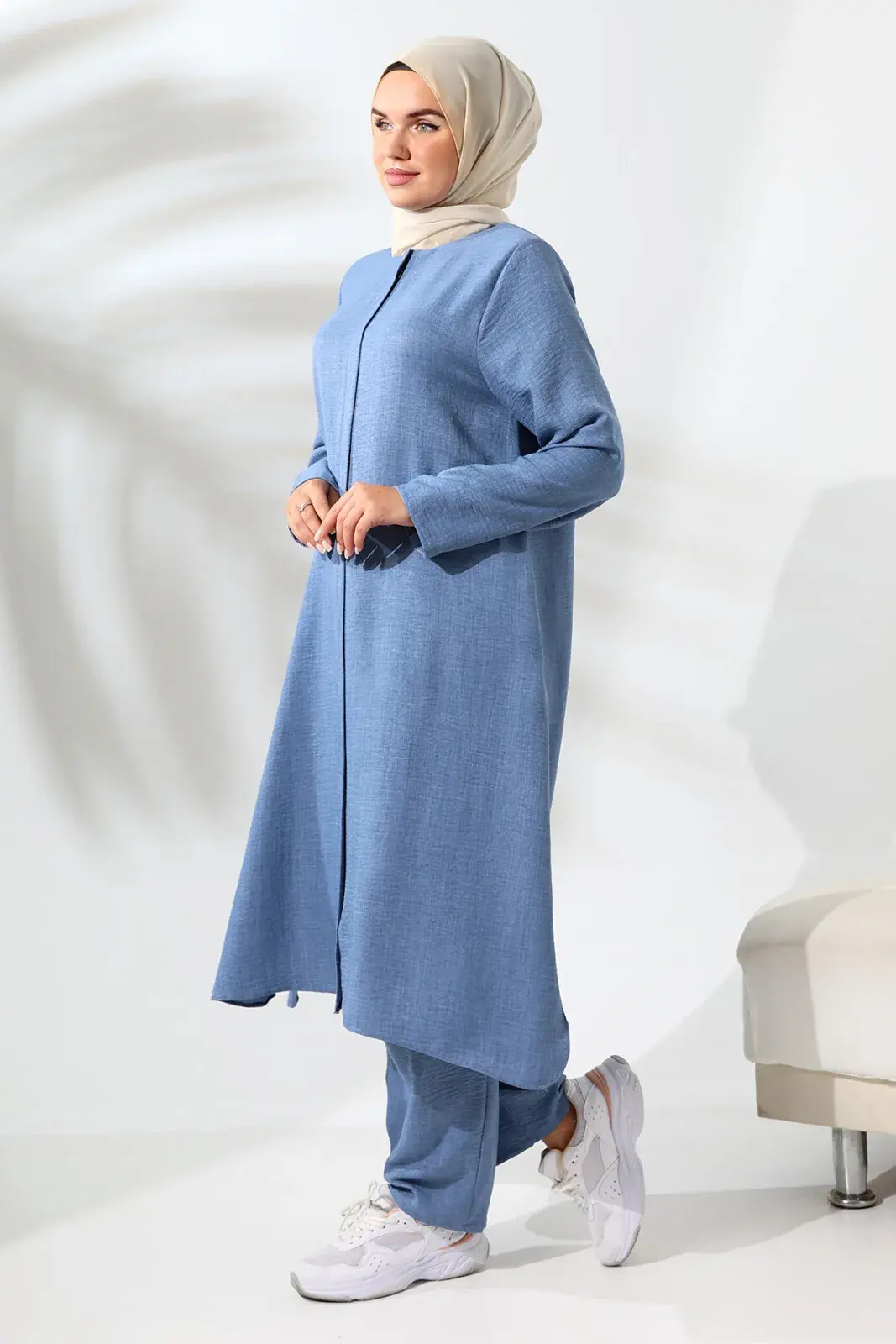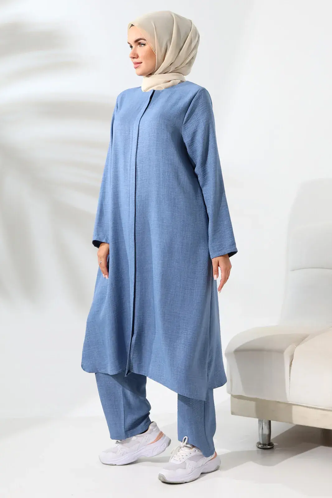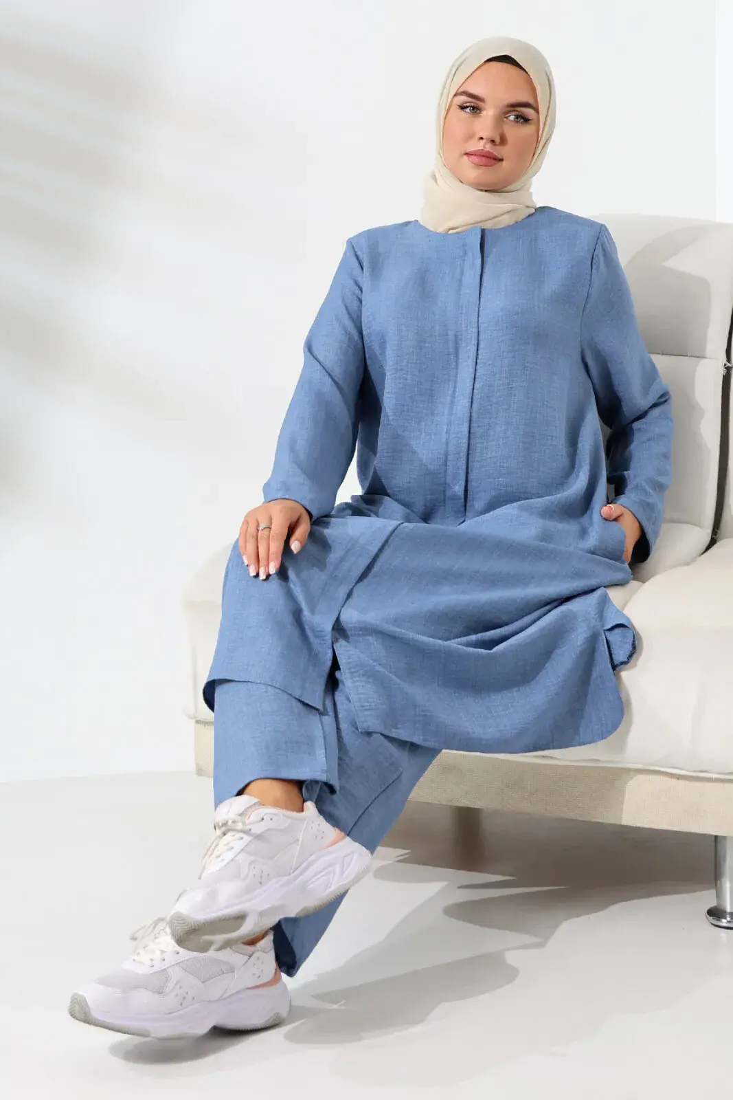 Kadın Mavi Melanj Keten Görünümlü Gizli Fermuarlı Hac Umre Kıyafeti Tesettür İkili Takım