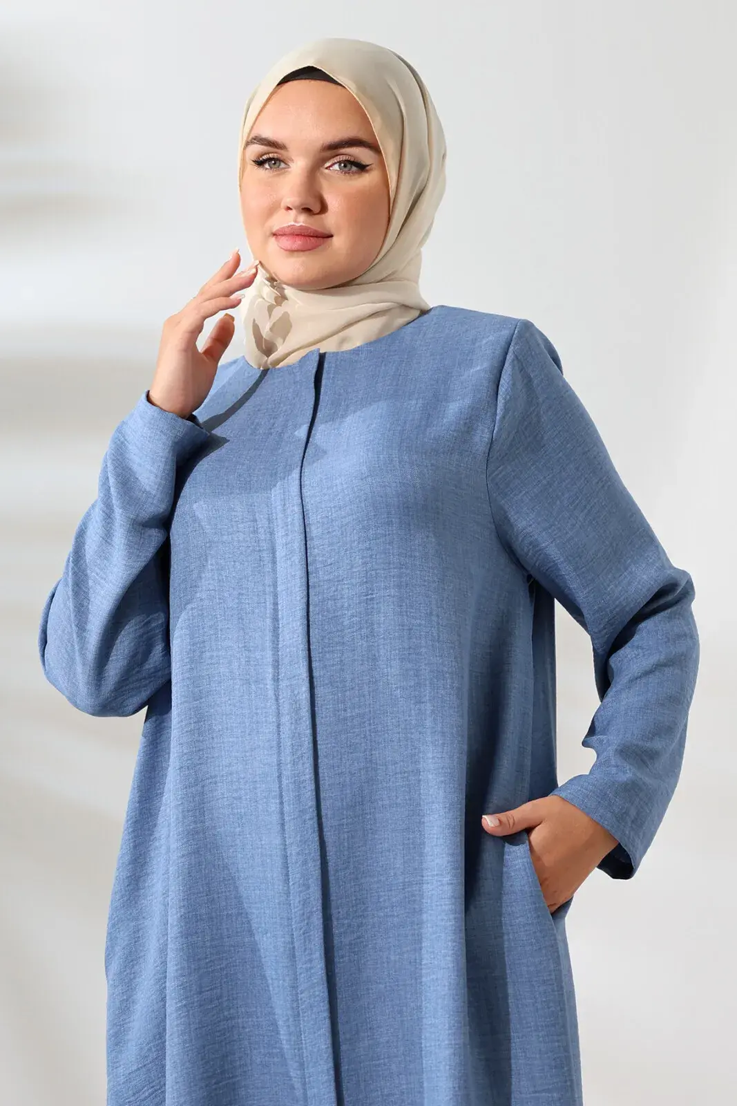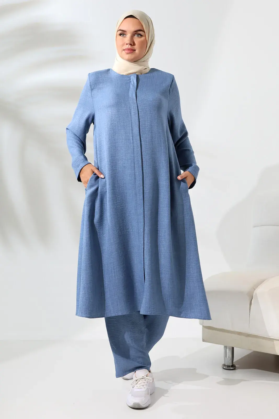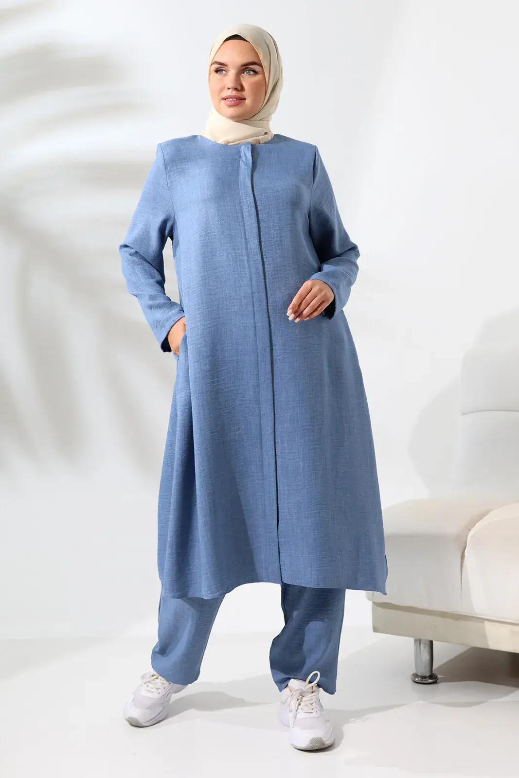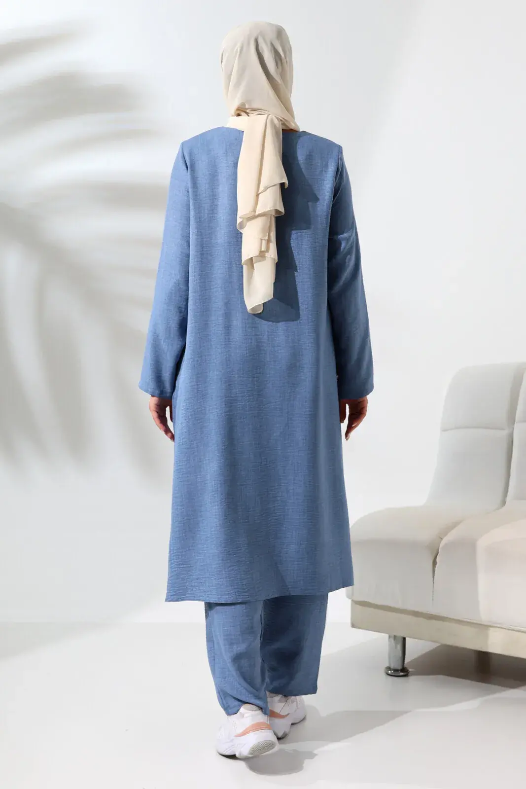 Kadın Mavi Melanj Keten Görünümlü Gizli Fermuarlı Hac Umre Kıyafeti Tesettür İkili Takım