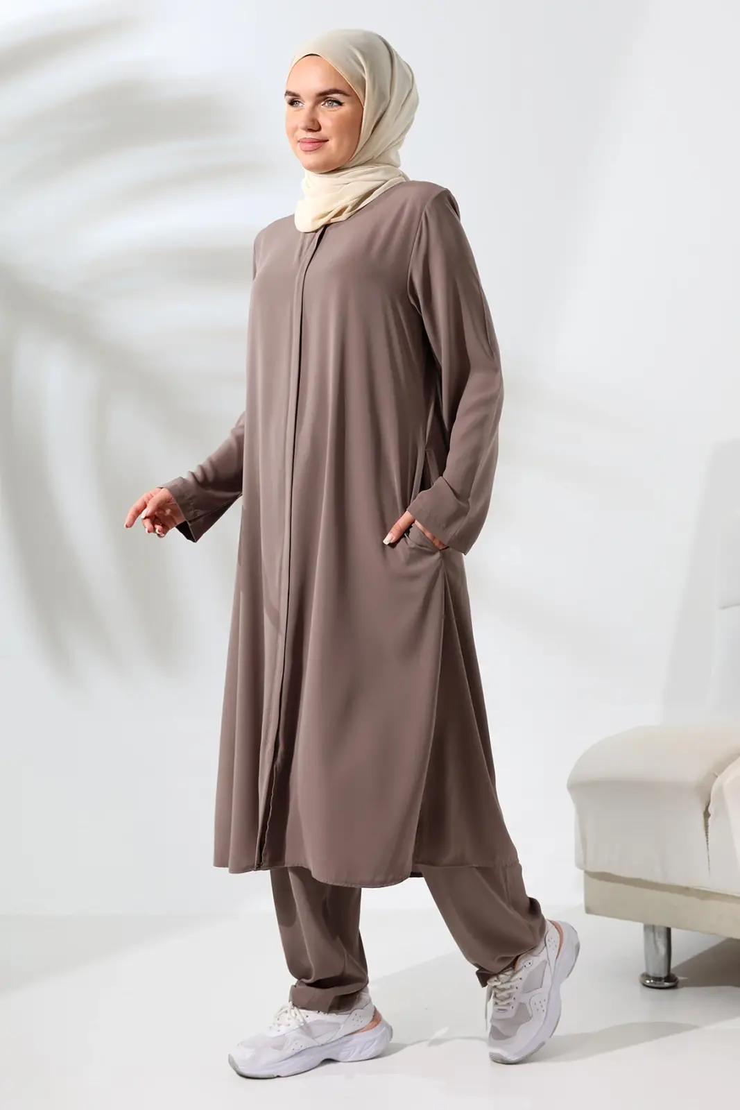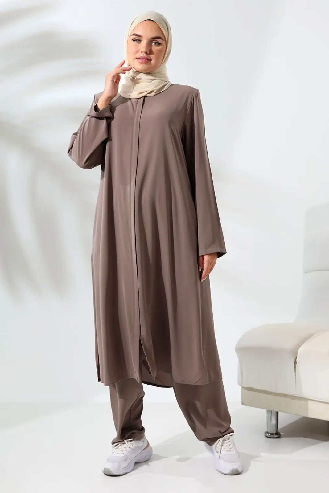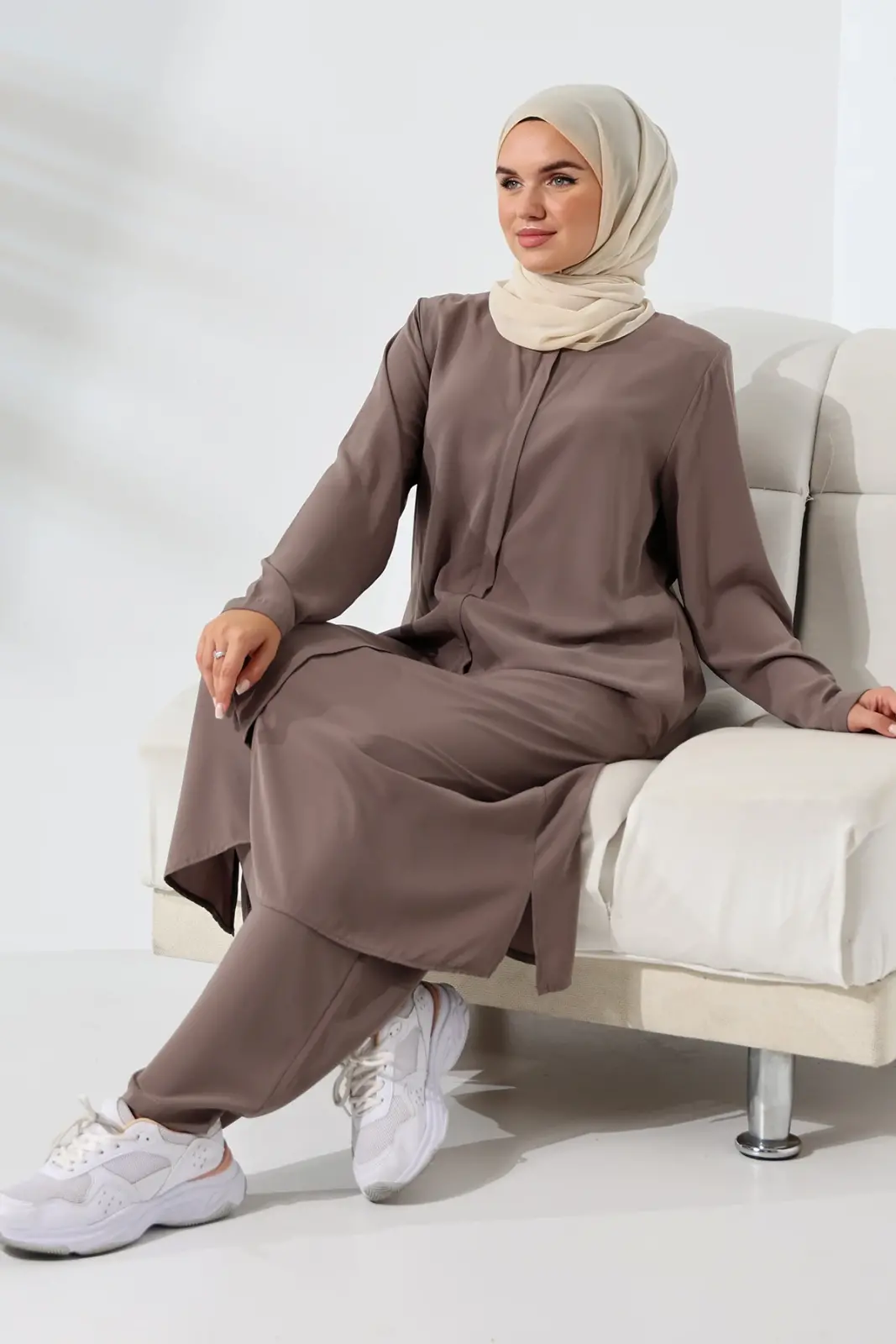 Kadın Medine İpeği Hac Umre Kıyafeti Tesettür İkili Takım - Sütlü Kahve