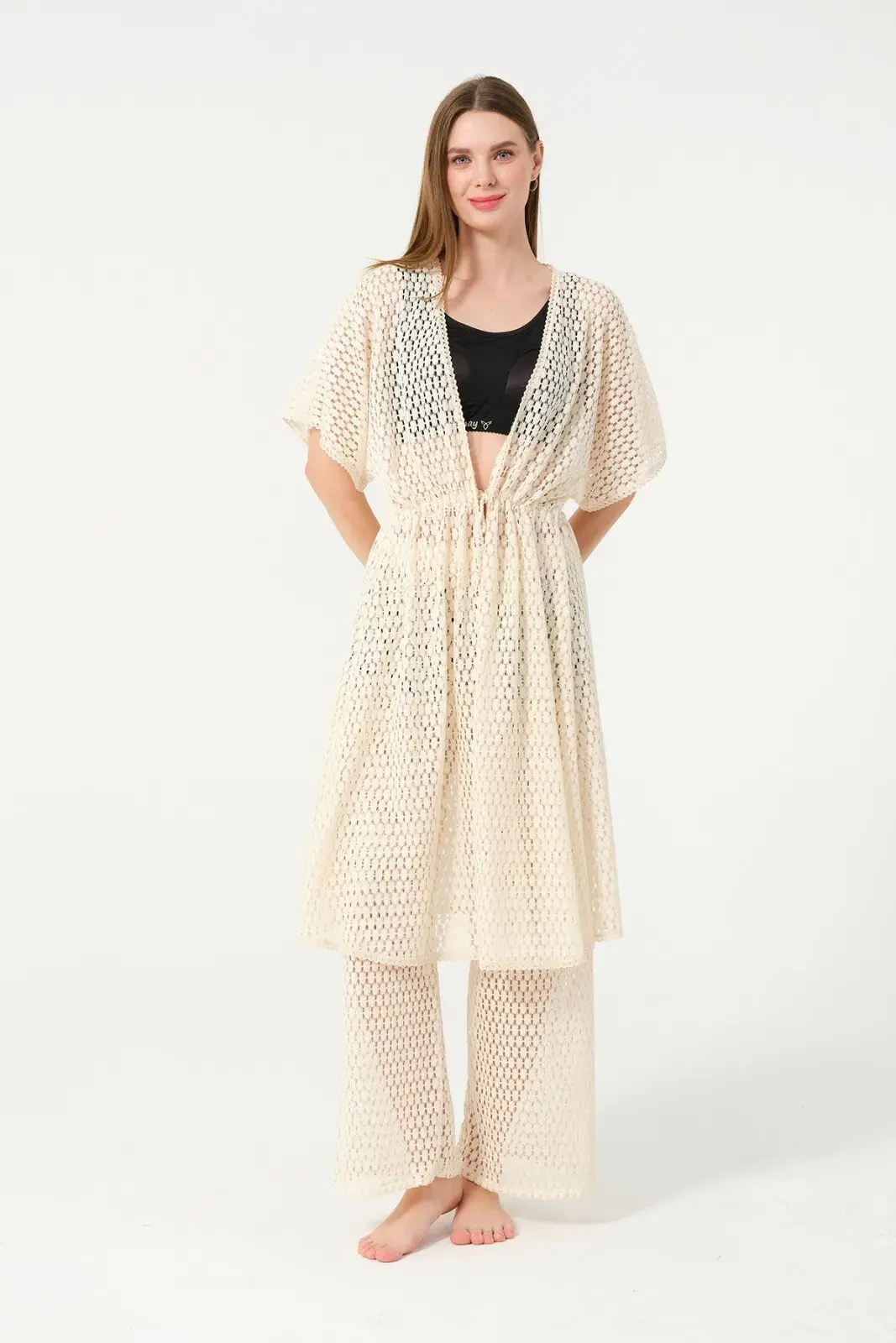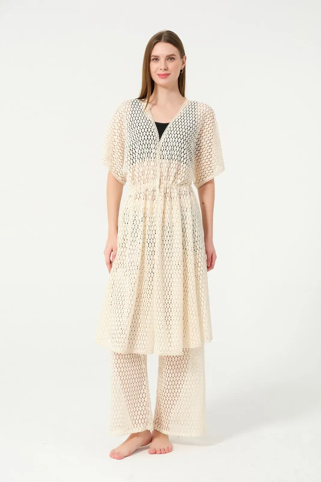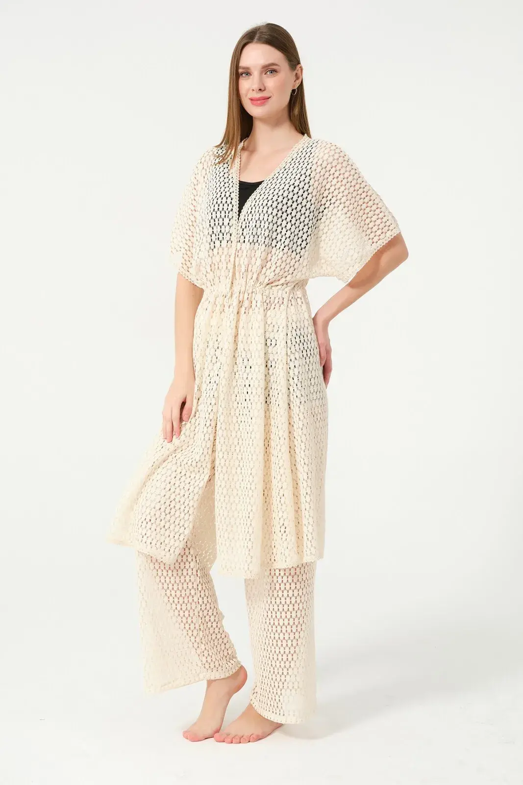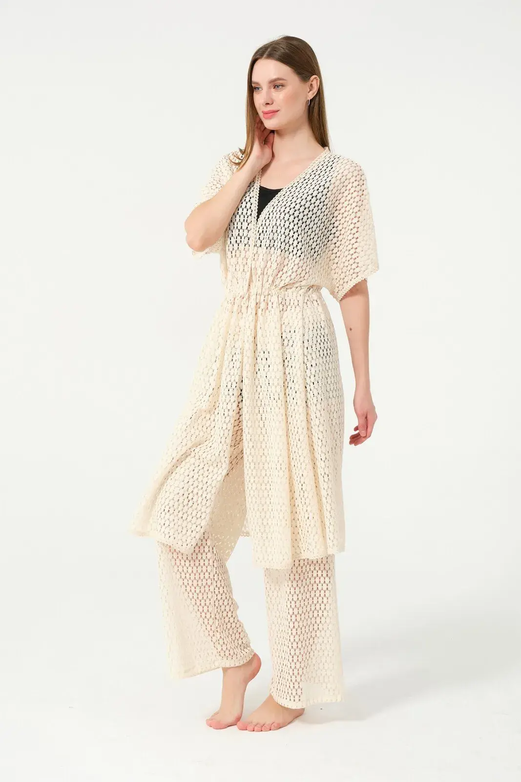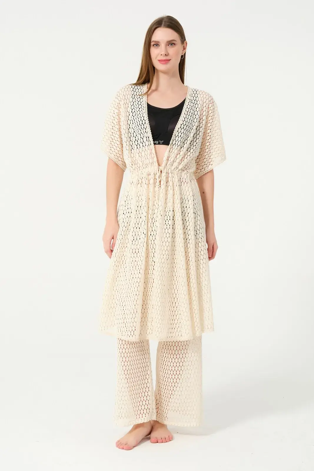 Kadın Örgü Desenli Kemerli Şifon Pareo - 2636-25 Krem