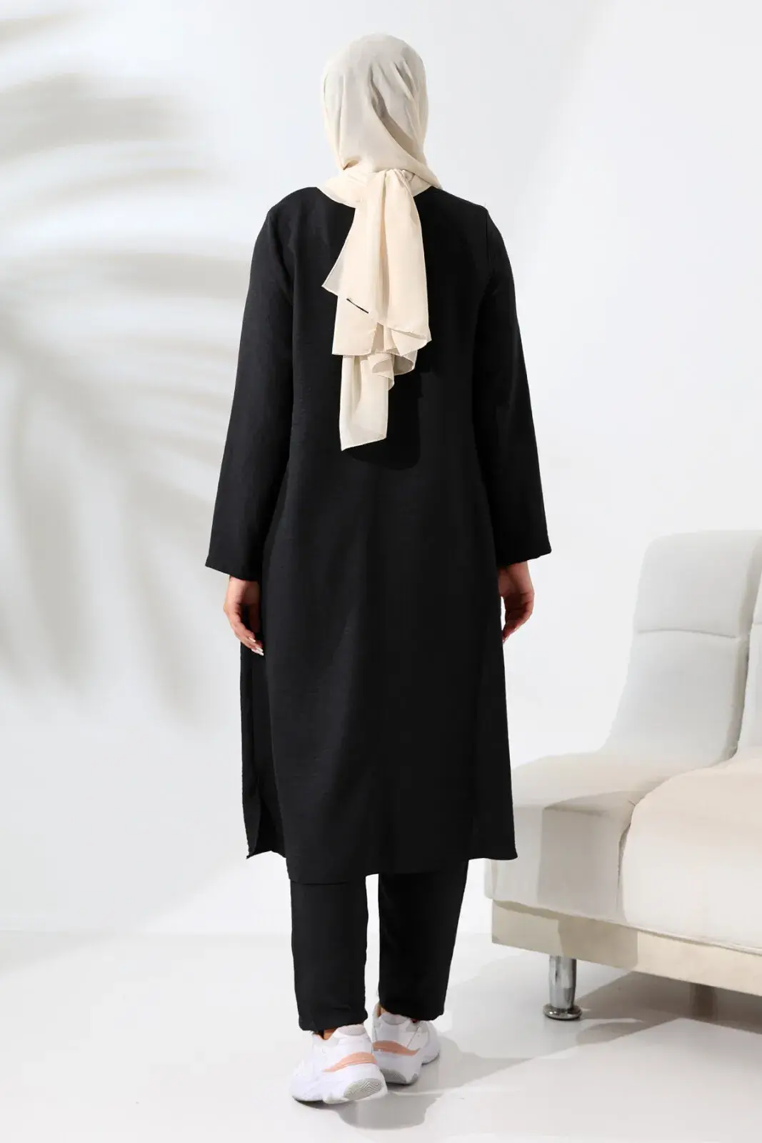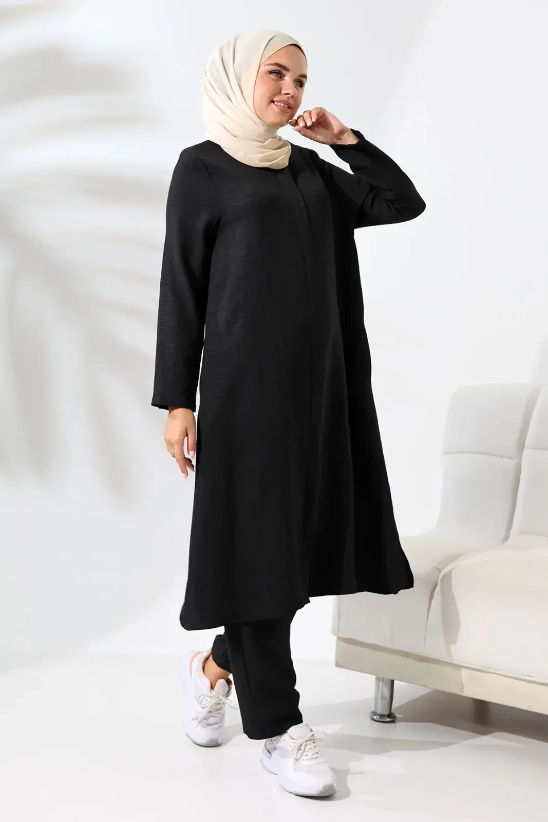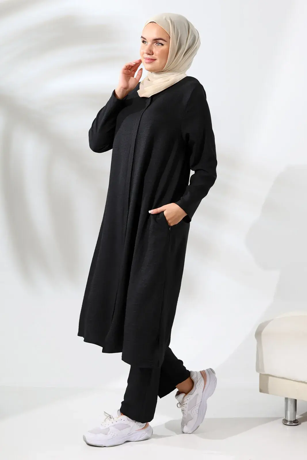 Kadın Siyah Melanj Keten Görünümlü Gizli Fermuarlı Hac Umre Kıyafeti Tesettür İkili Takım