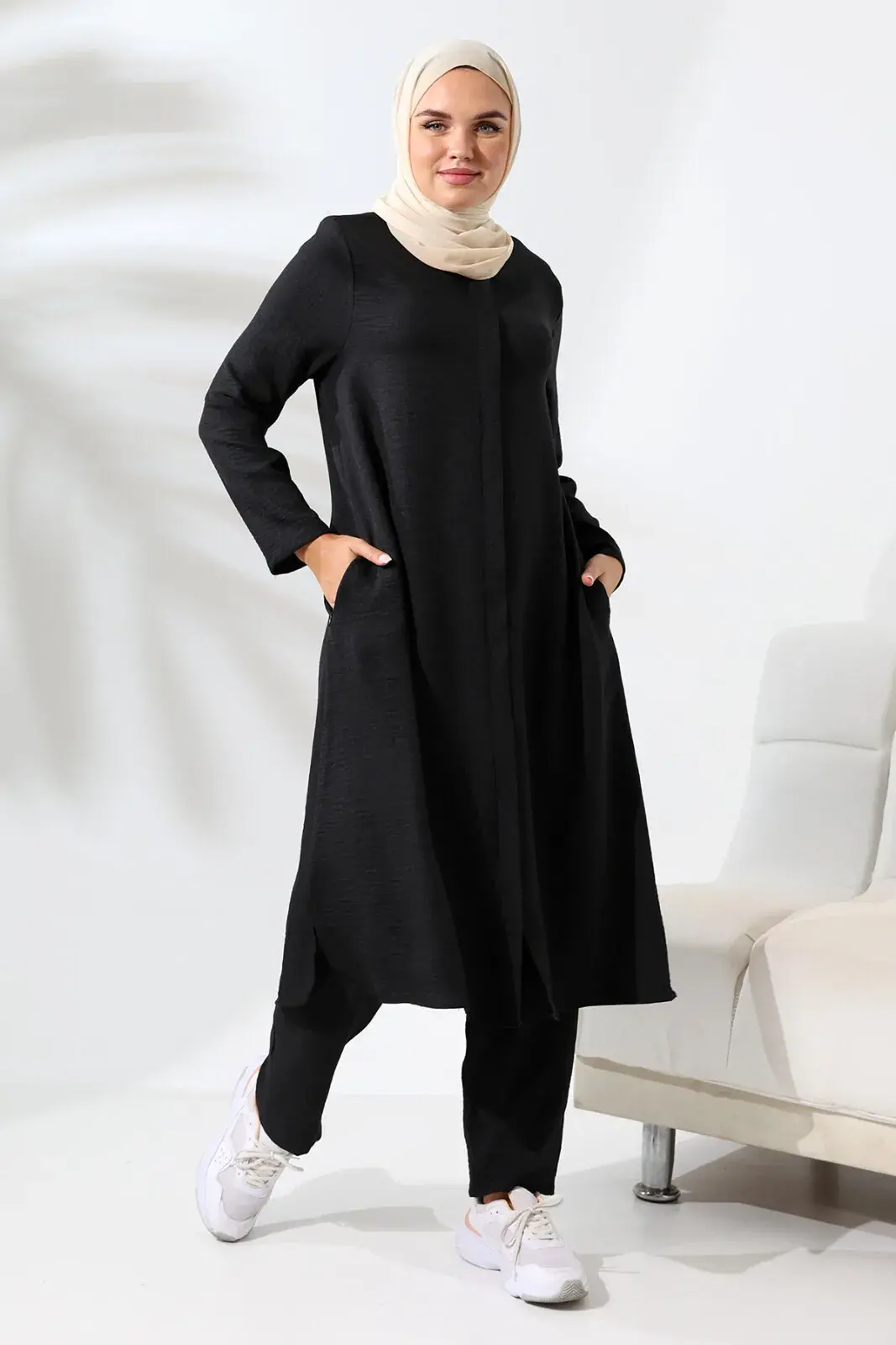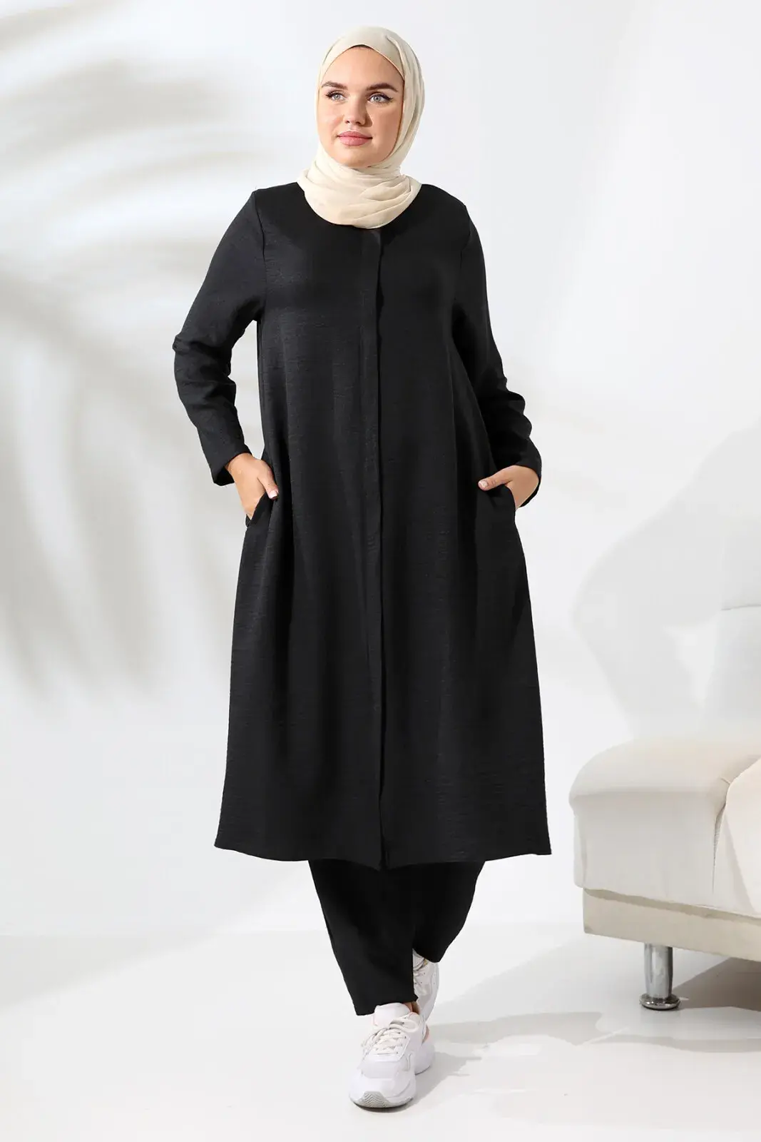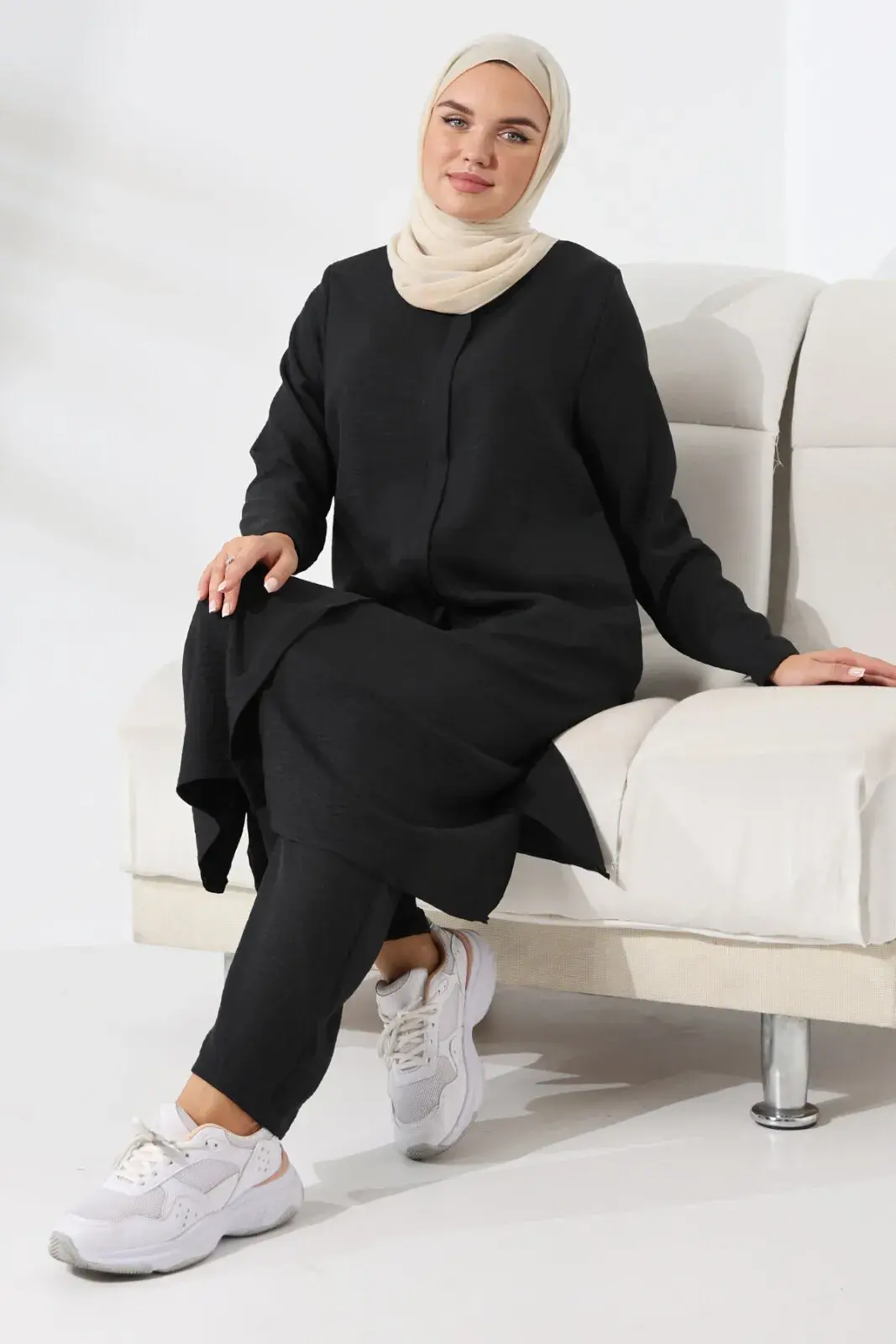 Kadın Siyah Melanj Keten Görünümlü Gizli Fermuarlı Hac Umre Kıyafeti Tesettür İkili Takım