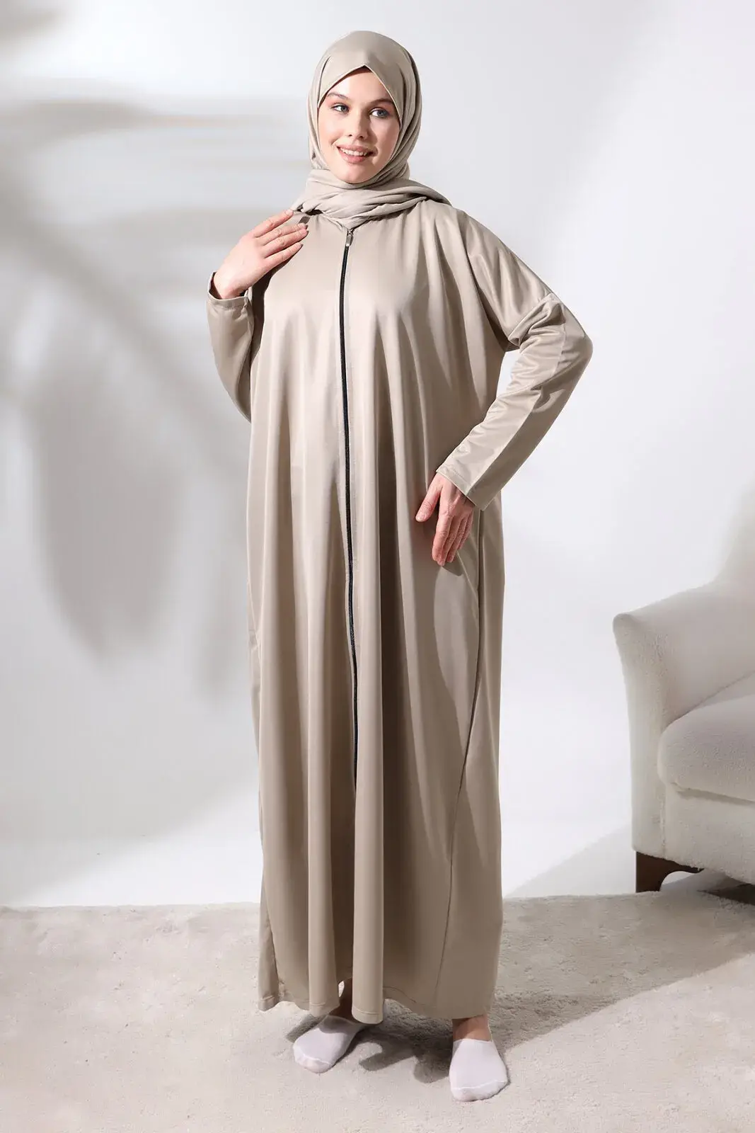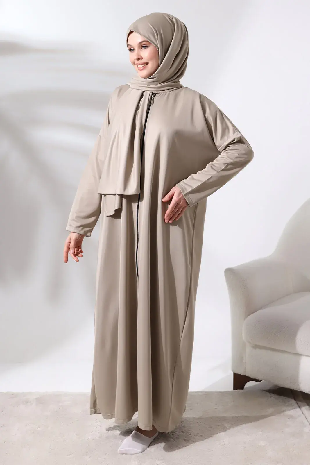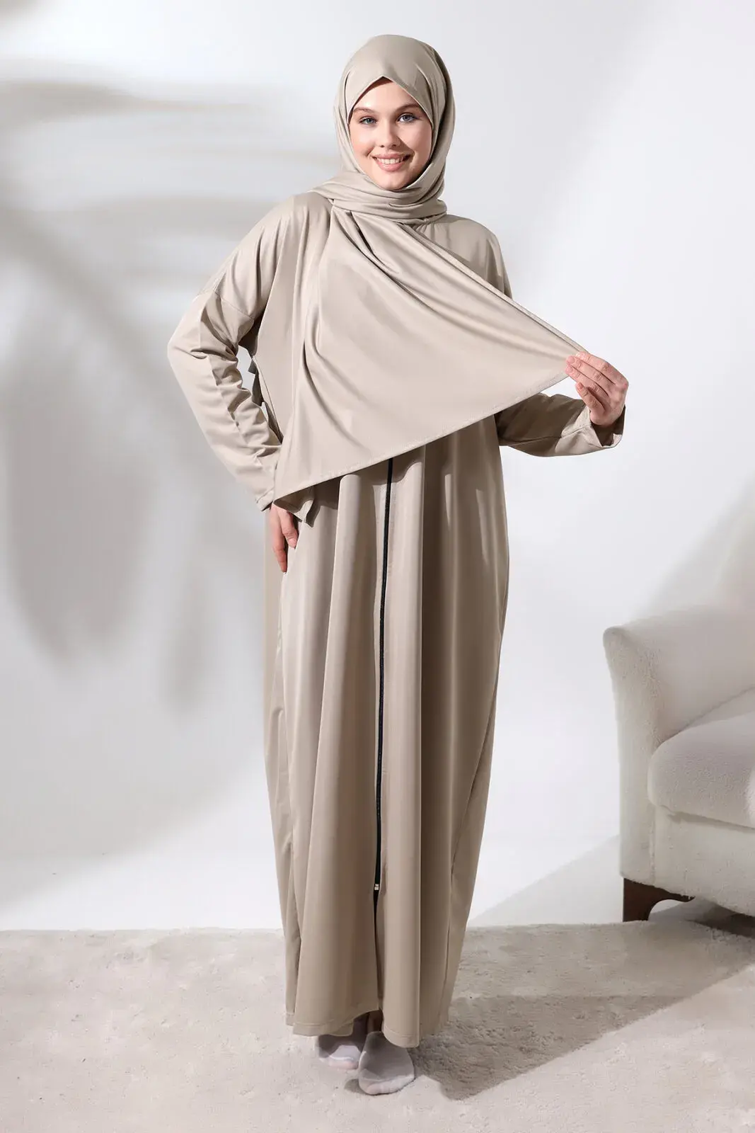 Kadın Tek Parça Fermuarlı Başörtülü Namaz Elbisesi Vizon