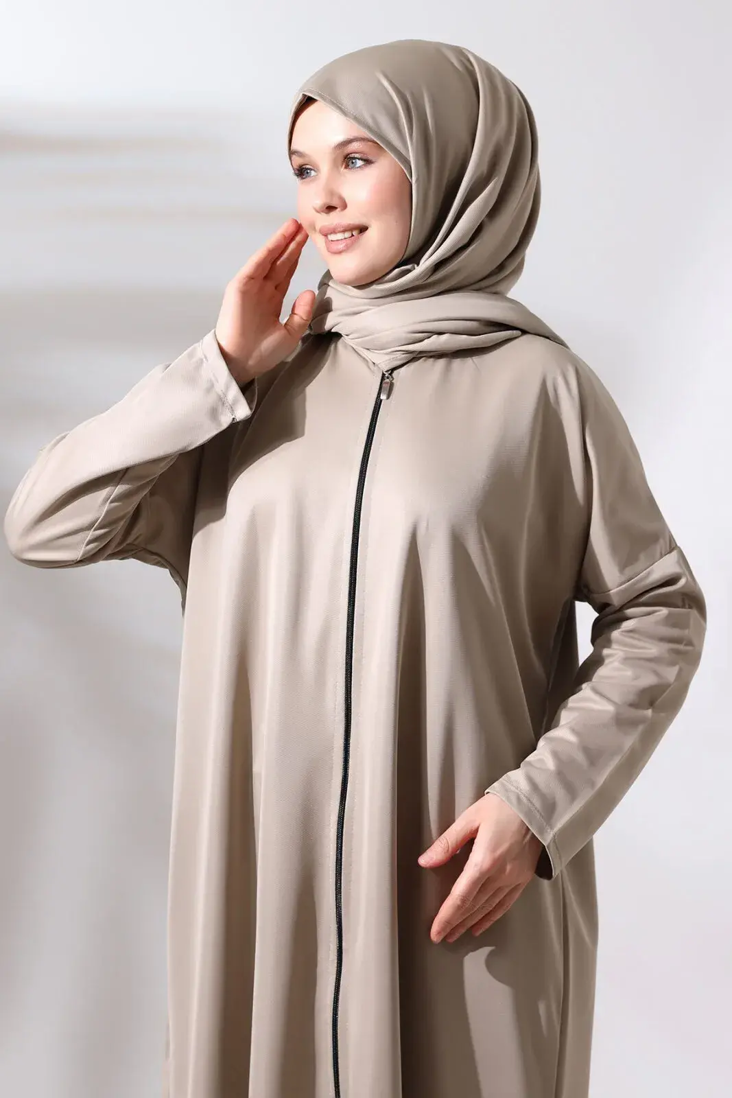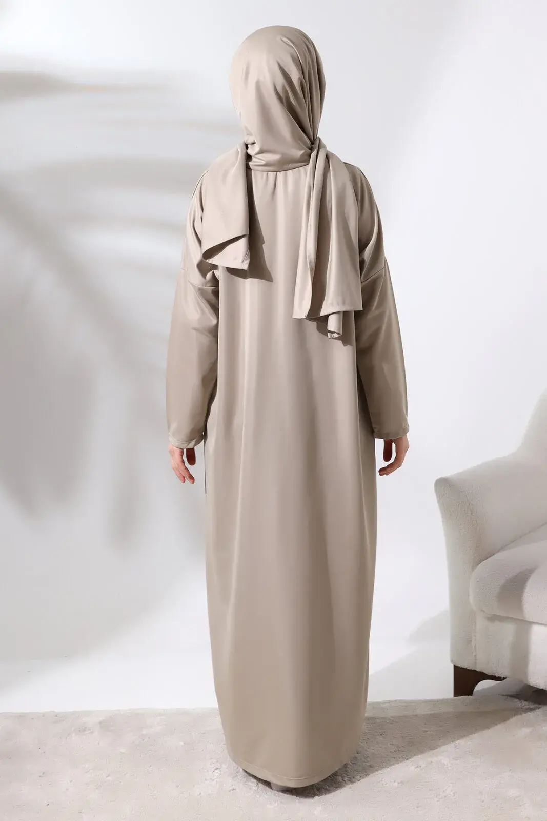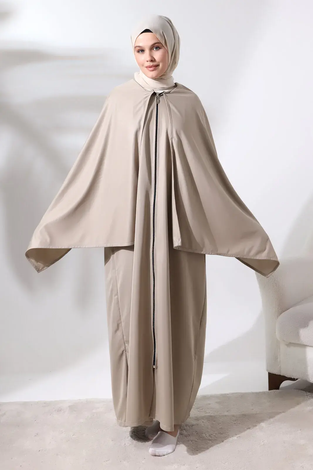 Kadın Tek Parça Fermuarlı Başörtülü Namaz Elbisesi Vizon