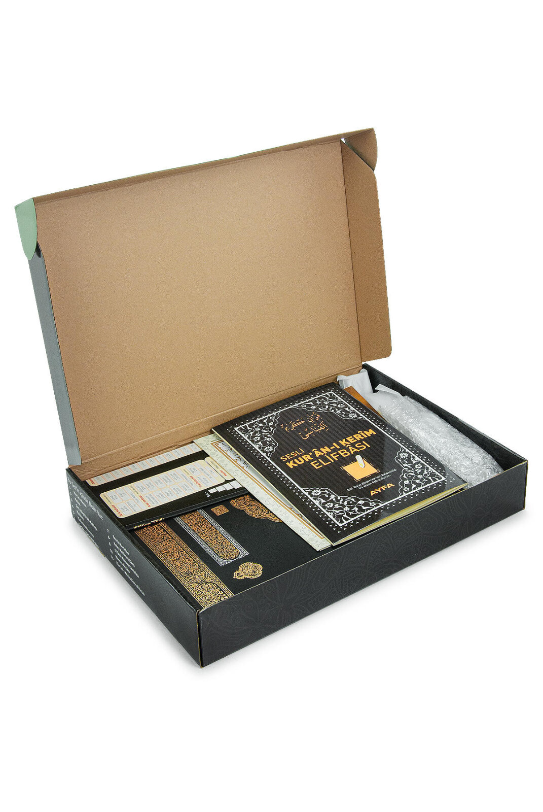 Set içerisinde bulunan Kur’an-ı Kerim, Elifba kitabı, Tecvid kitabı ve namaz hocası kitapçığı sayesinde temel dini bilgiler ve Kur’an okuma kuralları öğrenilebilir. Hem eğitim hem de manevi hediye olarak tercih edilen bu set, özellikle Kur’an öğrenmeye başlayanlar için oldukça kullanışlıdır.