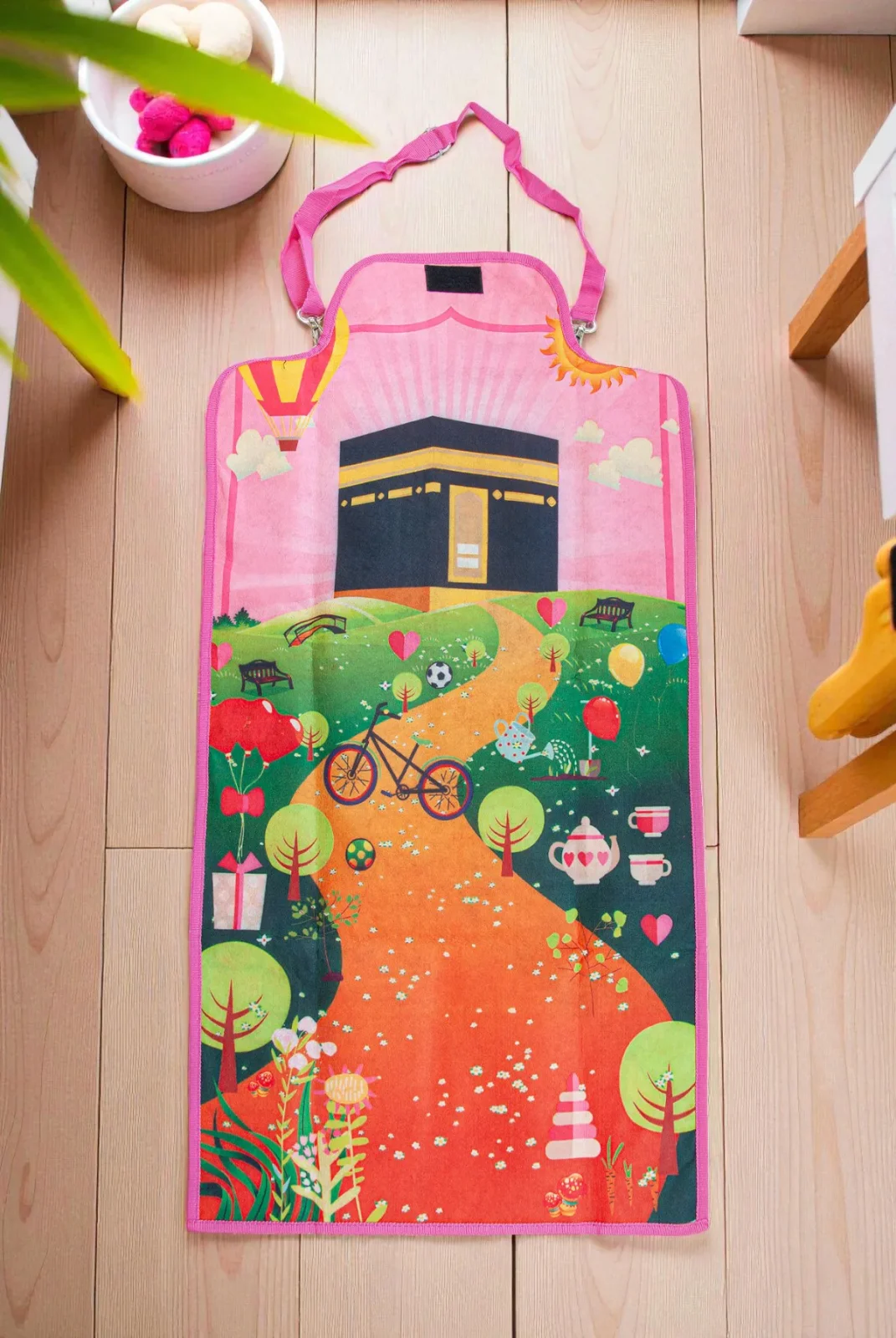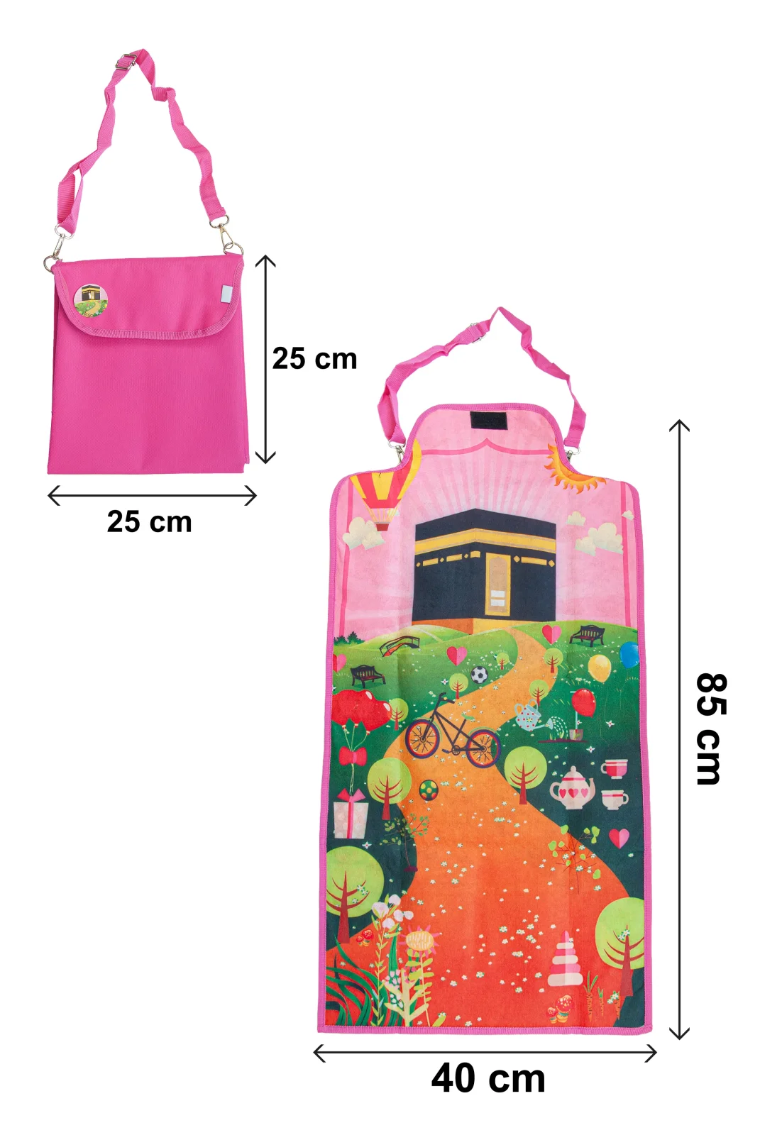 Bu çocuk seccadesi, açıldığında tam boy seccade; katlandığında ise omuzda taşınabilir sevimli bir çantaya dönüşür. Renkleri ve şirin desenleriyle çocuklarının ilgisini çekerken, ibadete olan sevgiyi ve merakı artırır.