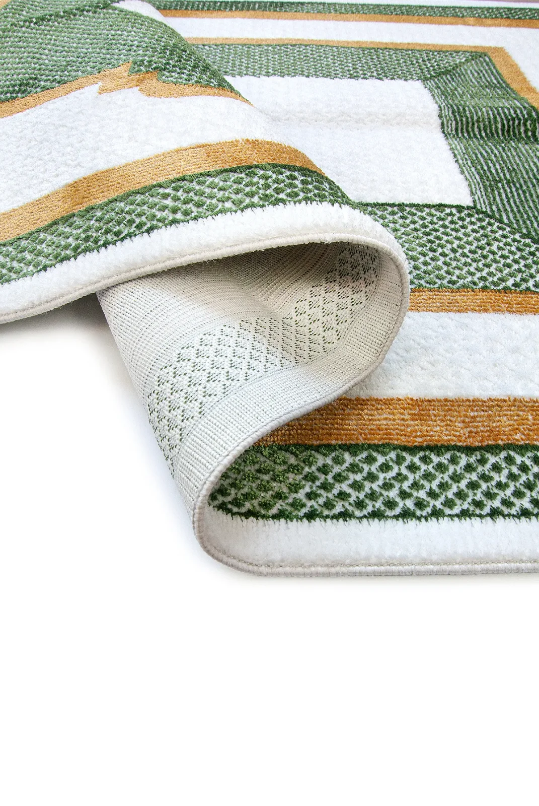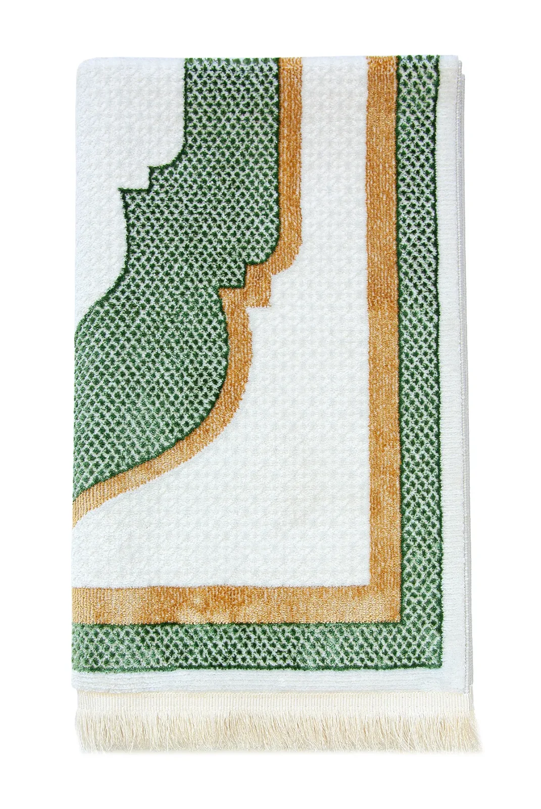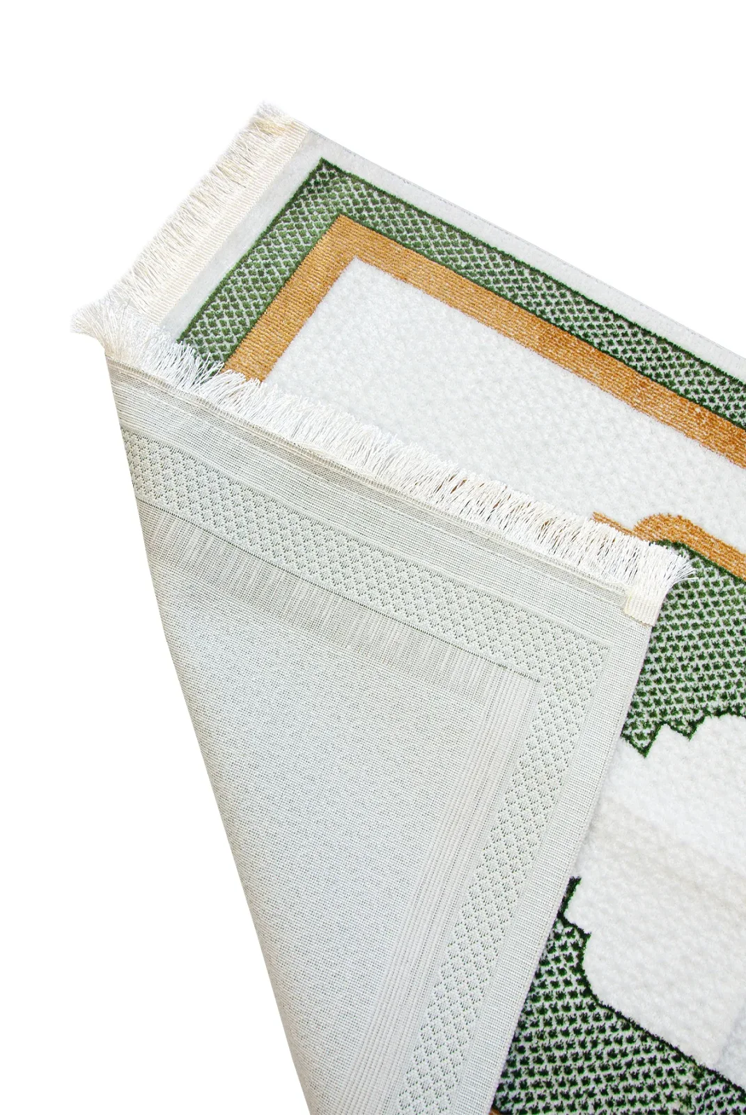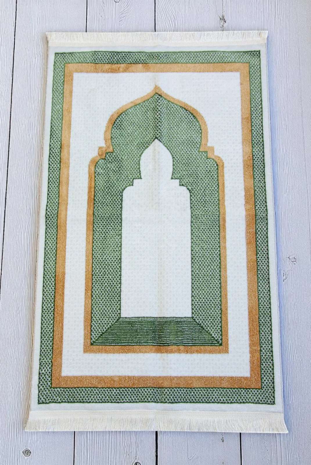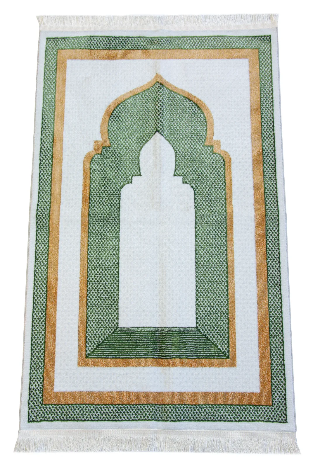 Kervansaray lüks dokuma seccade, %90 polyester ve %10 pamuk karışımıyla dayanıklı ve yumuşak bir doku sunar. 70x115 cm ölçüsü ve beyaz mihrap desenli şık tasarımıyla ibadetlerinize huzur katar.