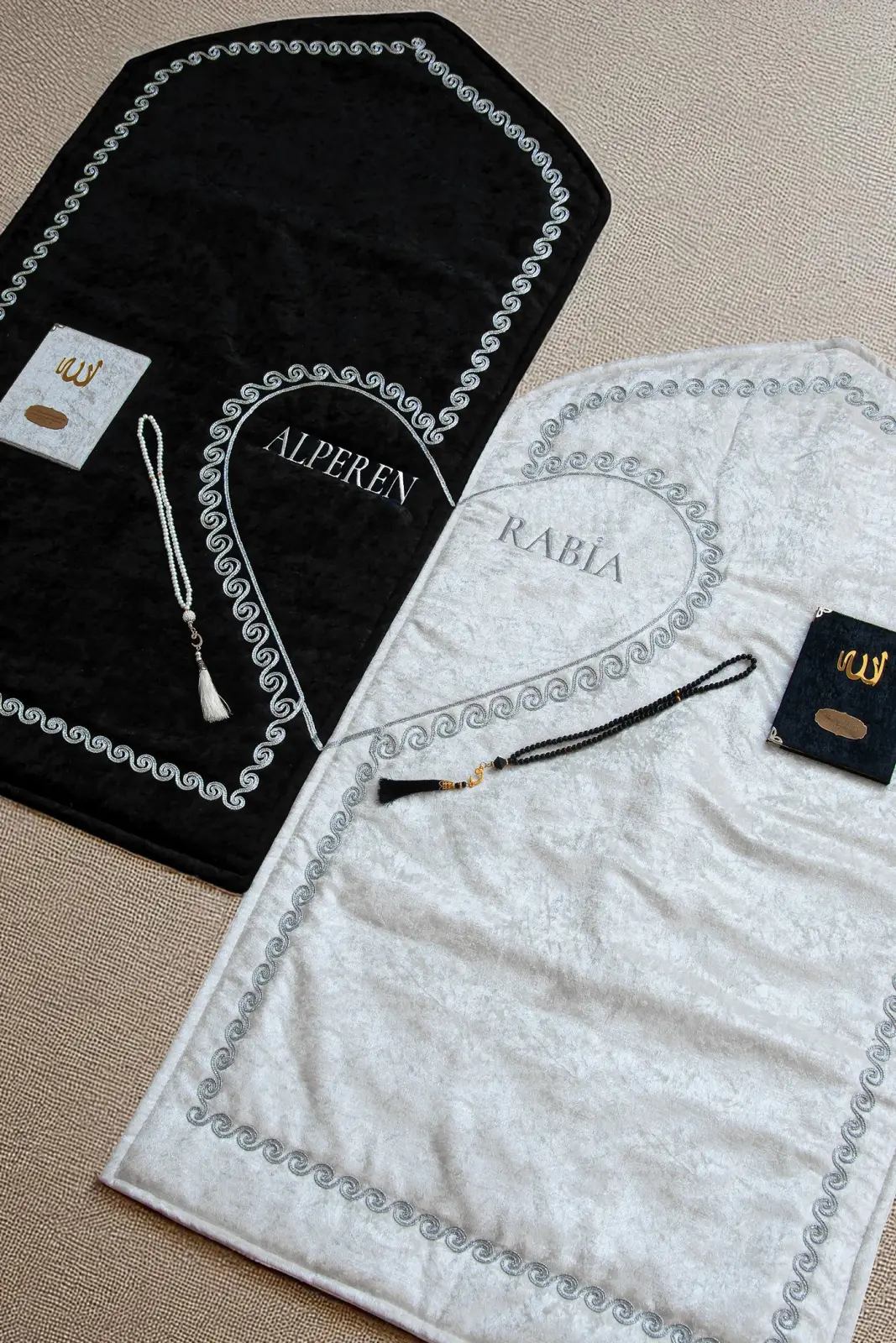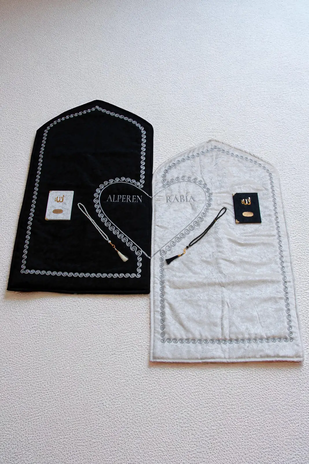 Her bir seccade yüksek kaliteli kadife kumaştan üretilmiştir ve gümüş renkli parlak varak işlemeleri ile şıklık kazanmıştır. Setin içerisinde isim yazılı Yasin-i Şerif kitabı ve tesbih de bulunmaktadır.