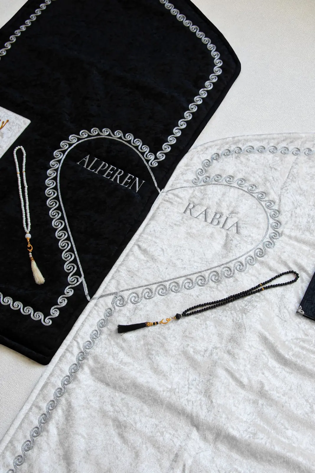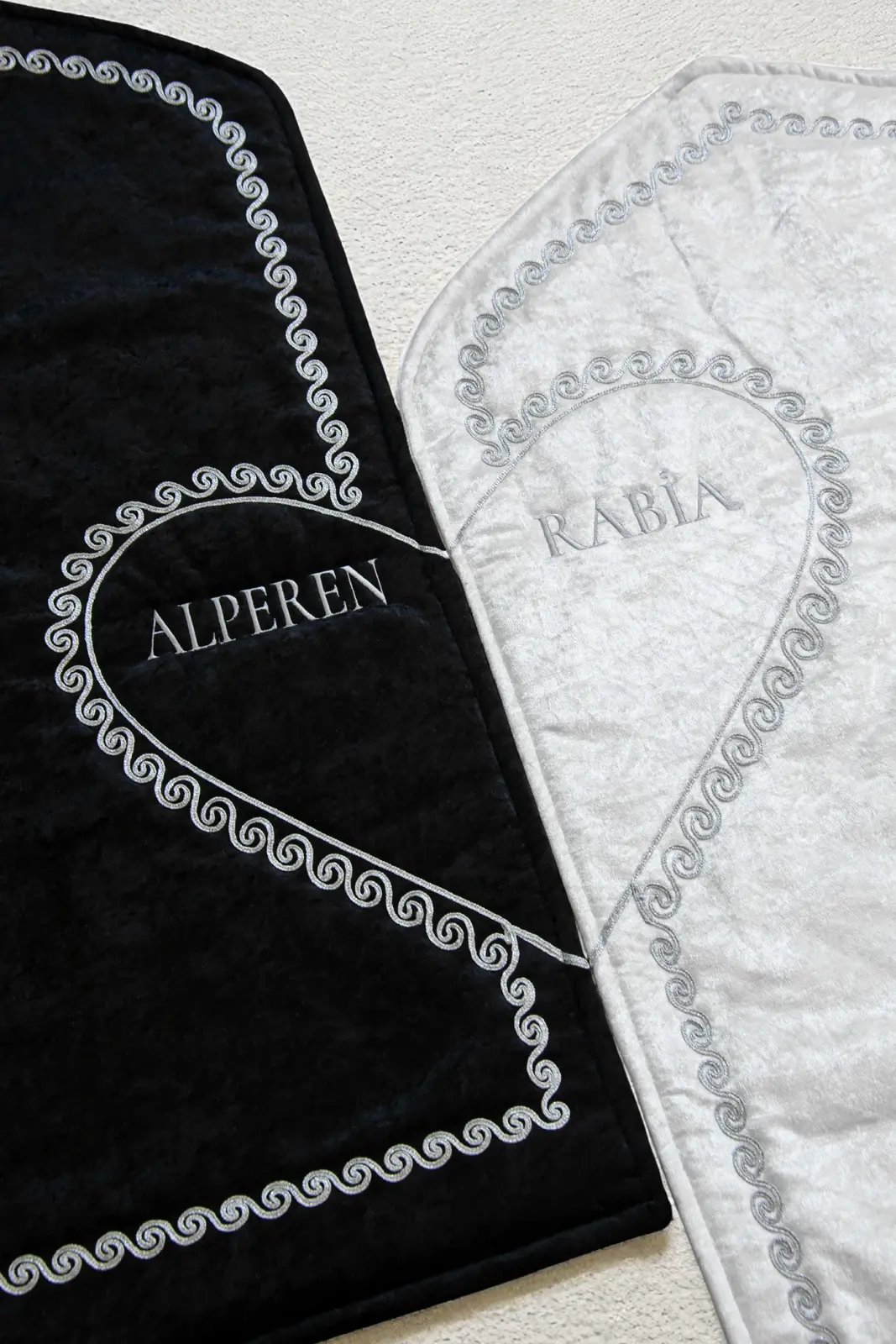 Özel günlerinize anlam katmak için özenle hazırlanmıştır. Siyah ve beyaz rengi seçenekleriyle sunulan bu zarif seccadeler, kalp motifi ile çiftlere özel bir uyum sergiler. İsim yazdırma imkânı sayesinde tamamen kişiselleştirilebilir.