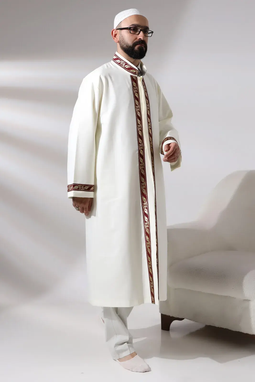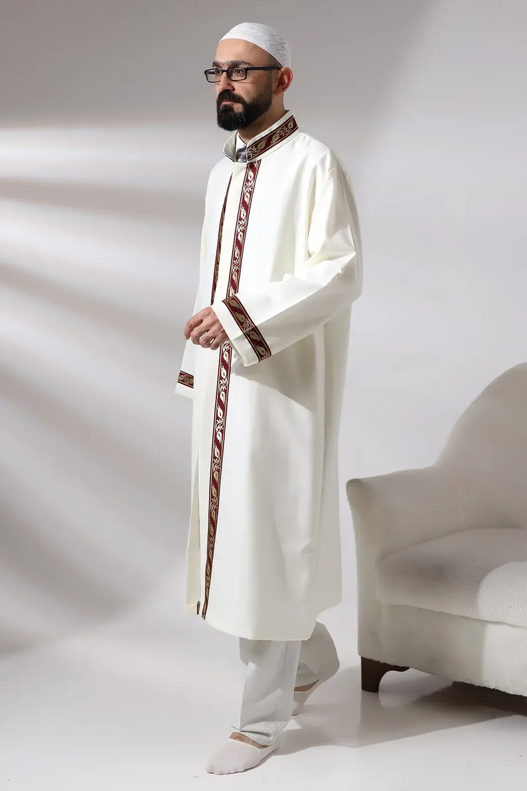 Geleneksel ve sade bir zarafetin birleşimi olan bu İmam Cübbesi, Alpaka pamuklu kumaşı sayesinde ibadet sırasında rahatlık sağlarken, önden kapatmalı gizli çıtçıtlı tasarımı kullanımı kolaylaştırır. Hakim yaka detayı, cübbeye geleneksel bir hava katarak sade bir şıklık sunarken, baklava benzeri nakış işlemeler estetik bir dokunuş ekler. Bu cübbe, ibadetlerde imamların ihtiyaçlarına uygun pratik ve zarif bir seçenek sunar. Geleneksel ve işlevsel tasarımı, imamların görevlerini yerine getirirken rahatlık ve şıklığı bir araya getirir.