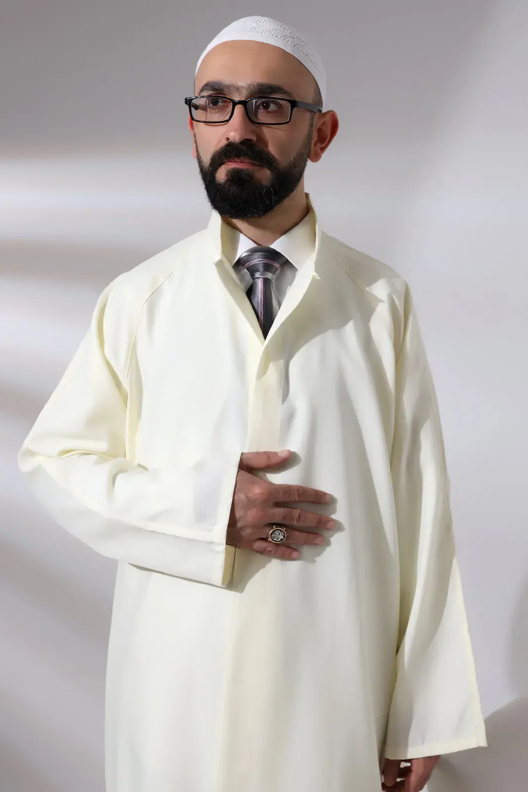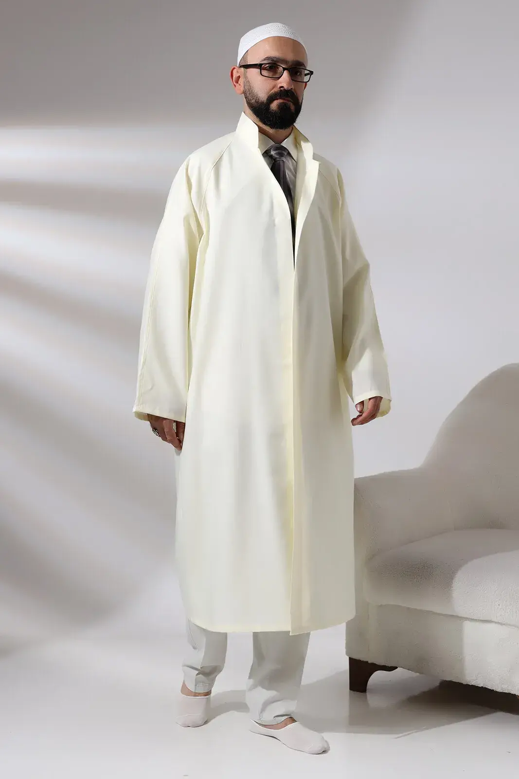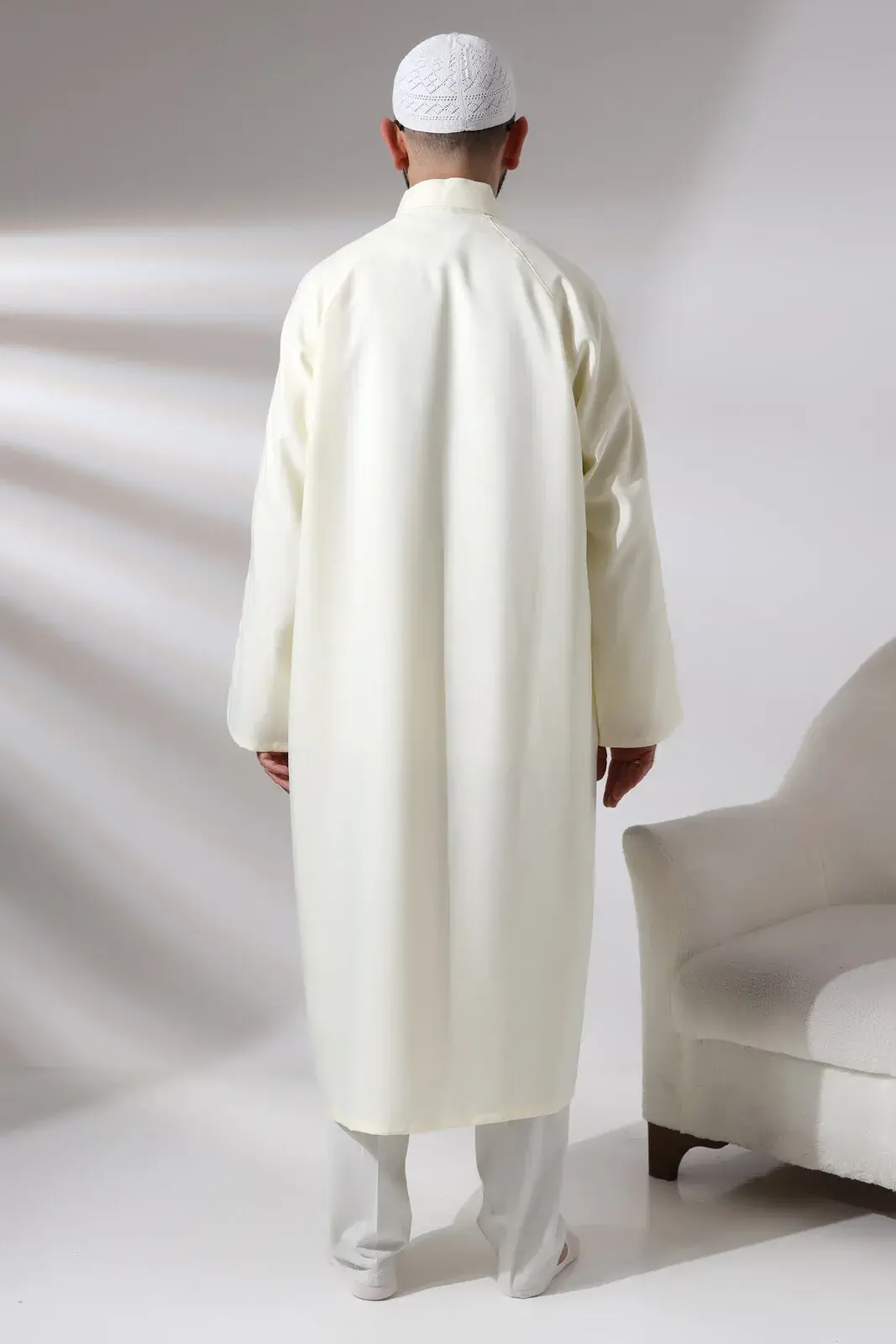 Bu namaz cübbesi, önden kapatmalı çıtçıtlı tasarımı ve hakim yaka detayıyla öne çıkıyor. Alpaka pamuk polyester karışım kumaşı, tülermez ve kırışmaz yapıda olduğu için kullanıcısına rahat bir giyim deneyimi sunuyor.