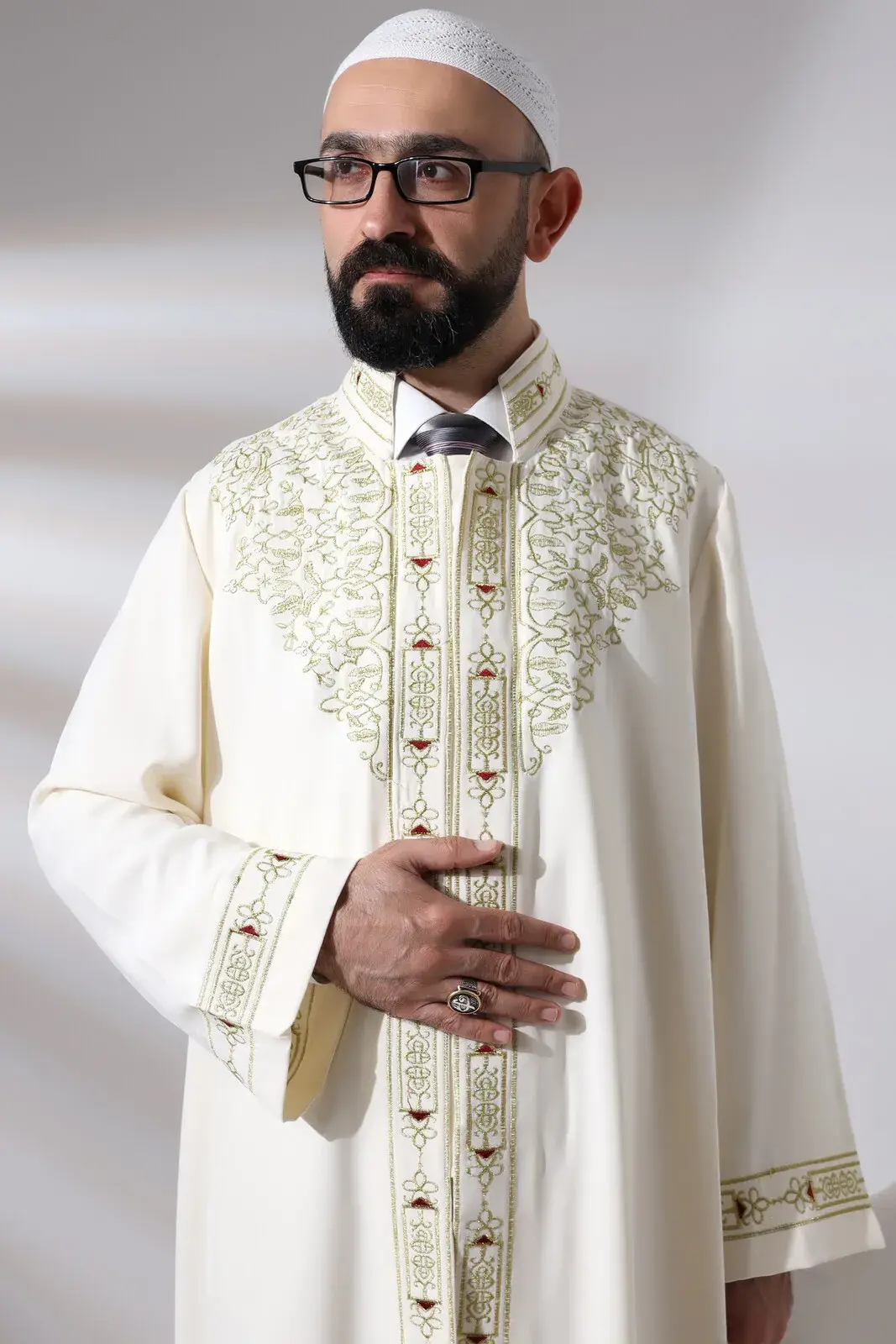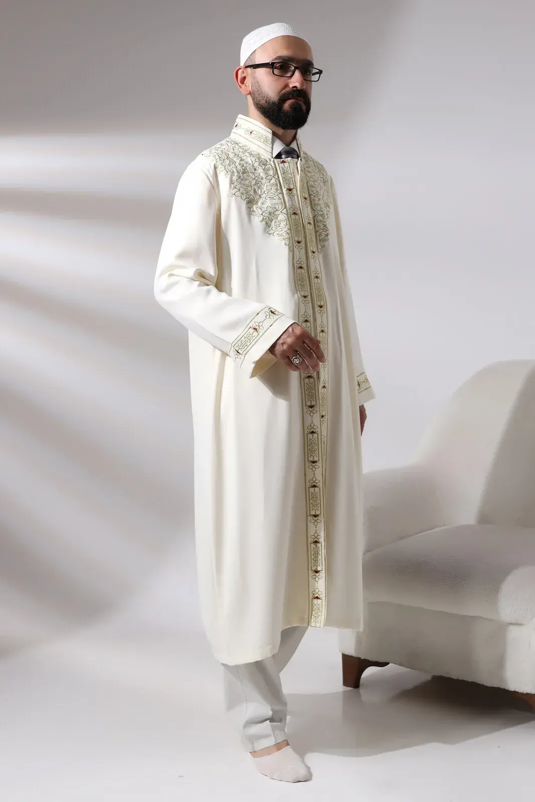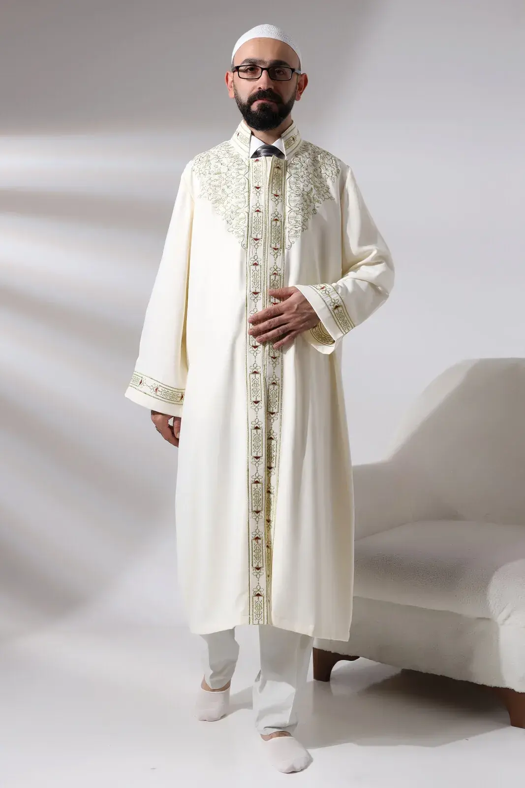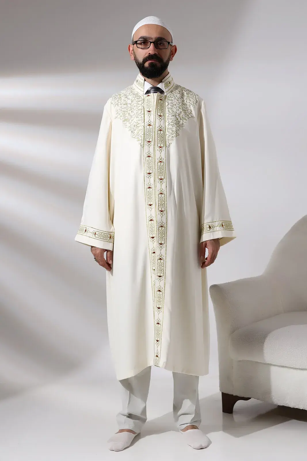 Krem Erkek Namaz Elbisesi Hakim Yaka Nakış İşlemeli İmam Cübbesi